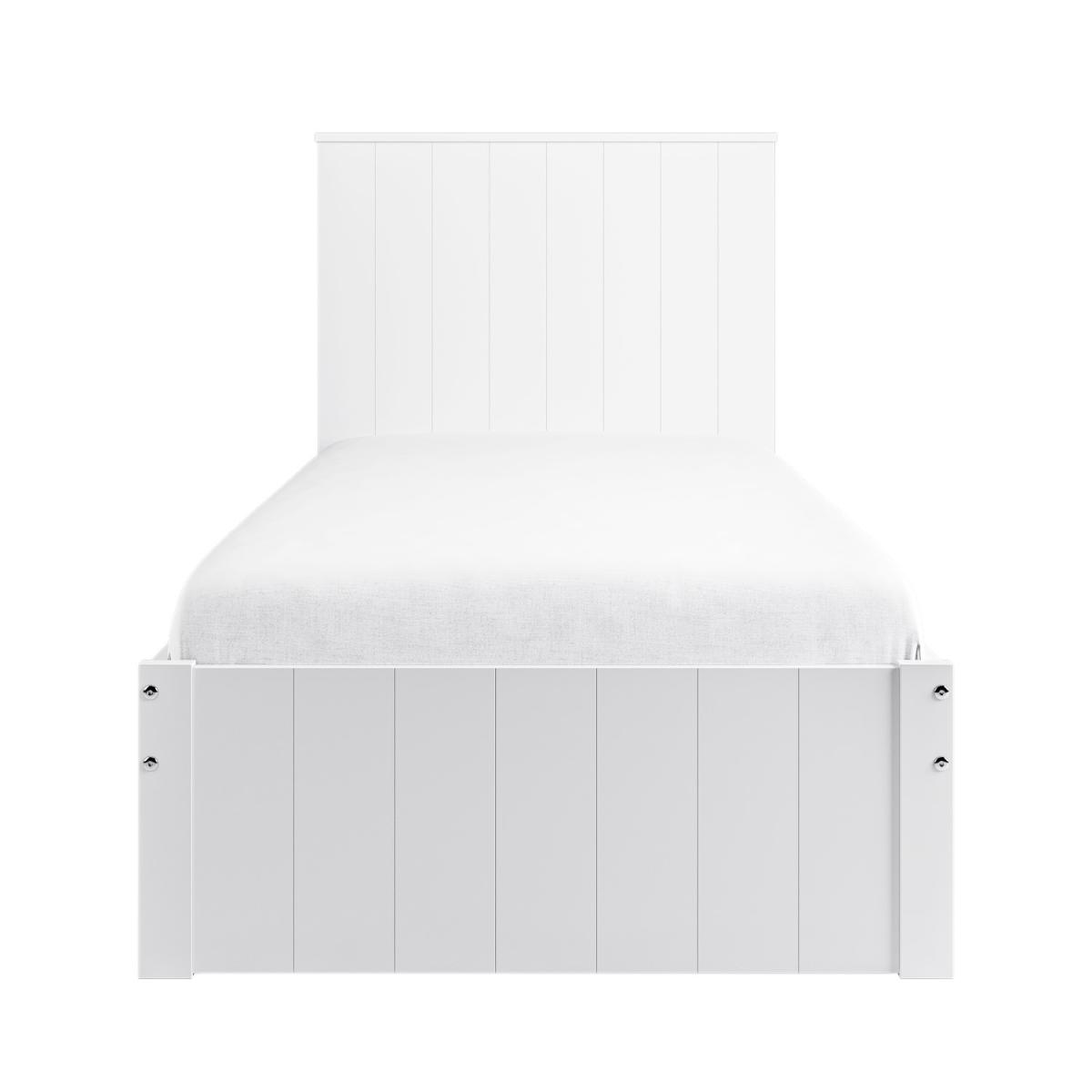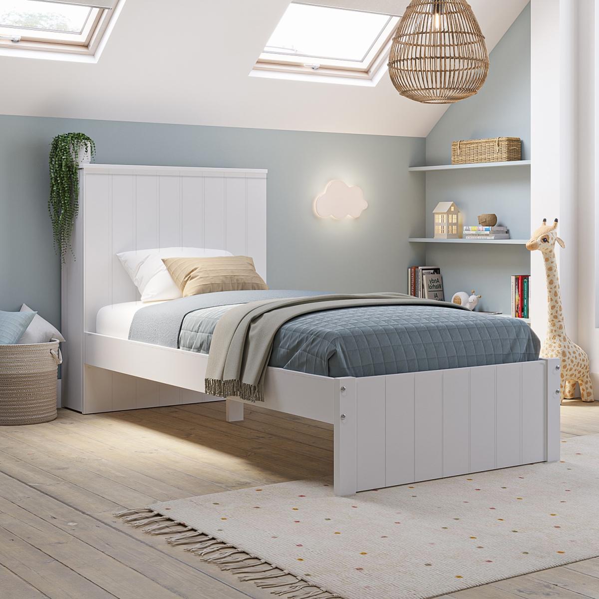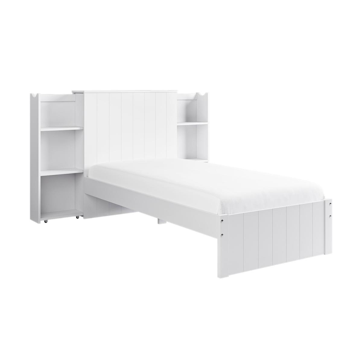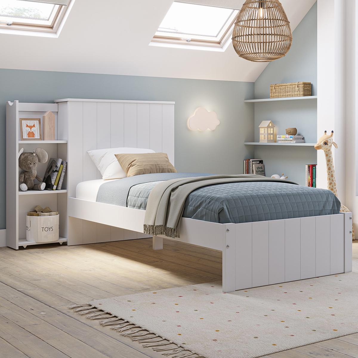 All about me Our Pery single bed with hidden pull-out storage units is the perfect solution for those who yearn for floor space in an instant. It's ideal for a kid's bedroom to grow with due to its timeless wooden design. It features a bookshelf within each side so children can tidy up copious amounts of books effortlessly. Plus, the headboard shelf storage allows them to display their own personal touch. Need to know Product (with shelves pushed in):W96.5 x D218 x H110 cm Product (with shelves pulled out): W179.5 x D218 x H110 cm Each cabinet dimensions (x2):W43 x D20 x H107.55 cm Product weight: 60.7kg Bed mattress size: Standard UK Single (3ft / 90 x 190cm) Colour: White Finish: Painted Material: Solid pine wood and MDF Bed base: Sprung-slatted Assembly required: Yes Mattress included: No Packaging dimensions: Box 1: W103.5 x D122.5 x H6 cm / Box 2: W44.4 x D194.8 x H7.9 cm Packaging weights: Box 1: 27.5kg / Box 2: 33.2kg