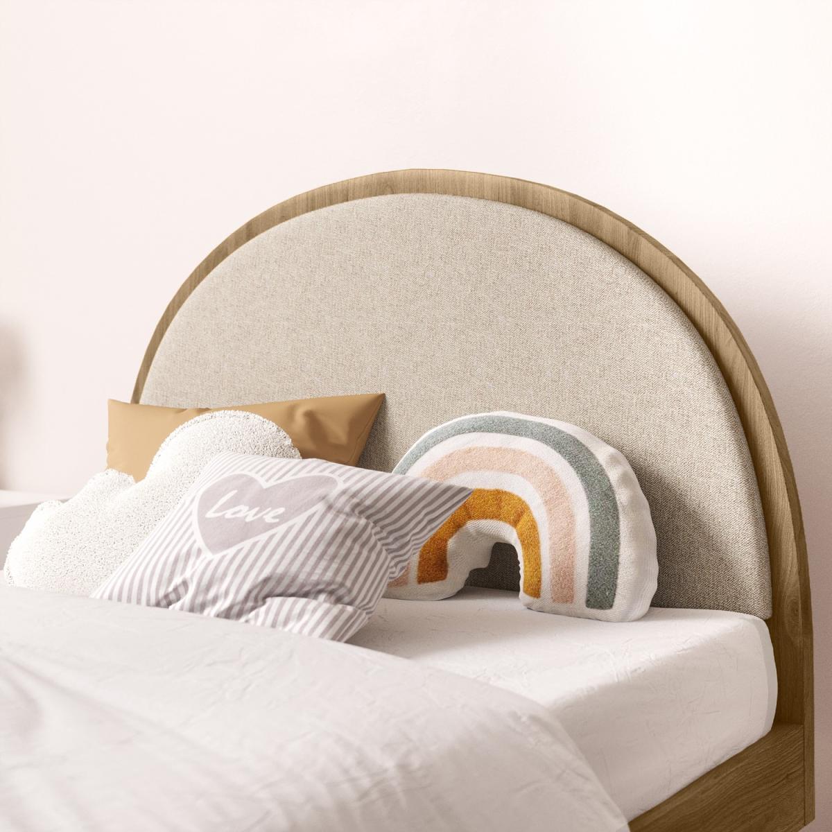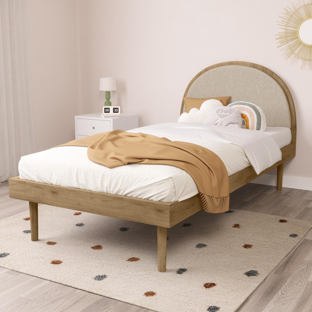 All about me The Cara bed is perfect for any kids' bedroom. With a stunning mango wood finish, the simple design effortlessly complements any modern or retro interior. The sturdy tapered legs are crafted from solid wood. Choose your perfect mattress from our popular package deals. Need to know Dimensions:W100 x D198 x H97 cm Weight: 34.47 kg Mattress size: Standard UK single (90 x 190 cm/3ft) Mattress included: No Max supported weight: 122 kg Colour: Beige and wood Finish: Upholstered and premium woodgrain foil base and headboard Material: Linen fabric, MDF and solid mango wood Assembly required: Yes Packaging dimensions (2 boxes):W206 x D31 x H14.5 cm, W116 x D81 x H8 cm