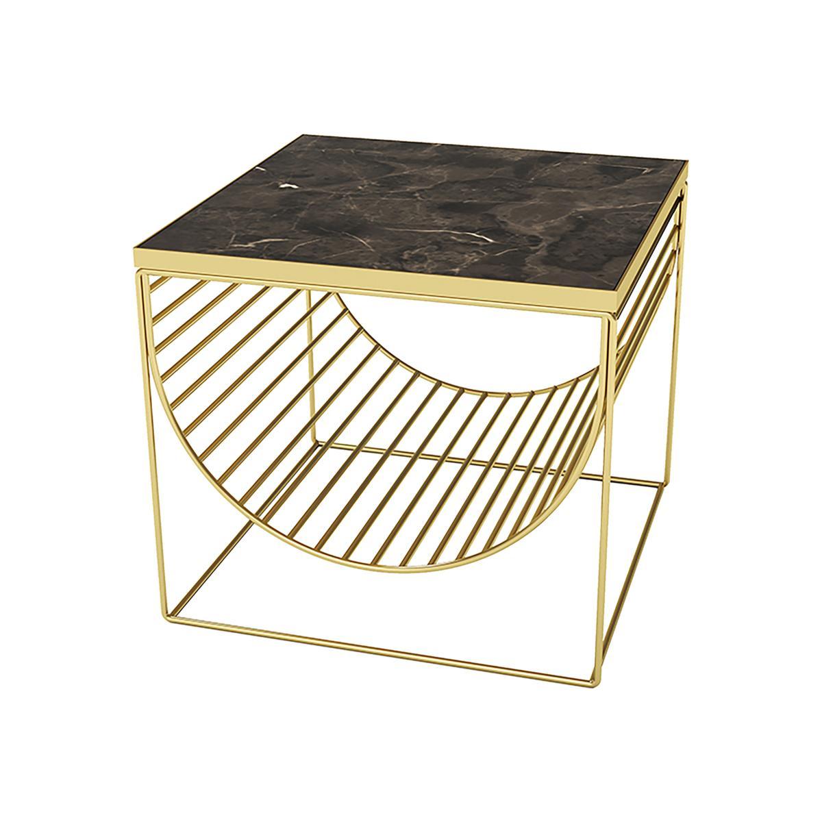 A flavourful combination of square lines and curves for this practical coffee table which includes a magazine holder. The metal strands form a wave which elegantly occupies the space. This openwork and ethereal structure serves as a magazine holder for your magazines and books. The very refined marble top strengthens the sophisticated and timeless aspect of this small table. Sino fits in anywhere: sofa-end, side table or bedside table.