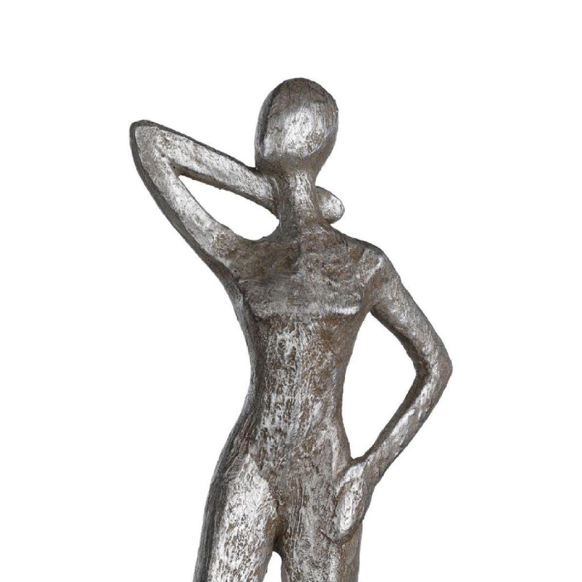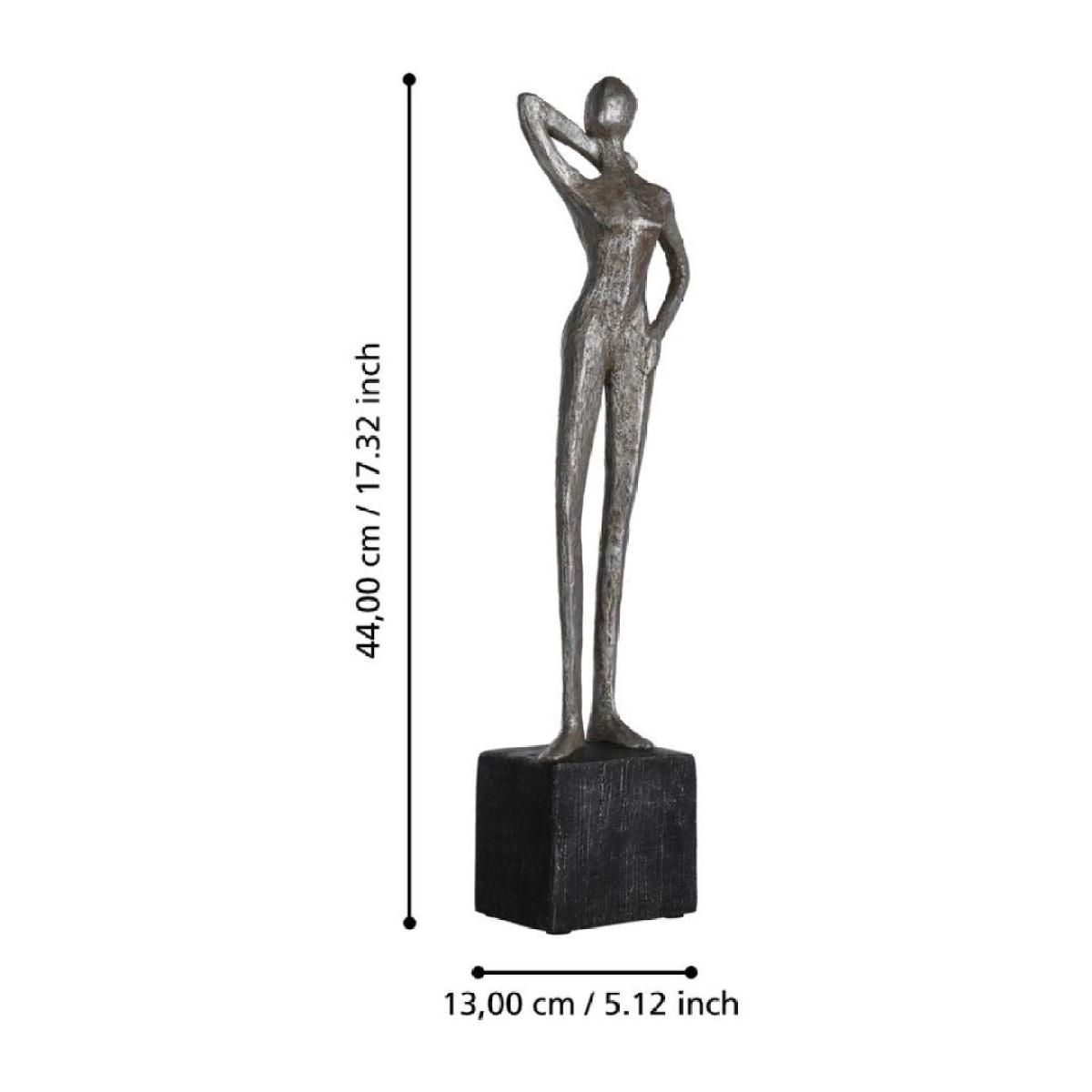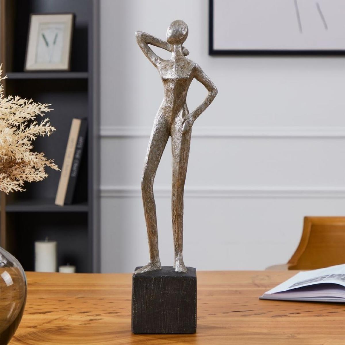 Siocon black and silver ornament. The Siocon ornament is a stylish modern accent piece with a strong sense of form and character. Featuring a sleek, silver-toned minimalist figure striking a confident pose with one hand on the hip and the other resting on the back of the neck, it is mounted on a simple black base for a clean, contemporary look. Perfect for display on shelves, mantels or side tables, this ornament brings an artistic and sculptural touch to any interior.
