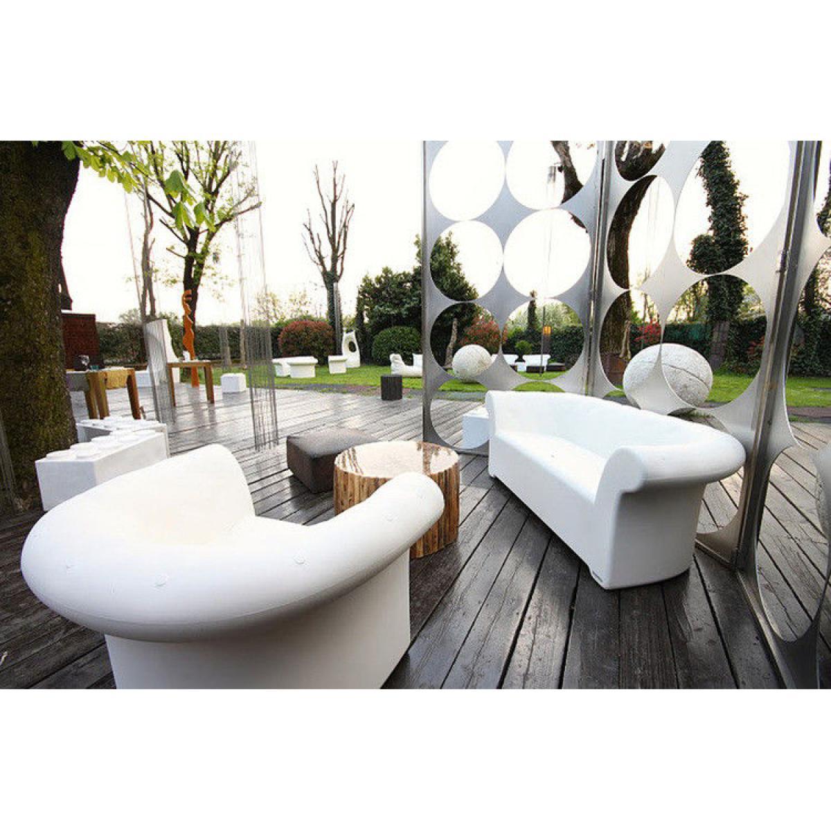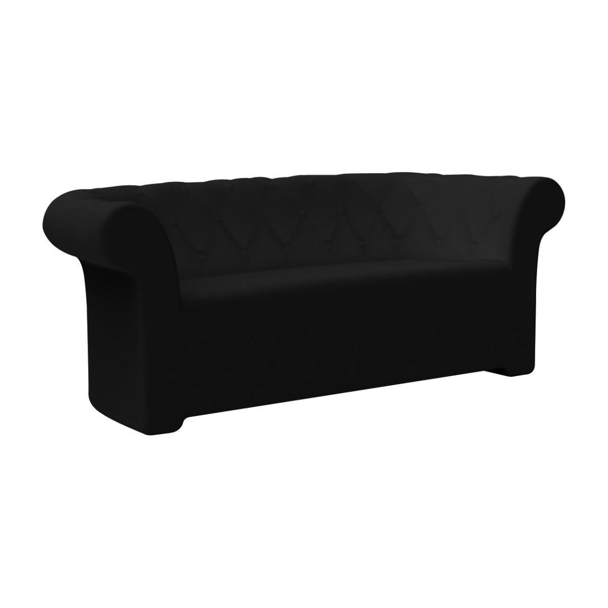 Serralunga's traditional but zany Sirchester outdoor sofa mimics the comfort and style of a classic Chester but adds a wholly unique twist—it is the first sofa that lights up. Like the English Chester sofa, the sofa features a padded quilted backrest. A patented inner drainage system keeps the seat dry, even after a rainfall. Its comfort and revolutionary glow feature make the Sirchester ideal for a public or party setting. It is available in yacht blue, white, black, hide, apple green, and fuchsia.