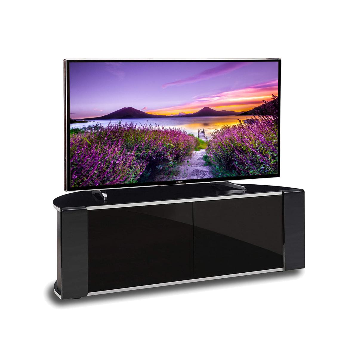 The curved design of the Sirius 1200 TV cabinet flows seamlessly with any interior, being practical without the bulk of a large traditional cabinet. The C shape profile allows perfect positioning for corners as well. The Sirius 1200 also features interchangeable walnut and oak trims to suit every taste. The Sirius 1200 TV stand was designed to hold LED, LCD, Plasma and OLED flat screen TVs up to 55". It also has space for home cinema systems, blu-ray player, Sky/Virgin/BT receivers, digital boxes and games consoles. Combining safety with style, the Sirius 1200 TV cabinet has toughened safety glass shelves (BS6206. A) to relevant British standards. It also comes with the revolutionary Beam Thru Remote Friendly system to allow remote control signals to pass through the glass and operate your equipment with ease. The Sirius 1200 cabinet comes complete with a Cable Management to hide unsightly wires at the rear and clear and concise manual for easy self-assembly. Dimensions: Width: 120cm x Depth: 51cm x Height: 44cm / Adjustable Shelf Spacing.