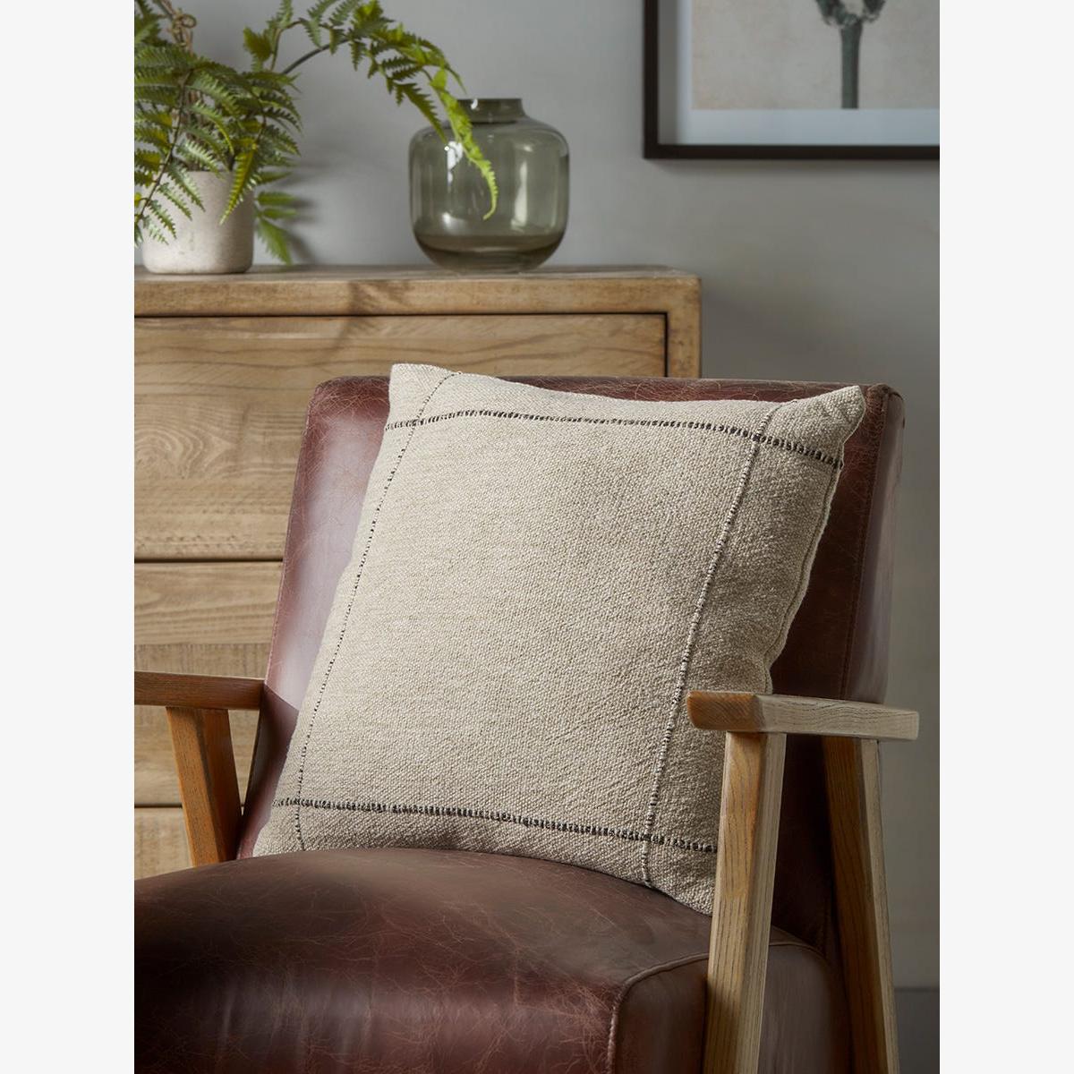 I love this cushion for its understated versatility and subtle texture, making it a great addition to both modern and traditional interiors. Its neutral tone allows it to blend seamlessly with different colour schemes, while the coarse linen-like fabric adds a touch of tactile interest without overwhelming the space. It works particularly well paired with leather or woven upholstery, offering comfort and style in living rooms, bedrooms, or even cosy reading nooks. For practical styling, try layering it with complementary cushions of varying sizes and textures, or use it to soften sharp furniture edges. Its simple yet refined look makes it an easy, low-maintenance choice that elevates the overall aesthetic of a space.