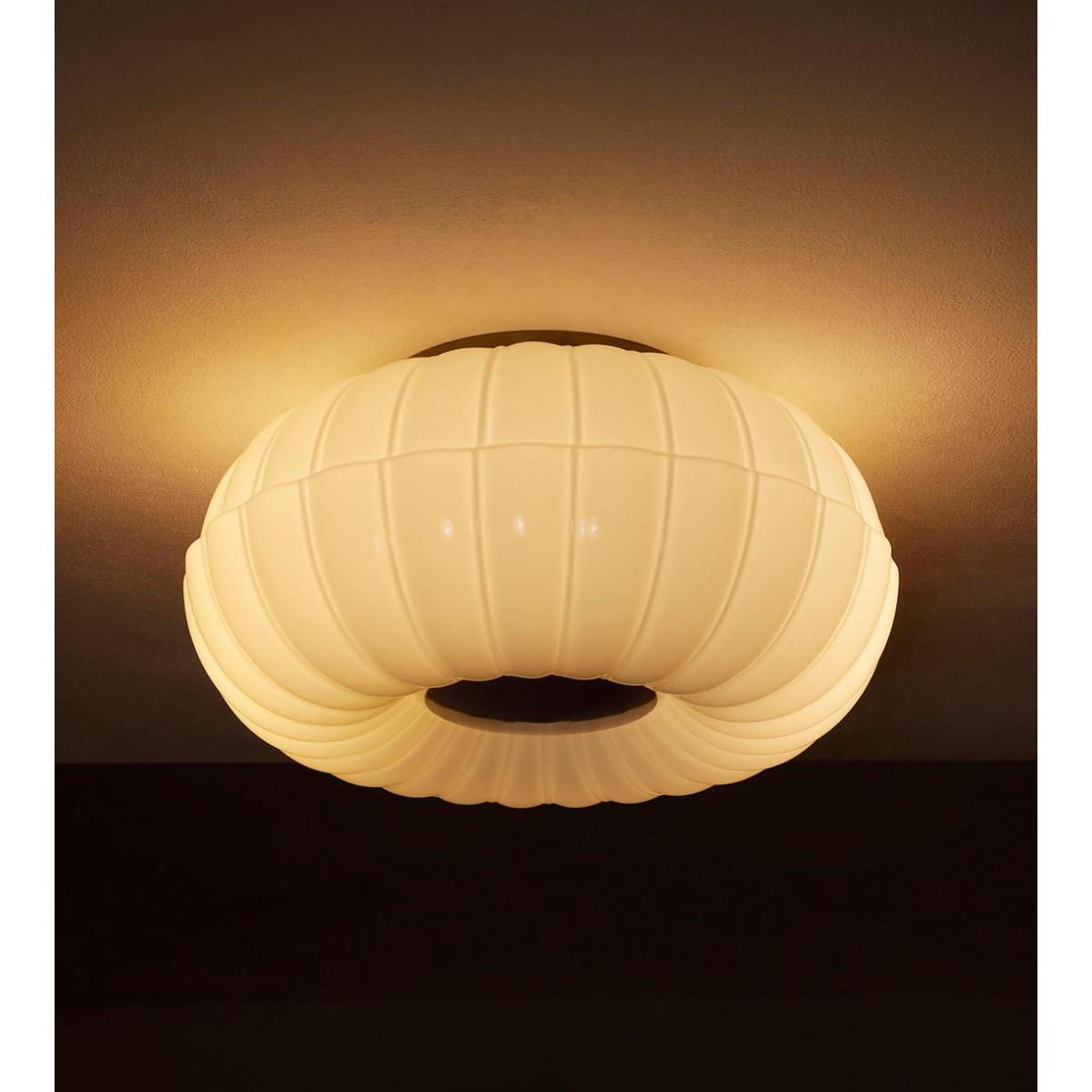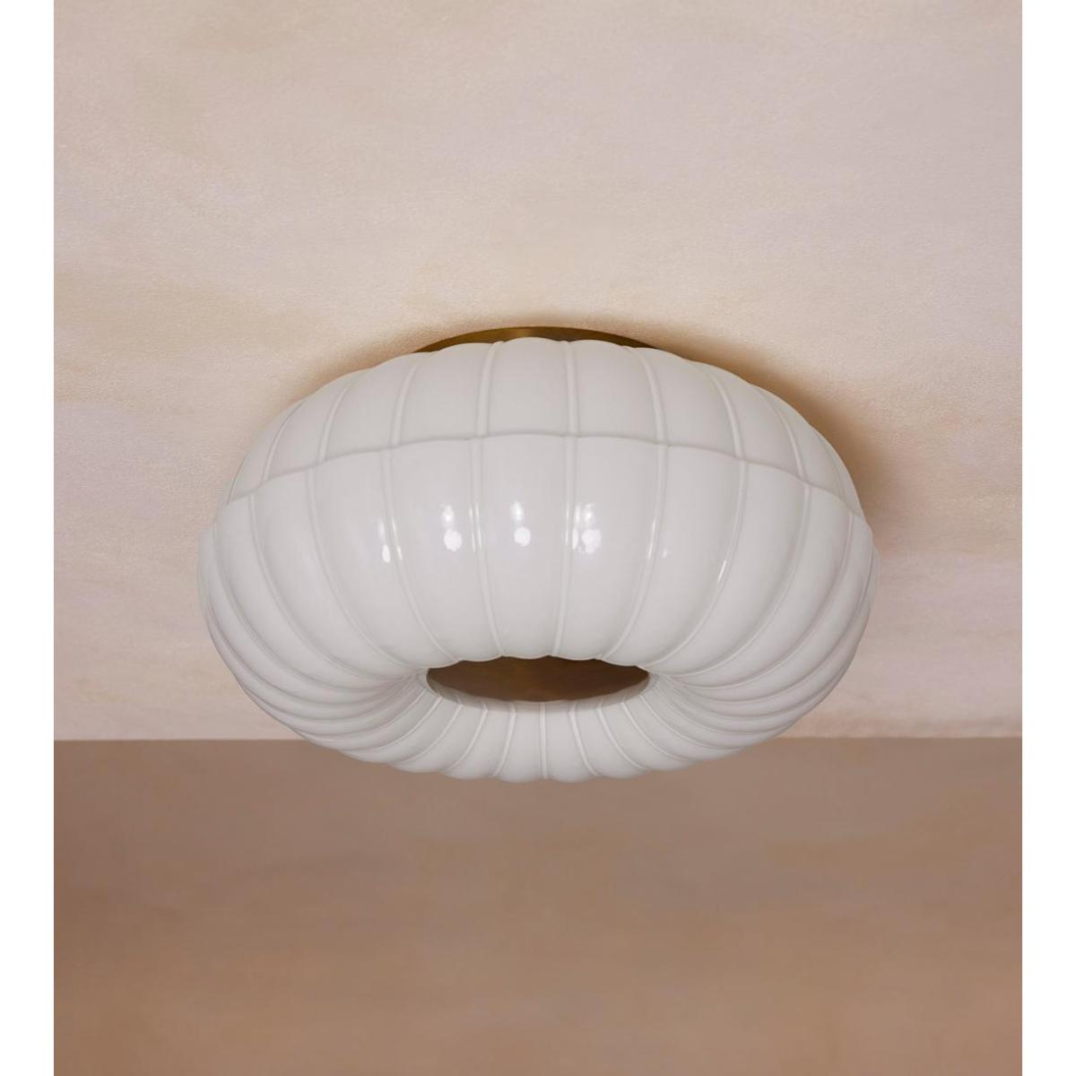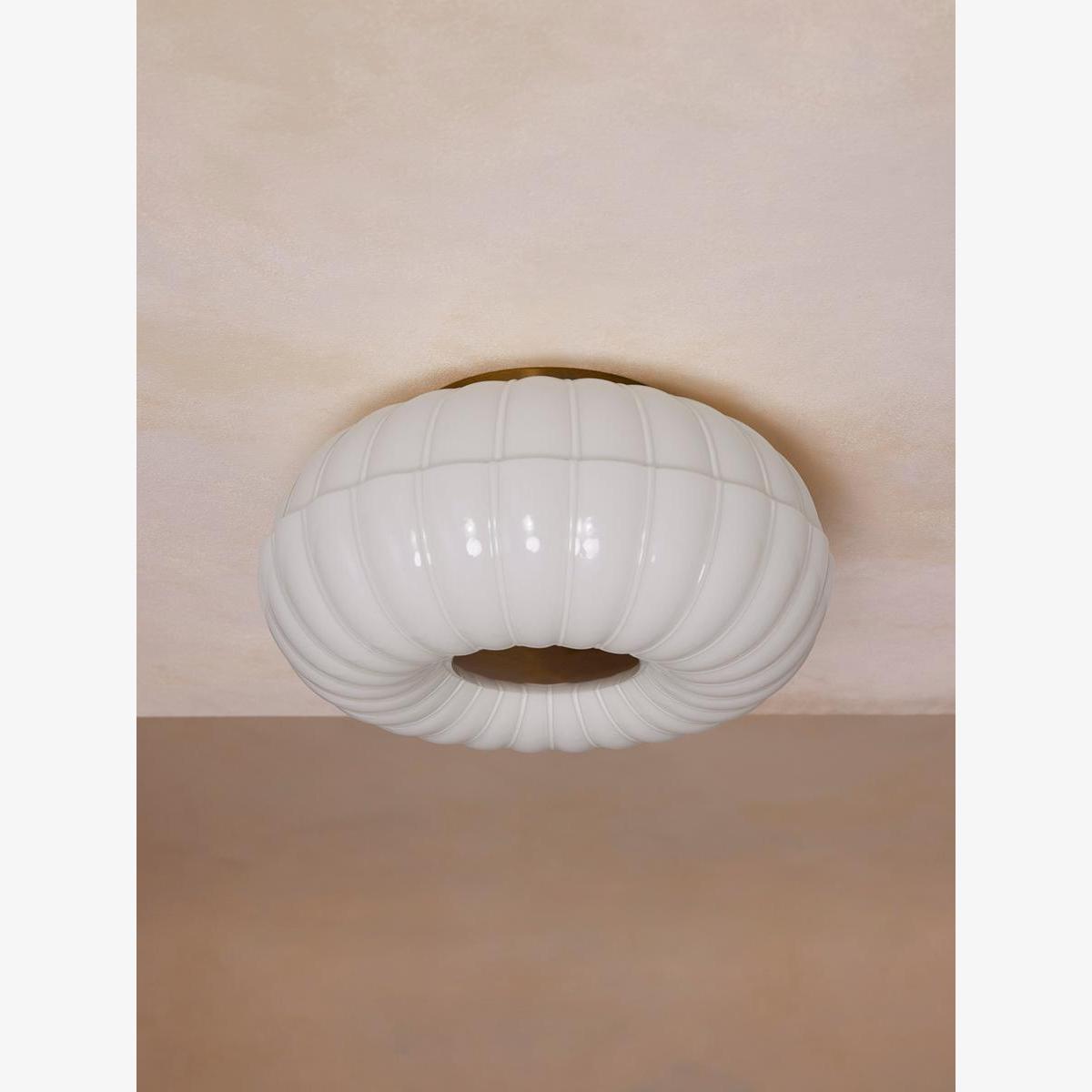 Reeded detailing radiates out from a central brass disc to give this light's domed shade a scalloped edge. Mirroring the various lighting styles seen in Soho House Copenhagen, the Sirrel flush light has a circular, domed shade crafted from glass with a milky, frosted finish. The moulded diffuser is characterised by reeded detailing that creates an almost scalloped pattern around its edge.