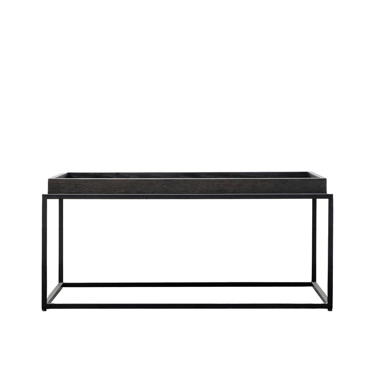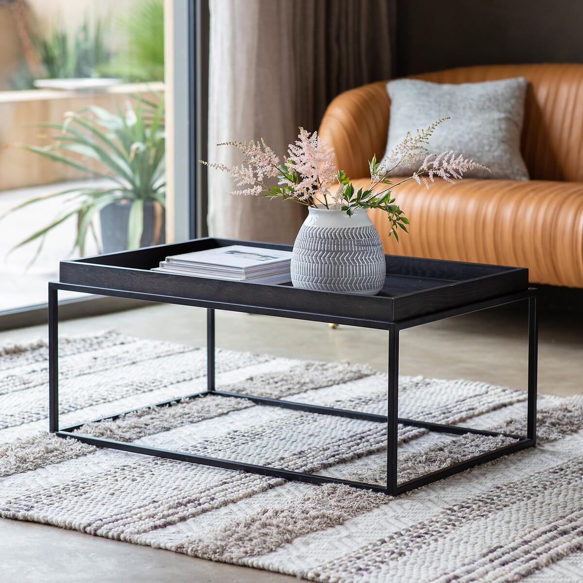 I love how this tray coffee table pairs a slim black metal frame with a raised edge - perfect for keeping magazines and mugs in place. Its simple silhouette works equally well in industrial, Scandinavian or contemporary loft-style interiors, especially when teamed with a leather sofa and textured rug. For styling, try stacking two art books in one corner, placing a low ceramic vase of greenery beside a small tray of candles and letting the open base keep the look light and uncluttered.
