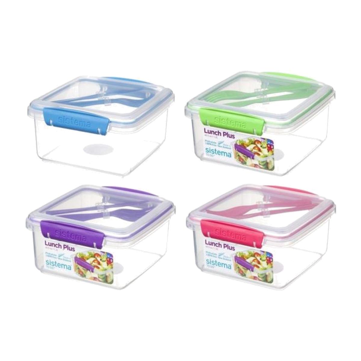 The Sistema lunch box and cutlery set. Pretty coloured clips available in pink, blue, green and purple. Dishwasher Safe (Top rack only) Microwave Safe (Without lid) Fridge and Freezer Safe Capacity: 1200 ml Dimensions: 15 x 15.5 x 8cm Material: 100% polypropylene Only one supplied in your choice of colour: either pink, purple, blue or green All screens vary in colour reproduction and whilst every effort has been made to display the colour as accurately as possible it is for guidance only.