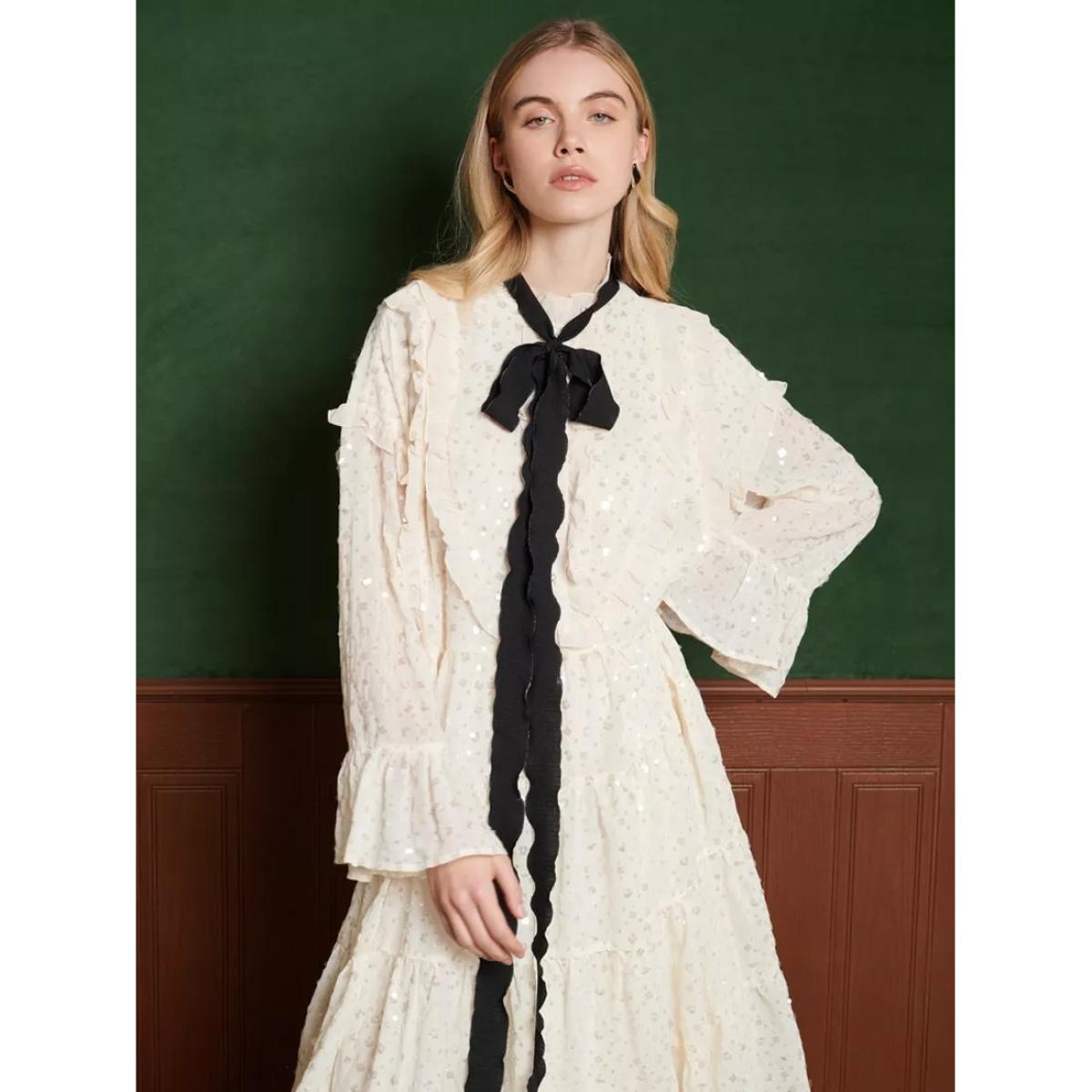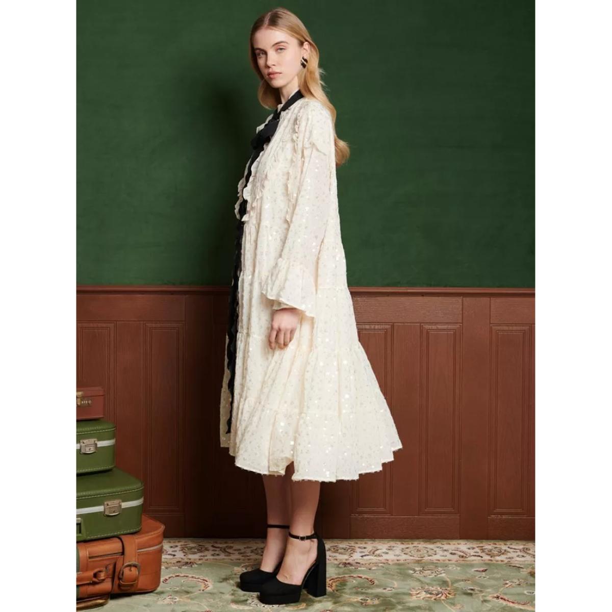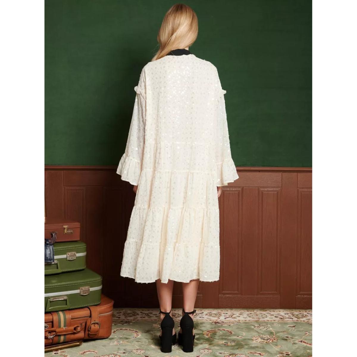 A masterclass in simplicity, this loose fit midi dress from Sister Jane is made in a sequin embellished chiffon fabric. Designed with long sleeves, it's detailed with an adjustable ruffle edged necktie.