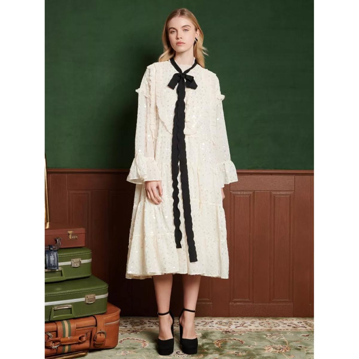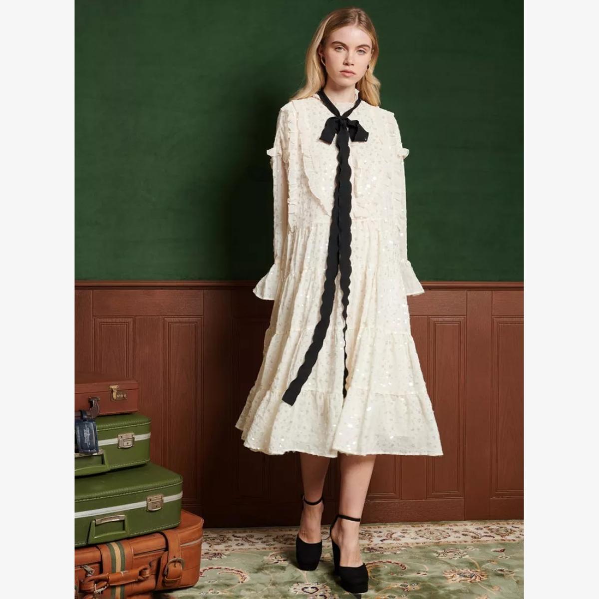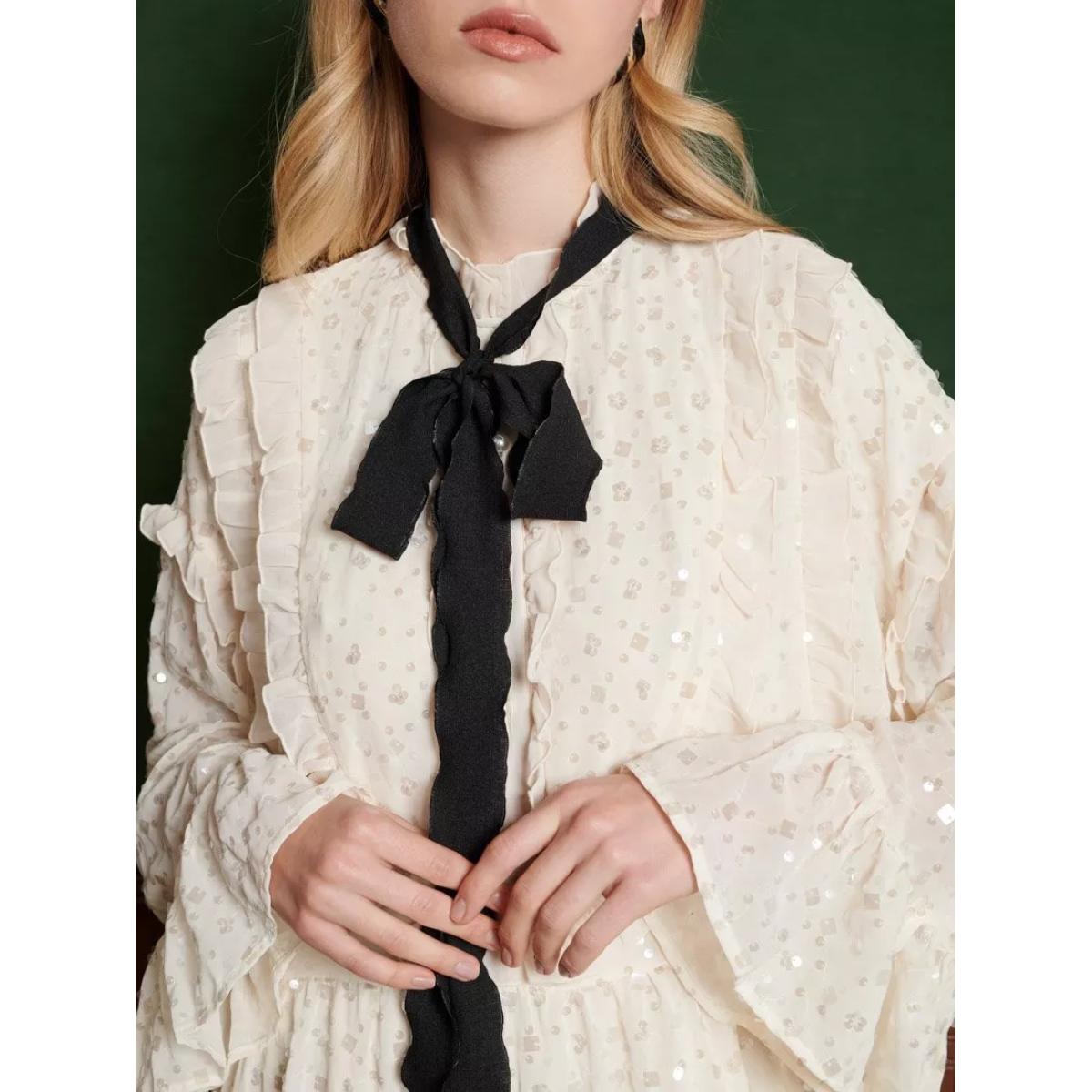 A masterclass in simplicity, this loose fit midi dress from Sister Jane is made in a sequin embellished chiffon fabric. Designed with long sleeves, it's detailed with an adjustable ruffle edged necktie.