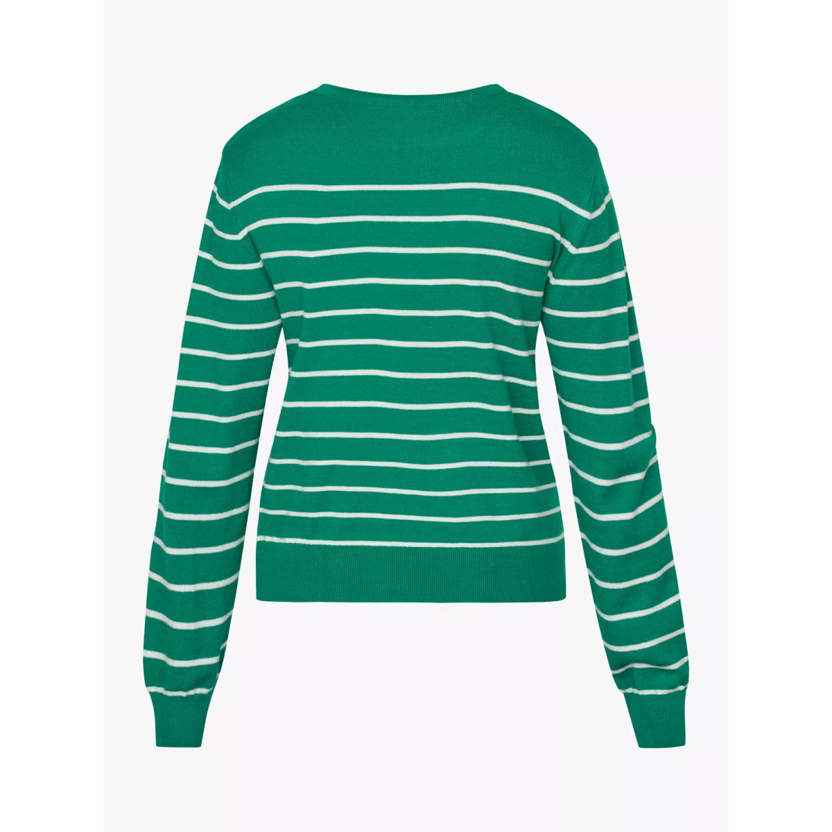Maldi is a knitted blouse with thin stripes. The blouse has a round neck, three quaters sleeves and rib edges.