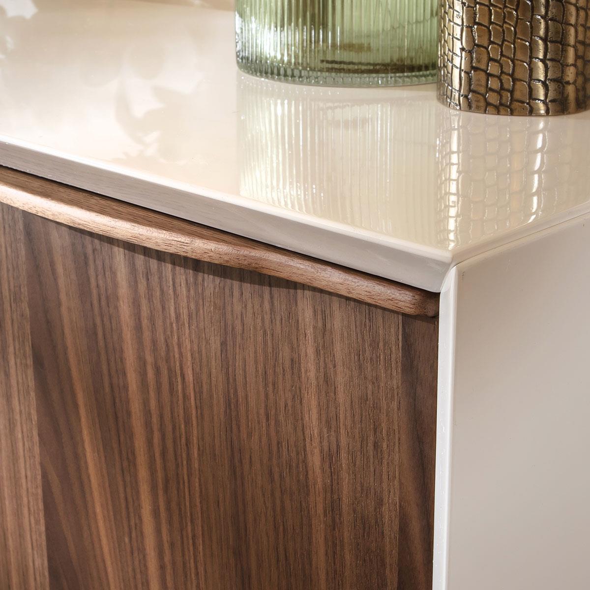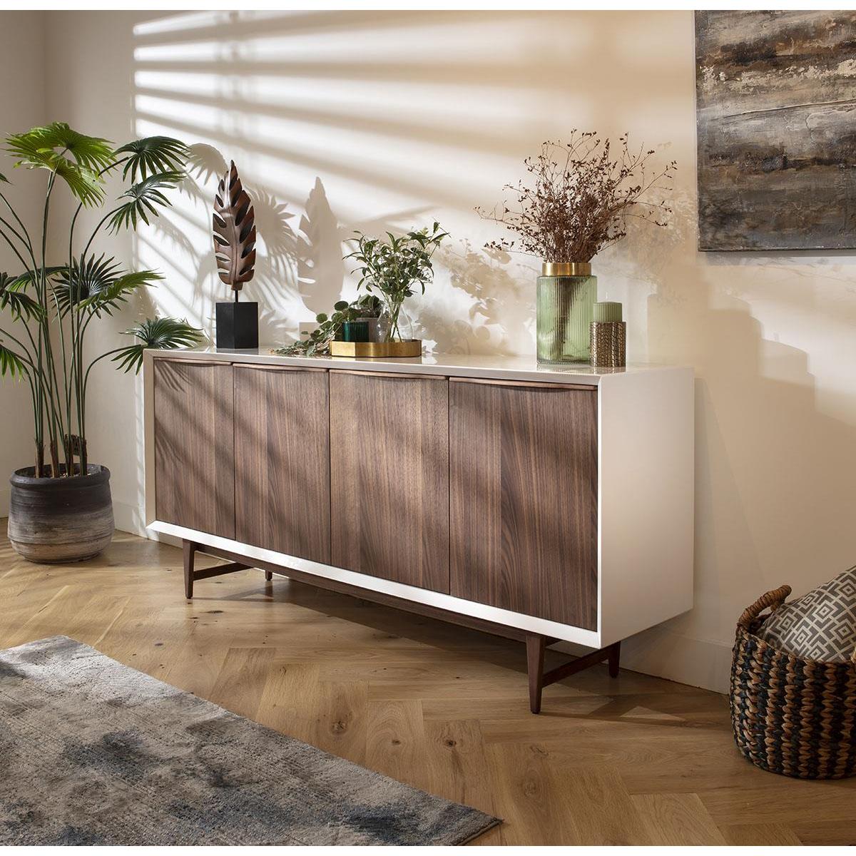 Upgrade your living space with our large gloss white sideboard. This modern sideboard features a sleek, white high gloss body and matte walnut wood veneer doors. Equipped with 4 doors, premium finishes, and glass shelves, this mid century sideboard is perfect is a buffet cabinet for contemporary homes. Our Sito 4 door sideboard boasts a sleek and simple design that fits perfectly in modern homes. The preassembled body means minimal assemblyjust attach the solid wood legs. With its very modern aesthetic, this sideboard effortlessly combines functionality and style, making it a versatile addition to any room. The white high gloss body of this sideboard exudes elegance and contemporary charm, while the matte walnut wood veneer doors with solid wood handles add a touch of warmth. These premium finishes ensure a durable and stylish piece that stands out as a luxury white gloss sideboard, perfect for any interior decor. Inside the cupboards, you'll find glass shelves that provide ample storage space, perfect for organising your essentials. The solid wood legs not only offer robust support but also elevate the sideboard to a convenient height, enhancing its functionality as a buffet or cabinet. This mid century sideboard is designed for both practicality and beauty. W180cm D40cm H80cm Cupboard W42.5cm D55cm H33cm Pre-assembled - legs to be attached