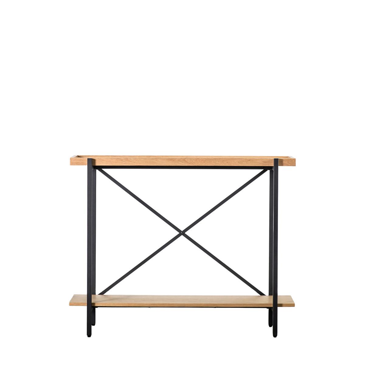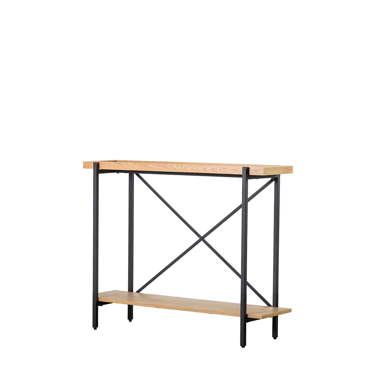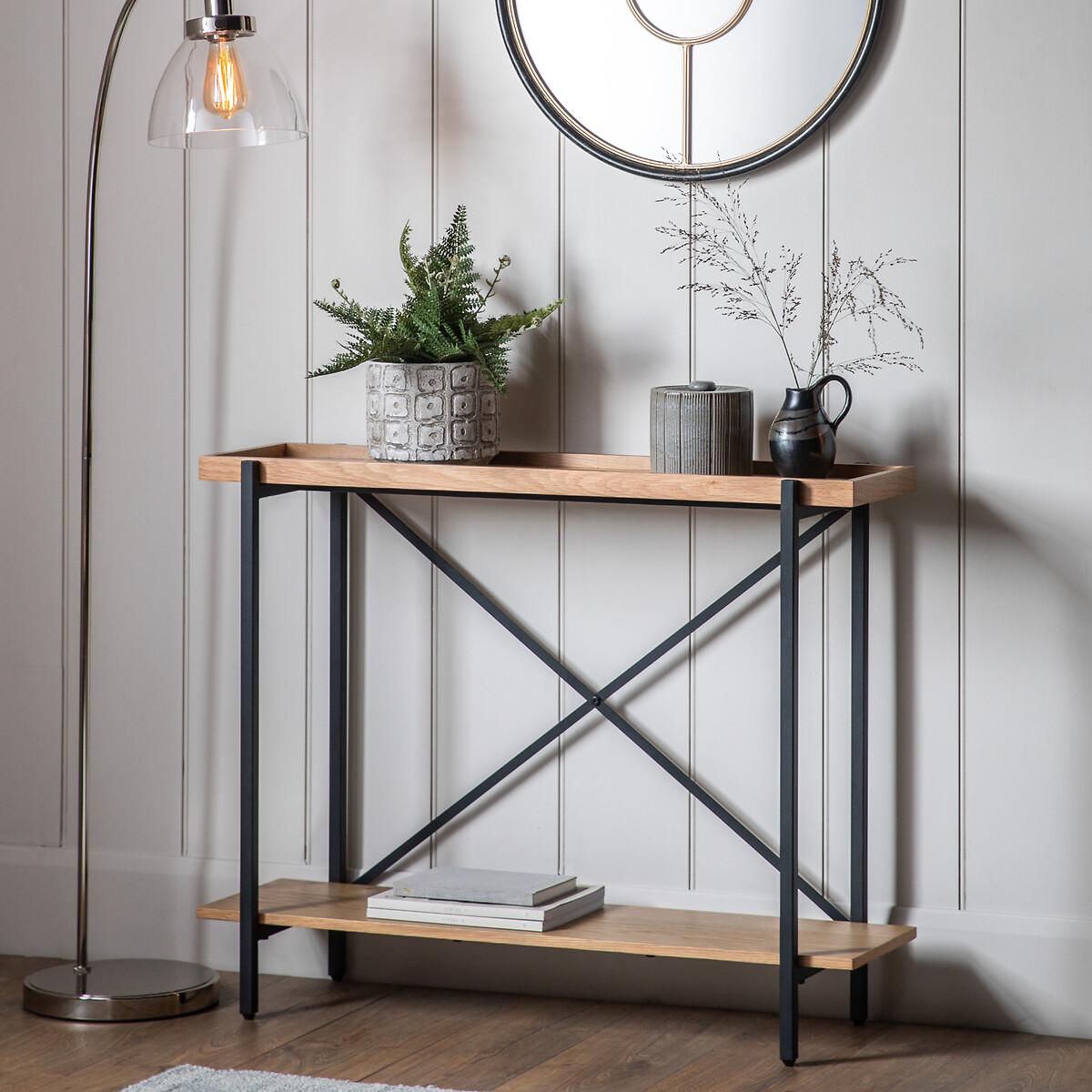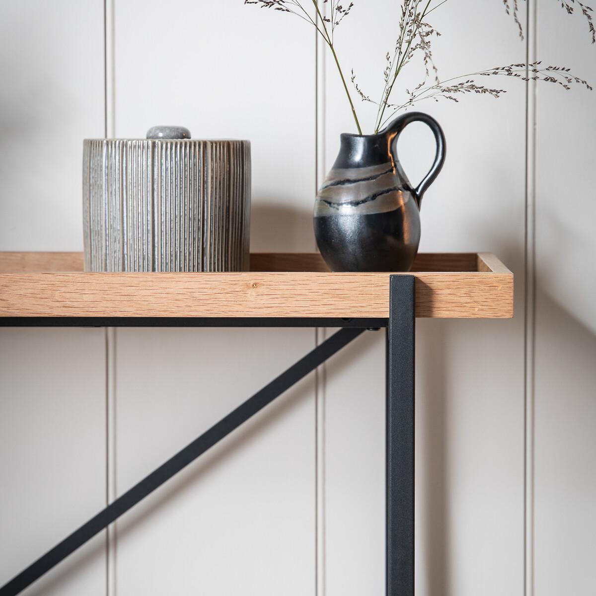 Offering a stunning contemporary look, this side table combines matte black metal with oak. A tray-style style top is crafted from oak veneer and solid oak and stained in a beautiful rich honey colour, sure to add warmth and texture to any hallway. Product Details:• Features tray-style table top• Solid oak and oak veneer table top • Cross shaped metal frame• Assembly required - all tools needed are supplied• 1 year manufacturers warranty. Product Composition - Iron / Oak Veneer Product Dimensions - 36 cm x 106 cm x 14 cm, Weight 13.5 kg. Package Dimensions - 106 cm x 36 cm x 14 cm, Weight 13.5 kg. This product will be dispatched by one of our trusted suppliers. You’ll be contacted by their selected courier about your delivery. Please note: this product cannot be delivered to all Offshore Islands, Northern Ireland or Republic of Ireland.