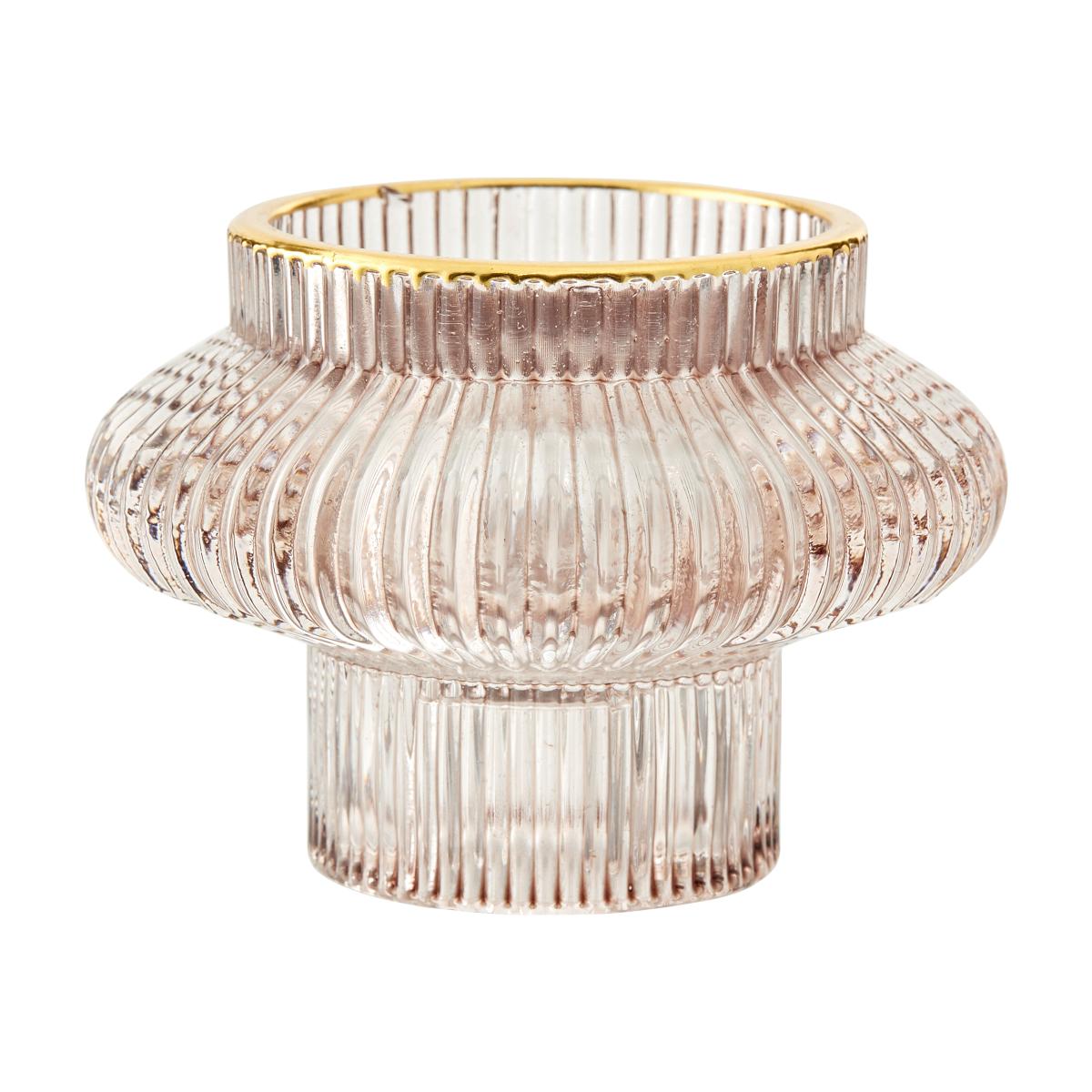 Sivia tealight holder 6. 5 cm from Danish brand Lene Bjerre is made of glass and has a soft design with a ribbed texture and golden rim for an exclusive feel. The smart candle holder can be turned upside down and used for both tall candles and tealights. Why not combine candlesticks in different sizes and colours in a cluster for a cosy and atmosphere in the room.