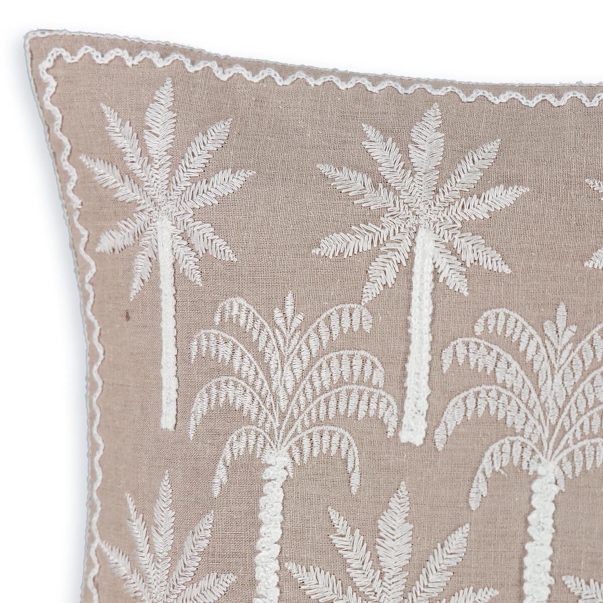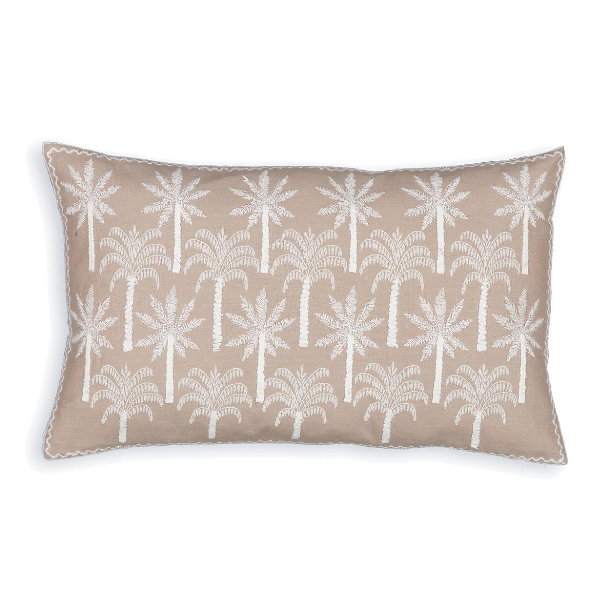 A traditional pattern of palm fronds combined with a stylised geometric frieze... our designers were inspired by ancient Egypt for the Siwa embroidered cushion cover. A delicate design. Product Details • 55% linen, 45% cotton • Front: embroidered motifs • Plain on back • Zip fastening • Dimensions • 50 x 30cm • OEKO-TEX® Standard 100. Standard 100 certification by OEKO-TEX® tests textile products for harmful substances via an independent, international label.
