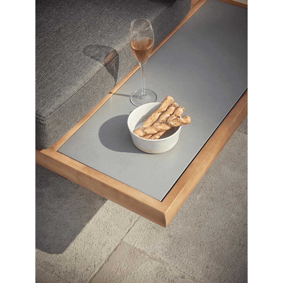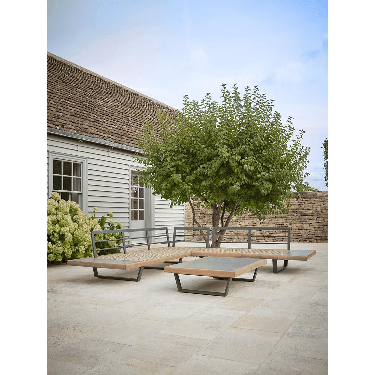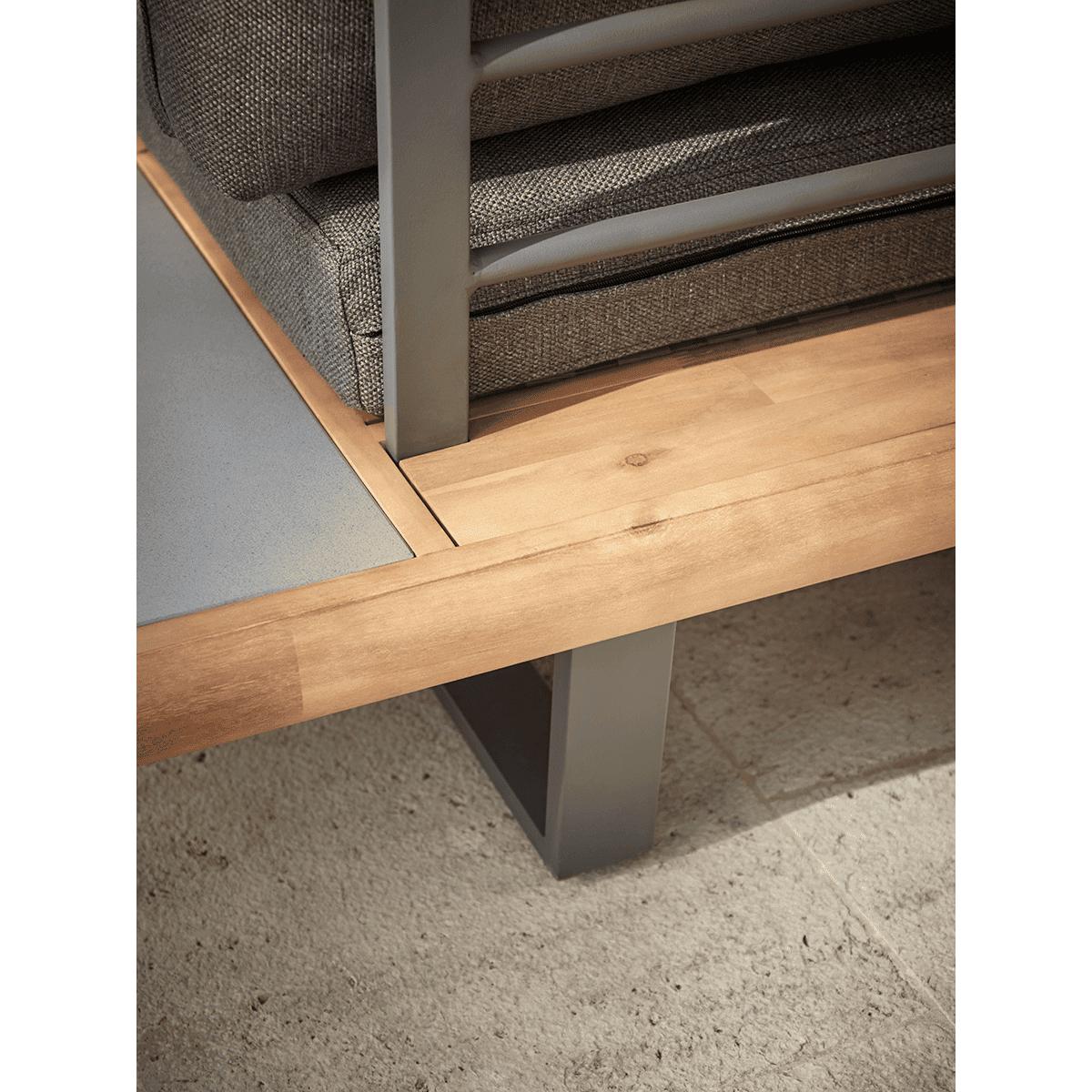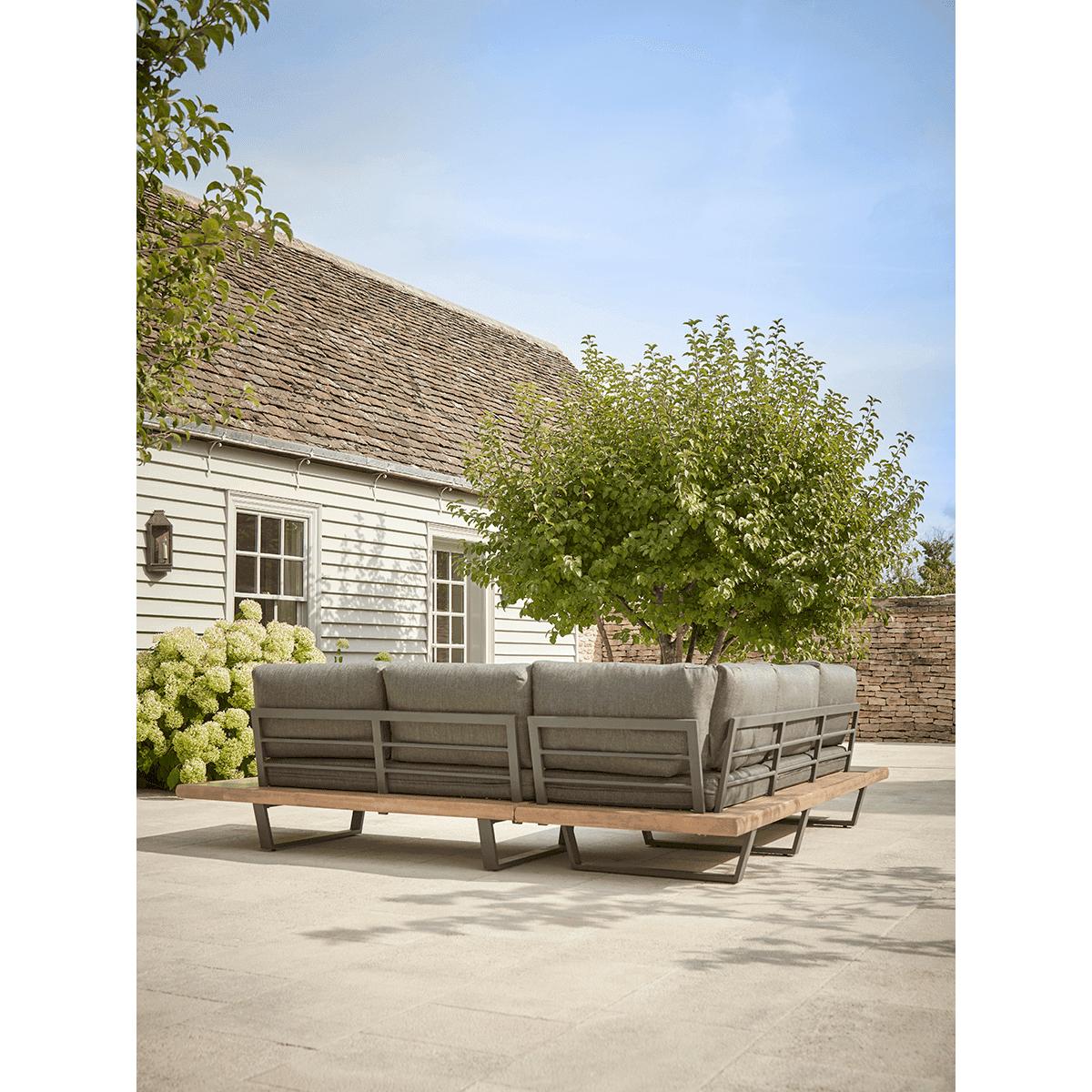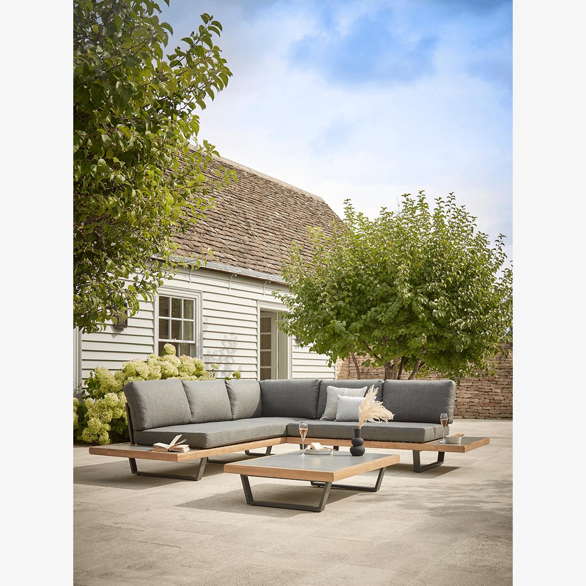 Epitomising the pared-back simplicity of contemporary spaces, our Skagen Corner Set offers a substantial seating option for your garden. The perfect party seating, the set offers integral side tables at each end of the corner sofa as well as a generous low table to accommodate drinks and sharing platters. The powder-coated aluminium frame appears to float on an island of warm-toned acacia wood and the water repellent cushions provide a comfortable place to nestle. The tables have polystone concrete tops for a sleek finish and wide aluminium bases. Browse our useful Outdoor Furniture Buying Guide.