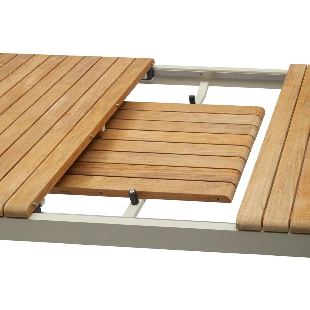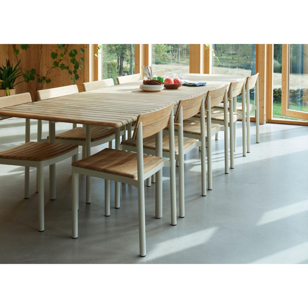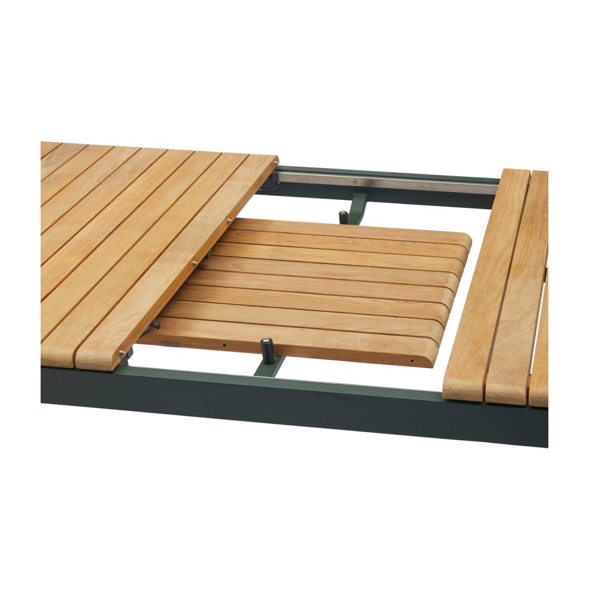 Custom-made for the Pelagus Table, the extension plate can be used in ones or twos to convert the table from a 6 or 8 seater to a 10 or 12. Made of eight teak slats that match the table, it slots simply into the centre of the aluminium frame, when the table top is slid open, enabling people to sit around the ends from all sides. Two extension plates can be stored on the frame underneath the table top when not in use.