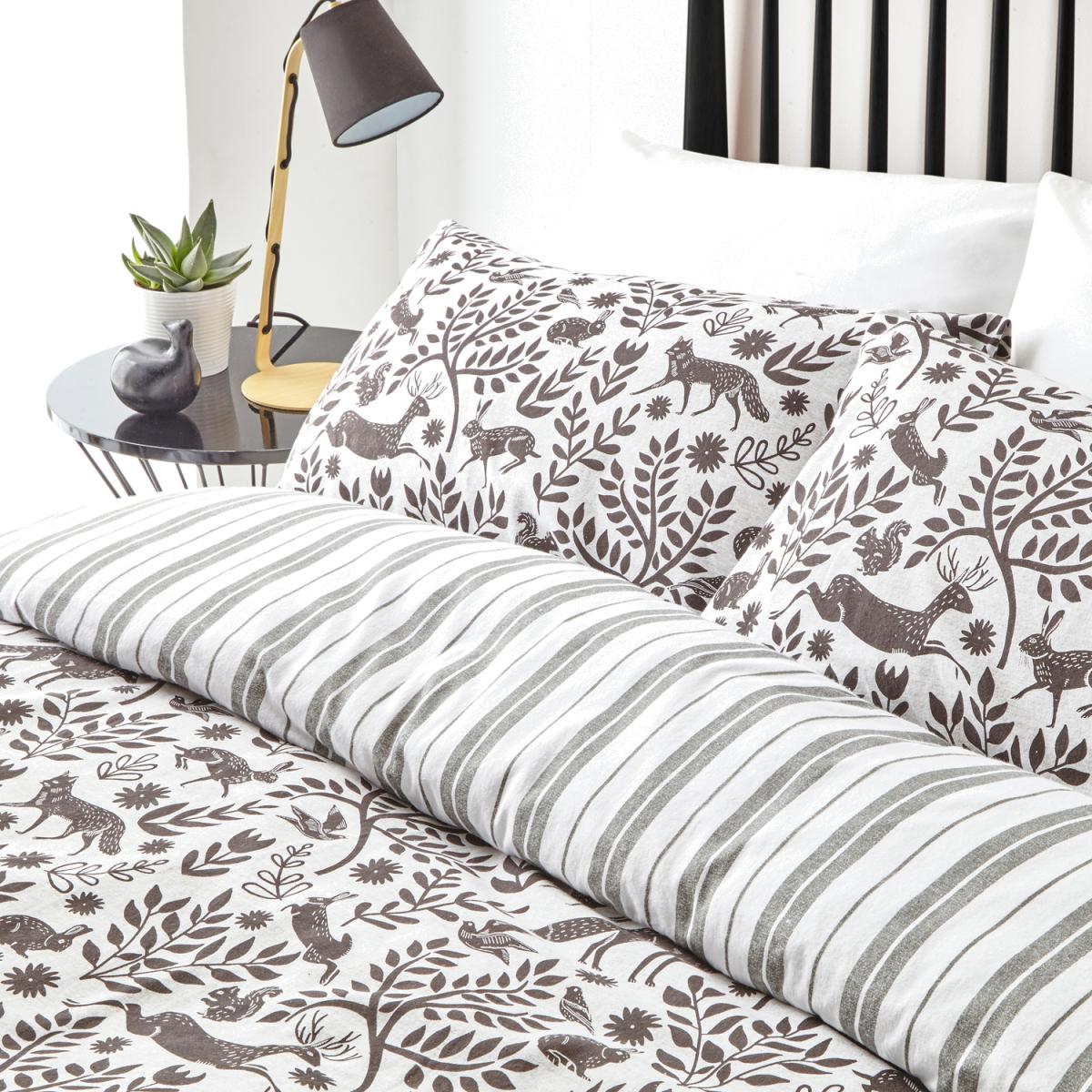Take a trip to the Scandinavian woodland with this duvet set featuring an intricate design of woodland animals from hares to foxes intertwined with branches in a minimal colour scheme. The unique design is complimented with a striped reverse.