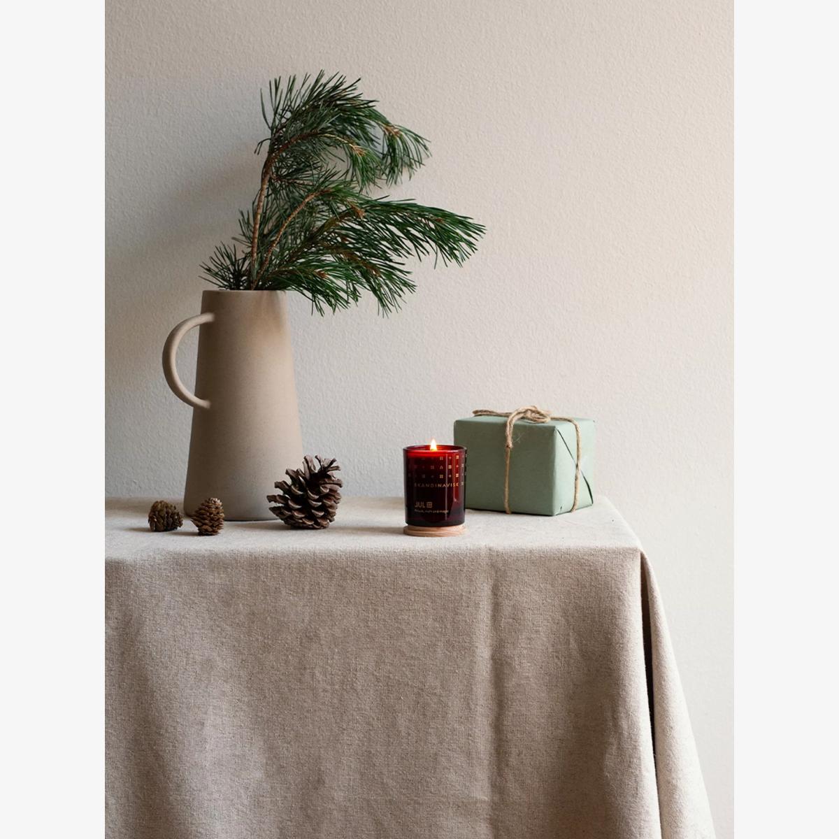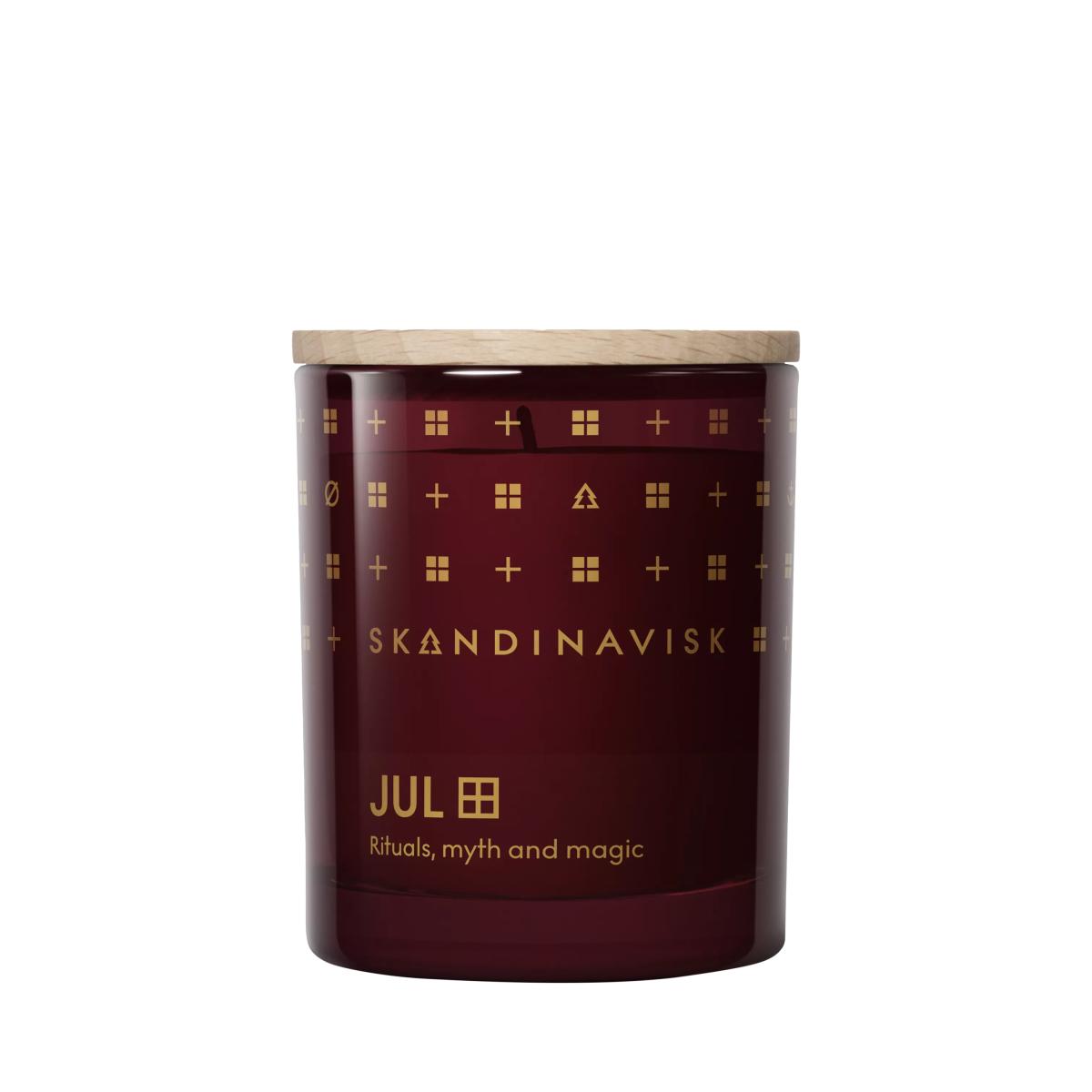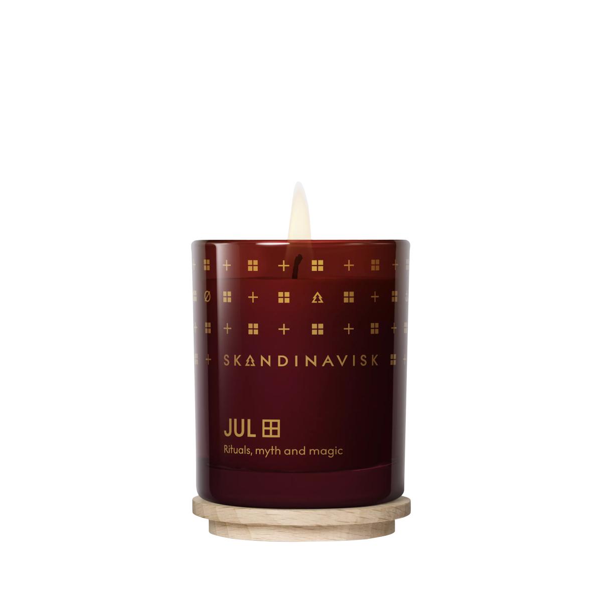 Scent notes: Baked gingerbread and winter cloves, spiced oranges and mulled wine. Special edition scented candle in seasonal design and box. Wax sourced from Swedish rapeseed oil that is non-GMO, and blended to burn stably and slowly. Vegan and cruelty free blend. Poured into a painted glass votive with pure cotton wick and engraved FSC-certified beechwood lid. Packaging card and sleeve from managed Nordic forests with natural colour dyes. JUL - Scandinavian for ‘Christmas’ Glowing windows in the darkness, generations gathered in harmony and tradition, Christmas treats tempting on the hearth.