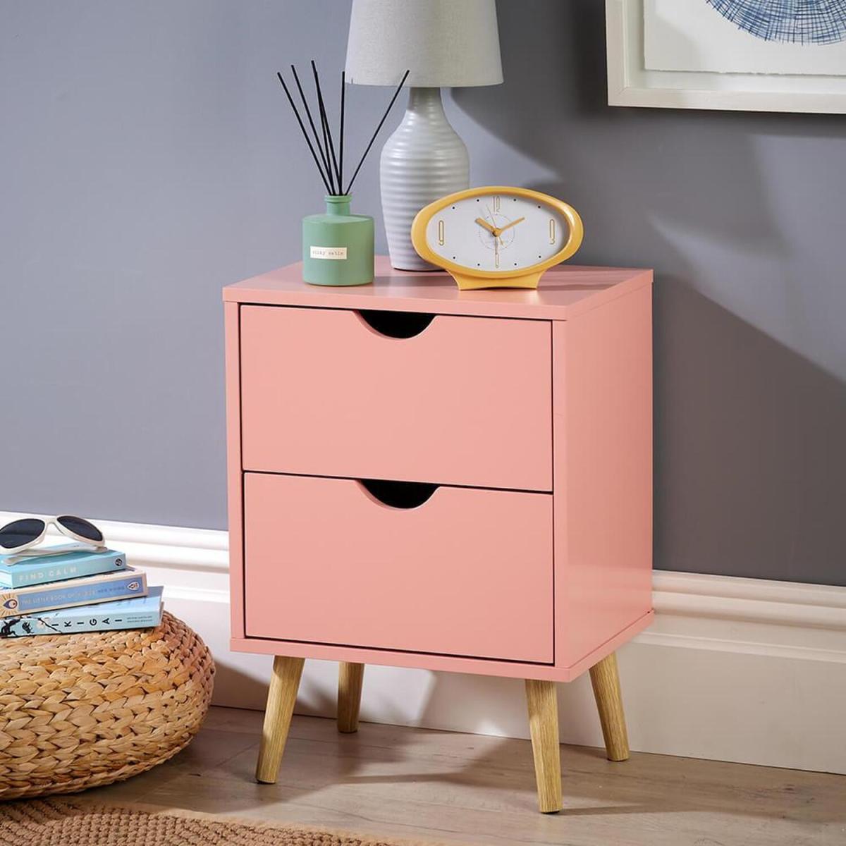 I love the Skara bedside table for its playful yet practical design, making it a versatile addition to various bedroom styles. Its soft pink hue works well in both contemporary and retro-inspired interiors, adding a pop of colour without overwhelming the space. Styling tips would include pairing it with minimalist bedding and subtle metallic accents for a modern look, or combining it with vintage accessories for a cosy, eclectic vibe. Its compact size and two drawers make it perfect for keeping essentials close at hand, while its simple form allows it to seamlessly blend with a range of colour schemes and furniture styles.