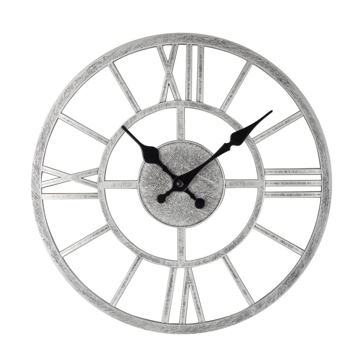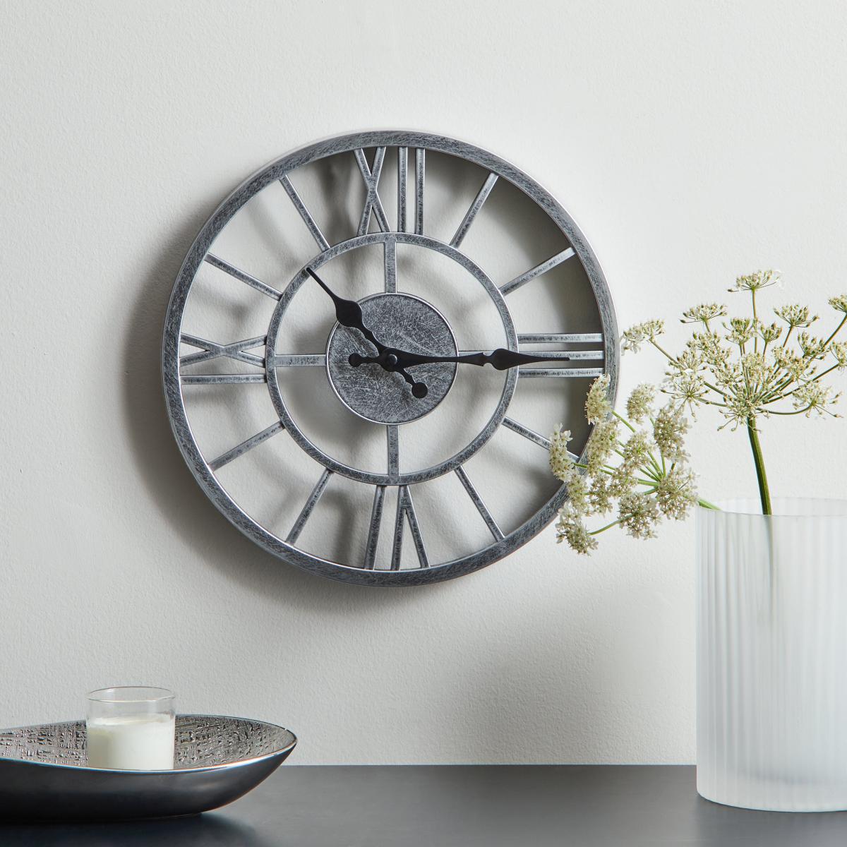 Designed with uncased hands and roman numeral figures, this quartz clock with silent movement has an antique silver colourway and circular shape for a classic look and feel, ideal for any room of the house. Weight: 205g.