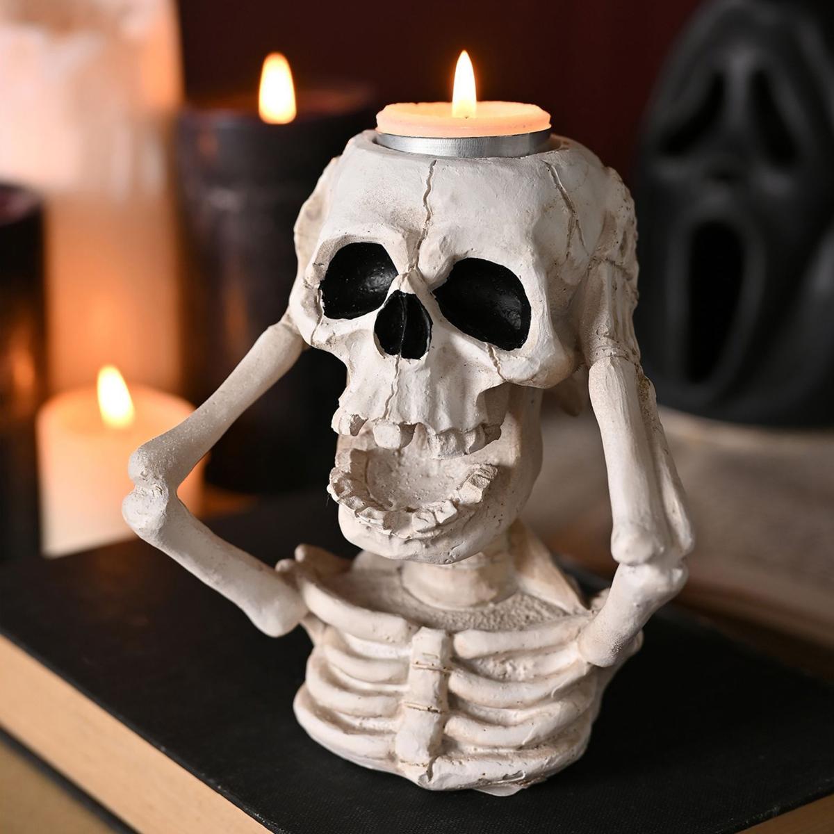 * Suitable for tea lights* Durable polyresin* Great seasonal décor piece Fill your home with candlelight this spooky season with this white skeleton tealight holder. Simply add your own tealight and watch this creepy decoration come to life. Its playful design is perfect for enhancing your Halloween theme while adding a warm glow to any space. Ideal for tabletops or mantels, it’s sure to be a conversation starter.