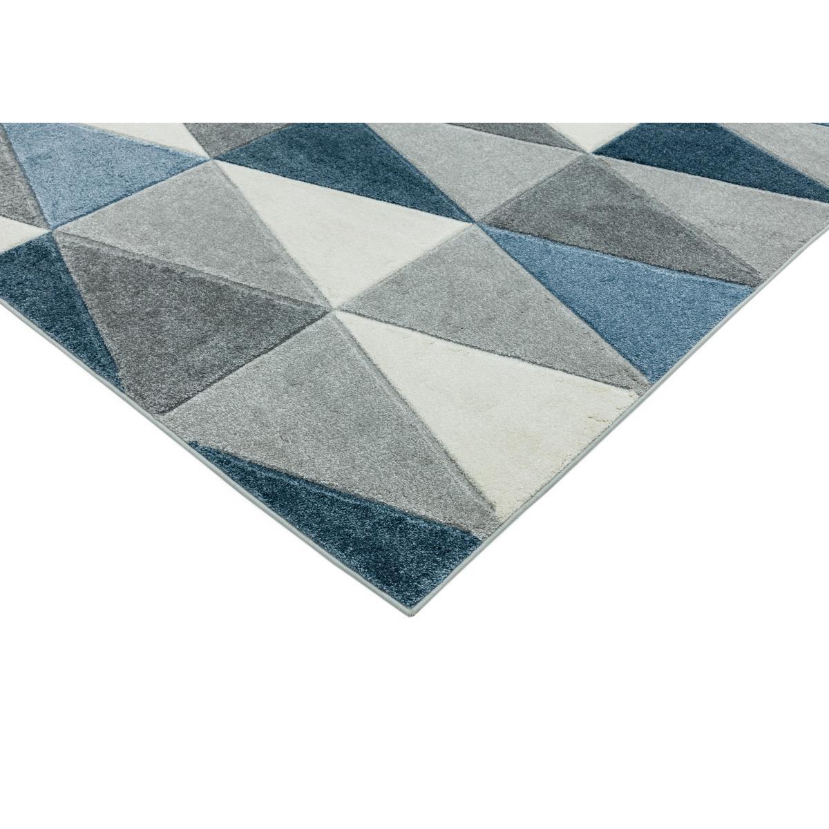 Simple and striking, this geometric rug features an arrangement of interlocking kite shapes in blues and greys. Inspired by tile flooring, it’s hand carved for softness and feels fabulous underfoot. Why you’ll love it. Fun geometric design. Bright, fresh, modern pastel colourway. Will add colour to any room. Dense yet soft, hand carved pile is comfy underfoot. Hardwearing, this rug suits high traffic areas. What you need to know. 100% Polypropylene. Machine-woven. Made in Turkey. Choice of three sizes. The range includes a wide choice of geometric designs. Easy to sponge-clean and care for.