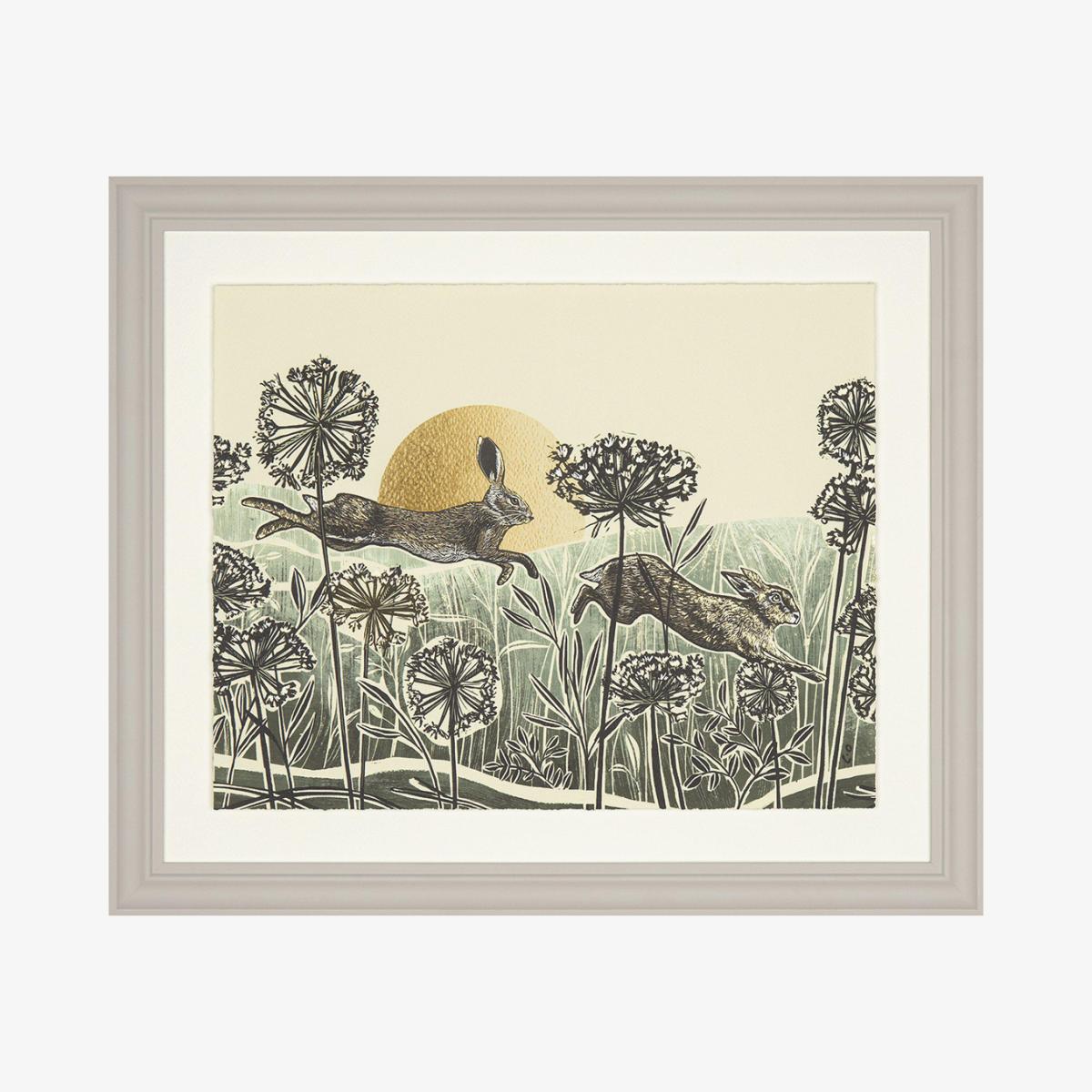Whether displayed in a living room,bedroom or hallway,this wall art is sure to captivate. Crafted from torn and raised paper,this unique artworks brings tactile dimension the piece to portray the skipping hares bounding across the meadow at sunrise.