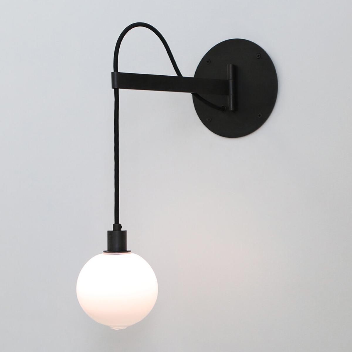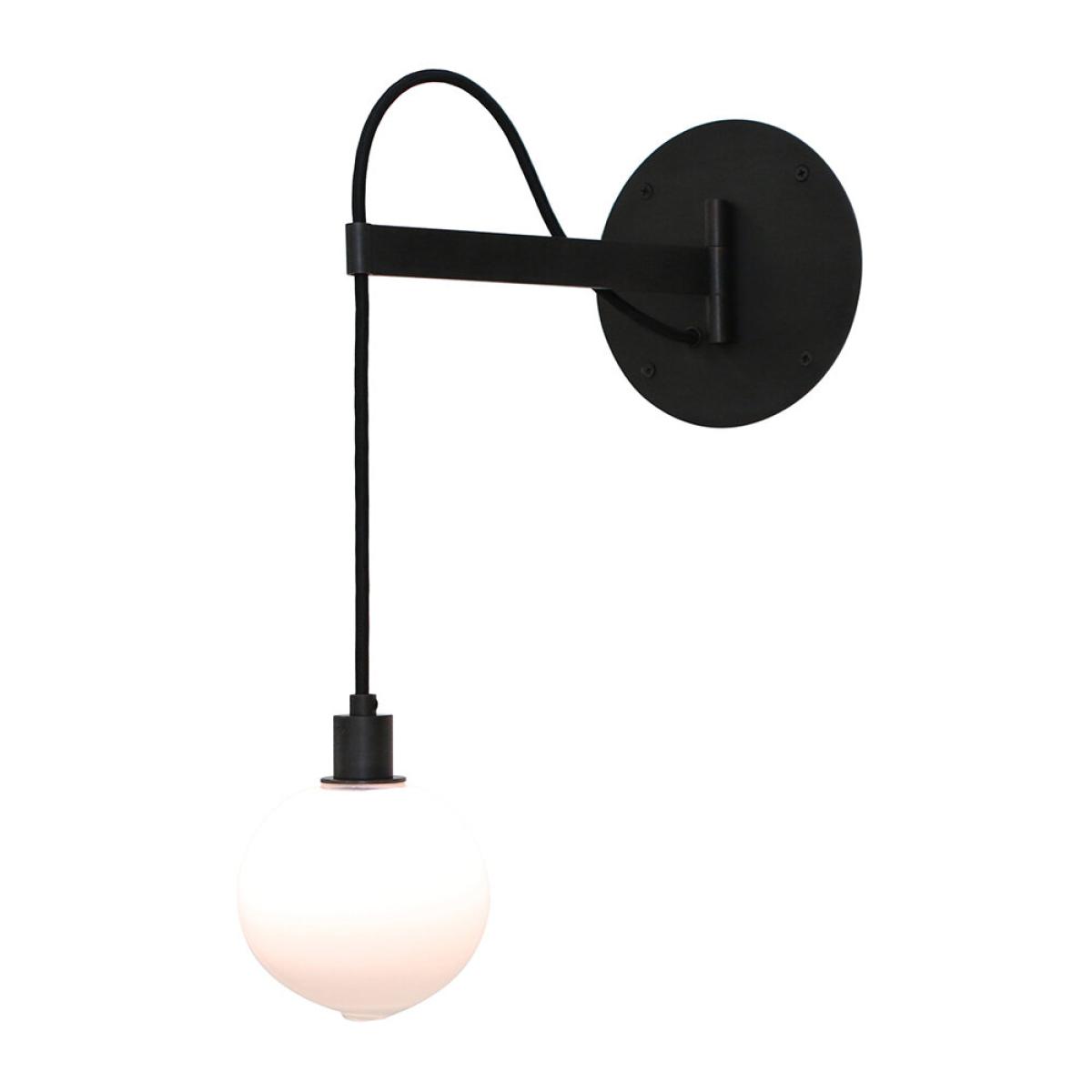Bring great design home with this Drape Arm light from SkL. O. Featuring a single-lit sphere of handblown Czech glass suspended from a moveable arm, the exposed fabric-wrapped cord passes through the end of the arm and returns to the canopy at the wall. Hinged for a full 180-degree swing, the sphere features the signature SkL. O double-dipped, fire-polished mouth which shows where the glass is broken from the blower’s pipe, making each one entirely unique.