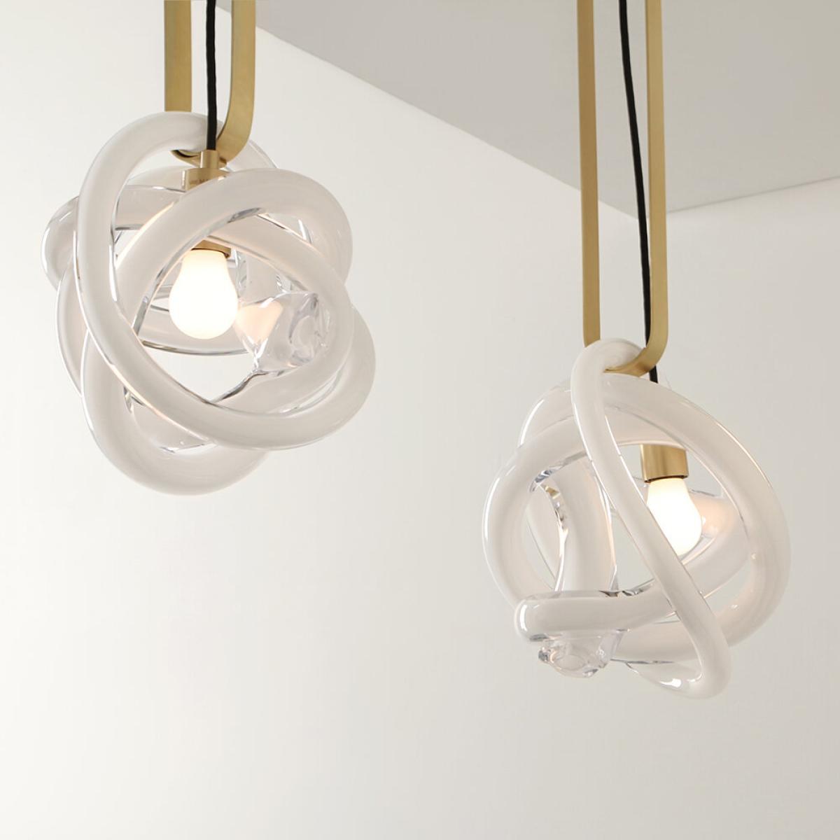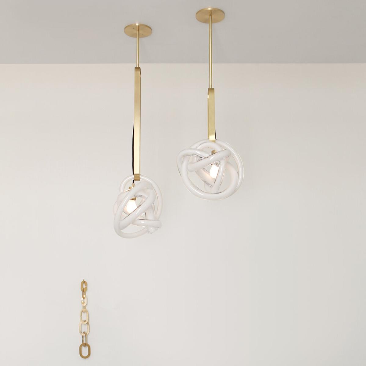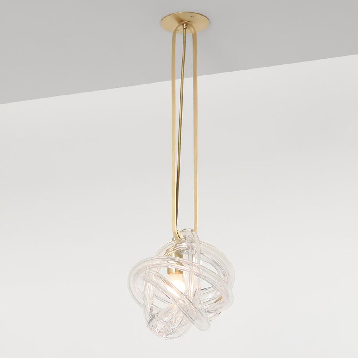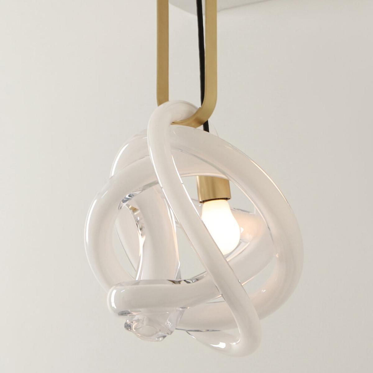 This Wrap Pin pendant light from SkL. O will make a statement in any space. Featuring a length of handblown Czech glass tube that is wound into a unique shape, it is suspended from a brass ‘pin’ that opens and closes to allow for the removal of the glass. The brass socket is suspended on an exposed fabric-wrapped electrical cord from the top of the pin and suspends the light bulb within the opening at the top of the glass. Striking in design, it will become the centrepiece of any home.