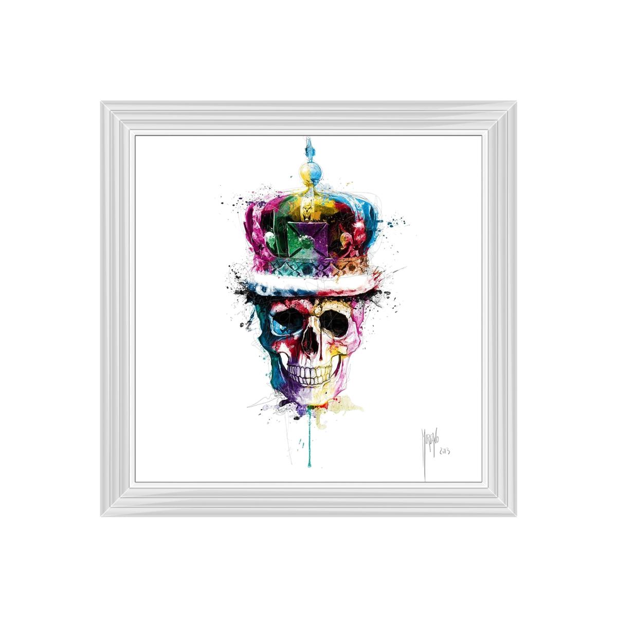 Modern and edgy 'Skull Crown' wall art bursting with colour and flair, framed in White. Skull Crown luxury wall art print by the iconic Patrice Murciano will create a fantastic feature in your home. A vibrant and edgy, multicoloured print framed in white creates a graffiti style, pop art print, which will most certainly capture the attention of your guests. Make a statement when paired with the collection of Murciano Artworks.