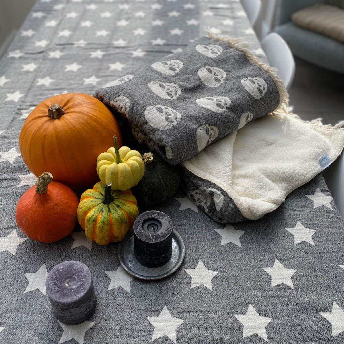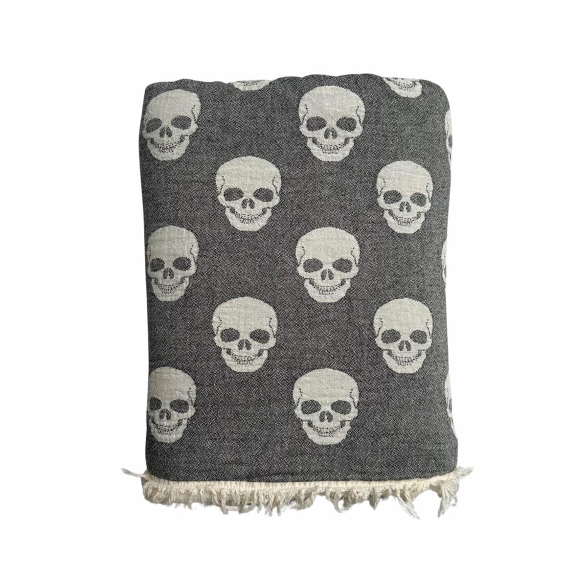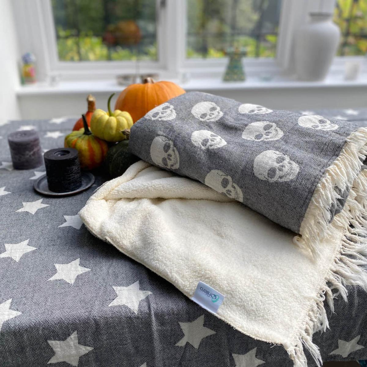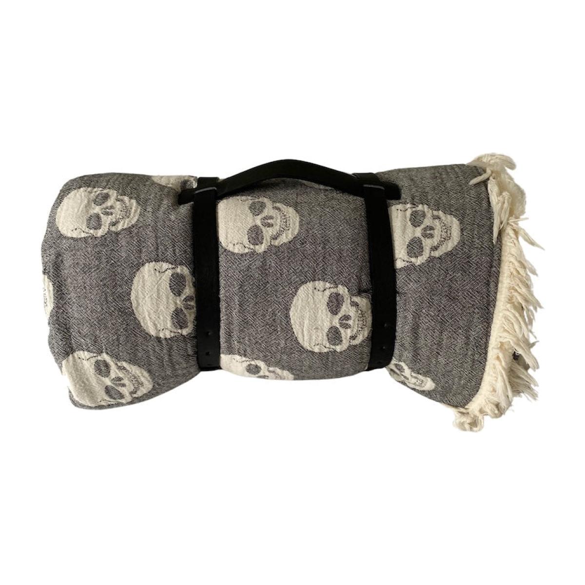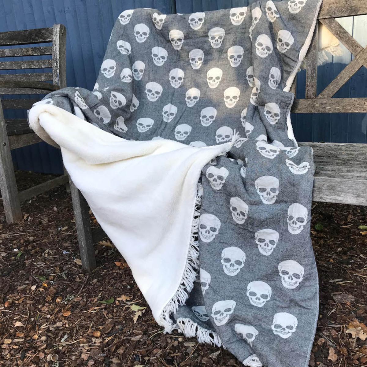 Soft cotton throw blanket in jacquard weave with cosy fleece lining on the reverse, incorporating all-over skull design. Perfect for bundling up on the sofa to watch TV, or for adding a warm and flexible extra bedroom layer. Ships with a leather-look carry handle for a neat and tidy gift presentation.