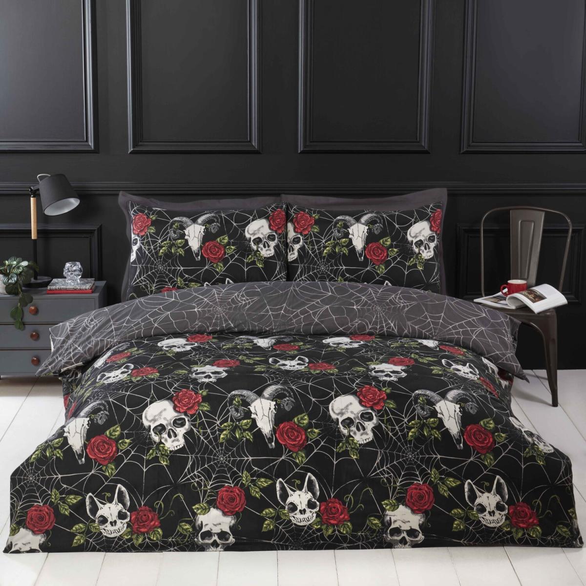 Transform your bedroom into a chamber of Gothic romance with this Halloween Bedding Set. This bewitching ensemble combines skulls, spider webs, and crimson roses to create a darkly enchanting ambiance in your bedroom. The webs stretch across the fabric, adding an extra layer of spookiness to the overall design. Fully reversible. Single Bed