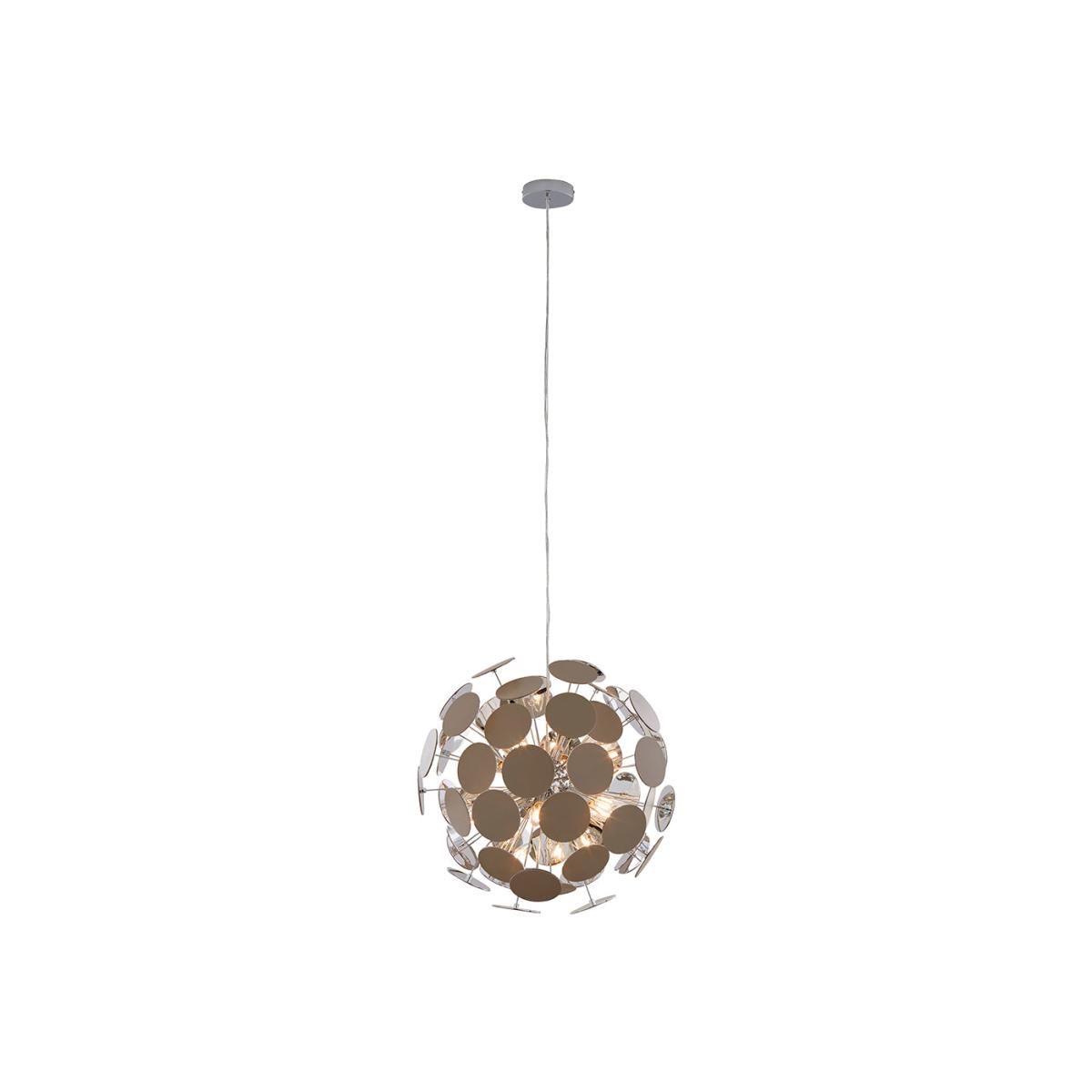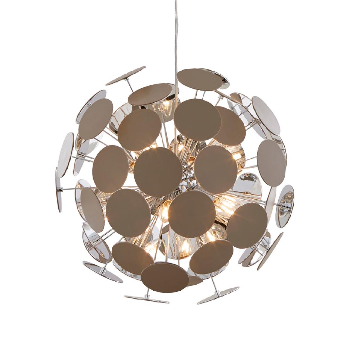 Make a bold design statement with the Skye 52cm Sputnik Ball Pendant, a stunning exclusive from Pagazzi Lighting. Inspired by mid-century modern design, this striking ceiling light reimagines the classic sputnik silhouette with a contemporary twist — combining polished chrome and putty-coloured discs for a sophisticated, sculptural look. From its central chrome sphere, multiple metal rods extend outward, each tipped with a smooth circular disc that catches and reflects the light beautifully. The six E14 SES bulb fittings sit at the heart of the design, delivering a radiant and multidirectional glow. The pendant’s reflective surfaces amplify the light output, filling your space with an impressive sparkle and depth that draws the eye from every angle. Ideal for modern and transitional interiors, the Skye pendant creates instant visual impact in living rooms, dining areas, or entrance halls. It’s also dimmable when paired with compatible bulbs and an external dimmer switch, allowing you to tailor the ambiance from bright brilliance to warm, inviting glow.