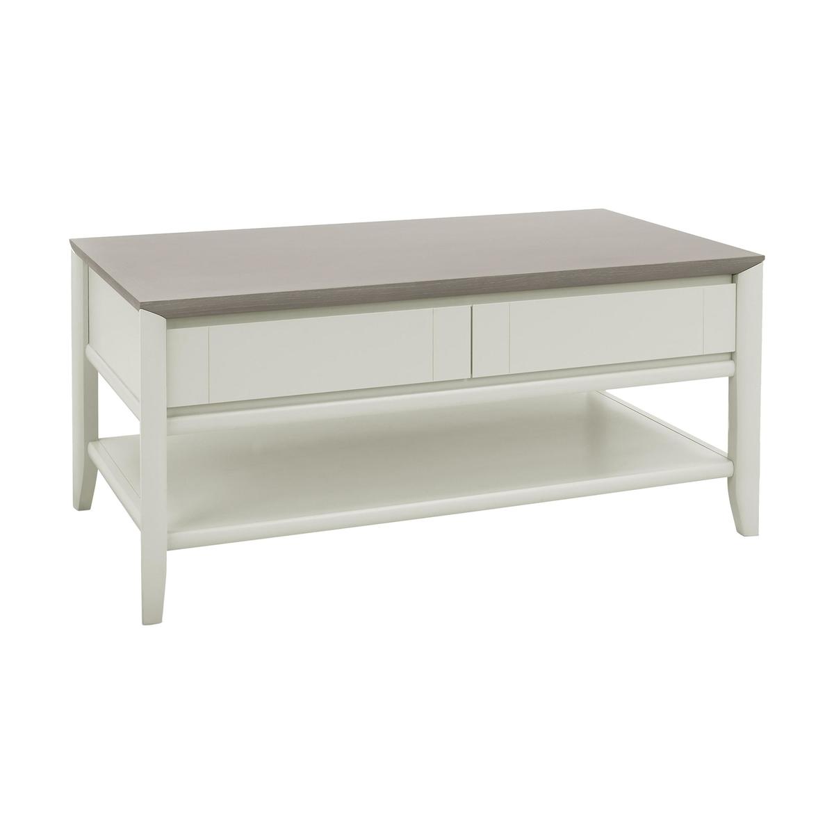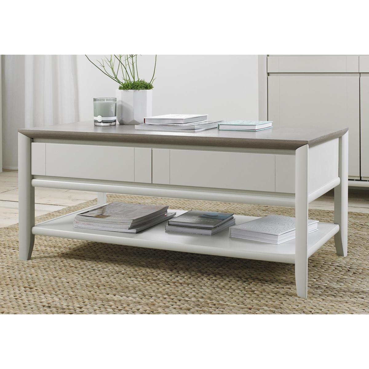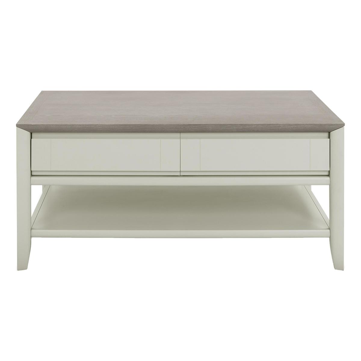 Understated style, elegant simplicity and effortless functionality: the Skye range is the contemporary range for compact spaces. Beautifully crafted from solid white oak and beech and finished with stylish grey-washed and soft grey oak veneers, every piece in this range is designed to work together across the home office, living room and dining room. Three sizes of extending dining tables, sideboards, bookcases, entertainment units, occasional tables, desks and modular storage units have been thoughtfully designed with the smaller space in mind. High-end details like decorative marquetry patterning, soft close drawers, three-way mitre joints and grooved handles make any piece you choose in this stylish range a beautiful addition to your home. Elegant, contemporary and compact design. Understated two-tone grey finish. Made from solid white oak. Elegance and simplicity come together in the well-designed, compact Skye Coffee Table. Its contemporary clean lines make it a perfect choice for the relaxed and stylish living space. Made from solid white oak, its grey-washed and soft grey oak veneers create a simple, understated finish to complement any décor. Delicate three-way mitre corner joints, grooved handles and marquetry details on the tabletop and drawers display a high level of craftsmanship and functionality. Two spacious drawers with a noiseless soft-close design and grooved handle, and a large lower shelf ensure you have plenty of space for your remote, magazines and books. Elegantly tapered legs are the perfect finishing touch. The Skye Coffee Table is part of the versatile and compact Skye range which delivers contemporary style and functionality with its wide selection of modular pieces for the home office, living room and dining room.