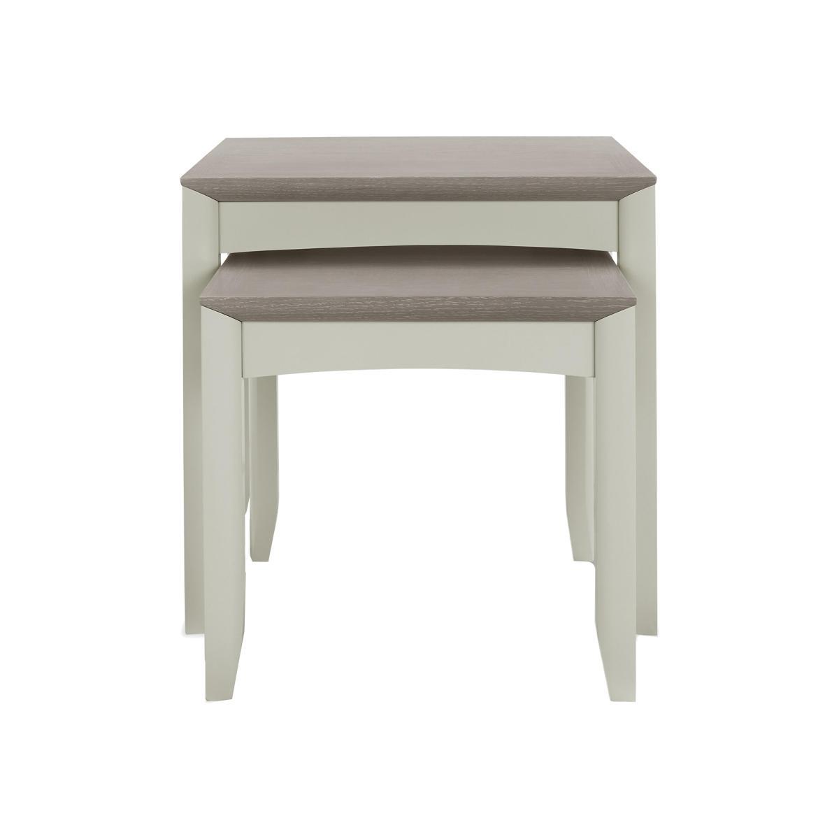 Understated style, elegant simplicity and effortless functionality: the Skye range is the contemporary range for compact spaces. Beautifully crafted from solid white oak and beech and finished with stylish grey-washed and soft grey oak veneers, every piece in this range is designed to work together across the home office, living room and dining room. Three sizes of extending dining tables, sideboards, bookcases, entertainment units, occasional tables, desks and modular storage units have been thoughtfully designed with the smaller space in mind. High-end details like decorative marquetry patterning, soft close drawers, three-way mitre joints and grooved handles make any piece you choose in this stylish range a beautiful addition to your home. Elegant, contemporary and compact design. Understated two-tone grey finish. Made from solid white oak. The Skye Nest of Tables is the embodiment of contemporary elegance – and clever space-saving design. From its clean lines to its grey-washed and soft grey two-tone finish, these two tables bring style to any living space. Made from white solid oak and oak veneers, each table features beautiful detailing in the form of tabletop marquetry patterning and neat three-way mitre joints. Bring out the second table when you have guests to stay and simply slot back when no longer needed. Its clean lines and elegantly tapered legs make this compact nest of tables a wonderful addition to any home. The Skye Nest of Tables is part of the superbly versatile, compact and modular Skye range which lets you combine a selection of well-designed pieces across the dining room, living room and home office.