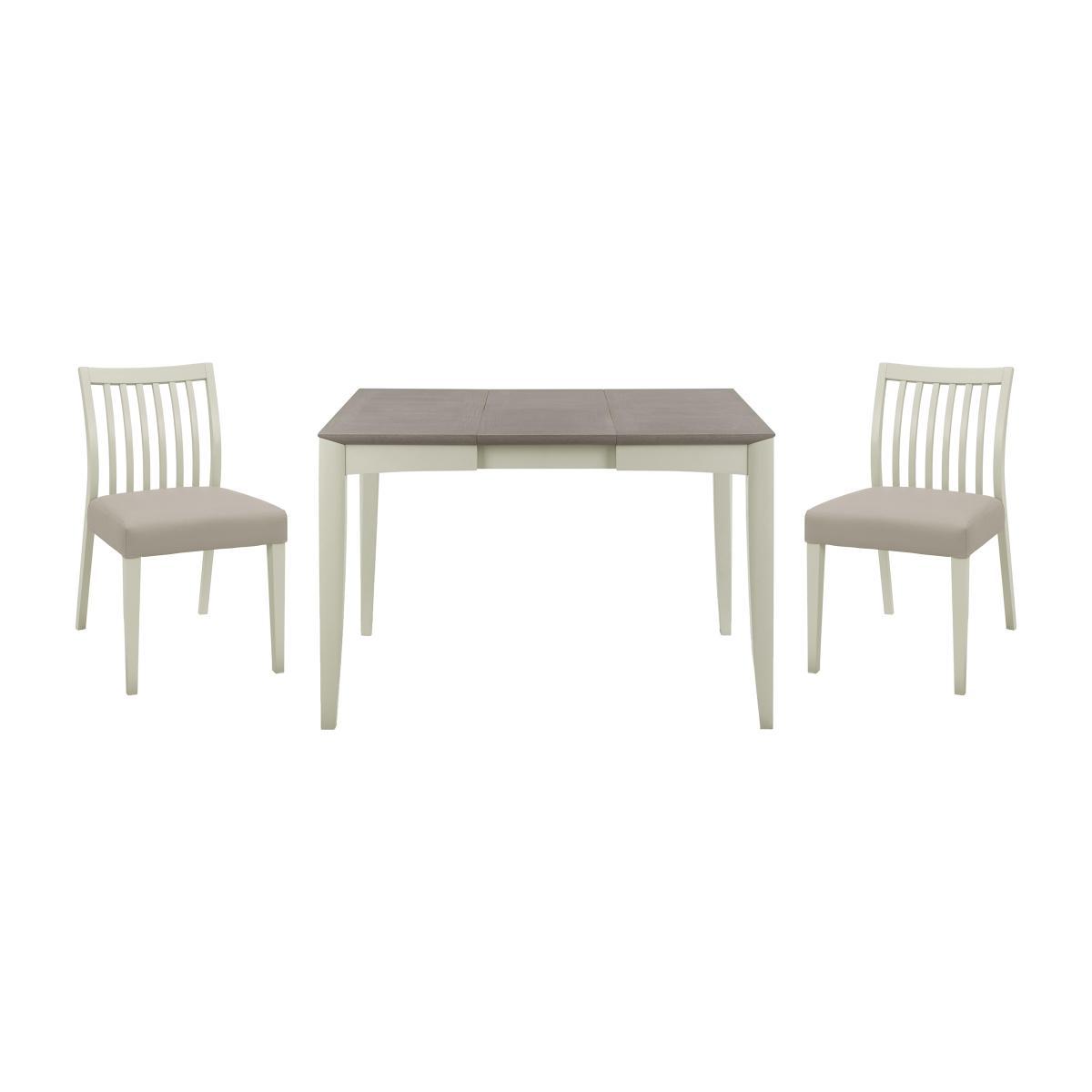 Understated style, elegant simplicity and effortless functionality: the Skye range is the contemporary range for compact spaces. Beautifully crafted from solid white oak and beech and finished with stylish grey-washed and soft grey oak veneers, every piece in this range is designed to work together across the home office, living room and dining room. Three sizes of extending dining tables, sideboards, bookcases, entertainment units, occasional tables, desks and modular storage units have been thoughtfully designed with the smaller space in mind. High-end details like decorative marquetry patterning, soft close drawers, three-way mitre joints and grooved handles make any piece you choose in this stylish range a beautiful addition to your home. Elegant, contemporary and compact design. Understated two-tone grey finish. Made from solid white oak. Beautifully simple and understated, the Skye Small Table and 2 Slatted Chairs features elegantly tapered solid beech legs and a solid oak tabletop. It’s stylishly finished in soft grey and grey-washed oak veneers for a sophisticated feel. Ideal for compact spaces, the table easily extends to seat 4 with a clever built in butterfly extension, so you can enjoy your meals in even more comfort. Details such as arched underframes, three-way mitre joints and decorative marquetry patterning showcase this table’s high-quality finish. Paired with two wonderfully comfortable dining chairs with simple slatted backs, made from solid beech and finished with the same lovely two-tone grey oak veneers. The comfy sprung seats come in a choice of black gold-toned fabric and chic grey faux leather. The Skye Small Table and 2 Slatted Chairs set is part of the Skye range. You’ll find a wonderful selection of compact, versatile contemporary furniture for the home office, living room and dining room that can be mix and matched together. Tip. For smooth, easy extension please follow the guidelines.