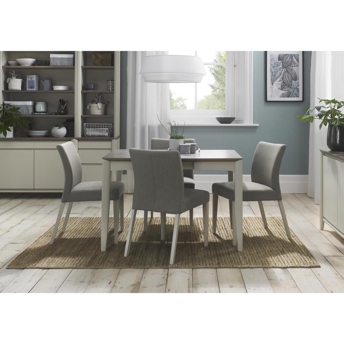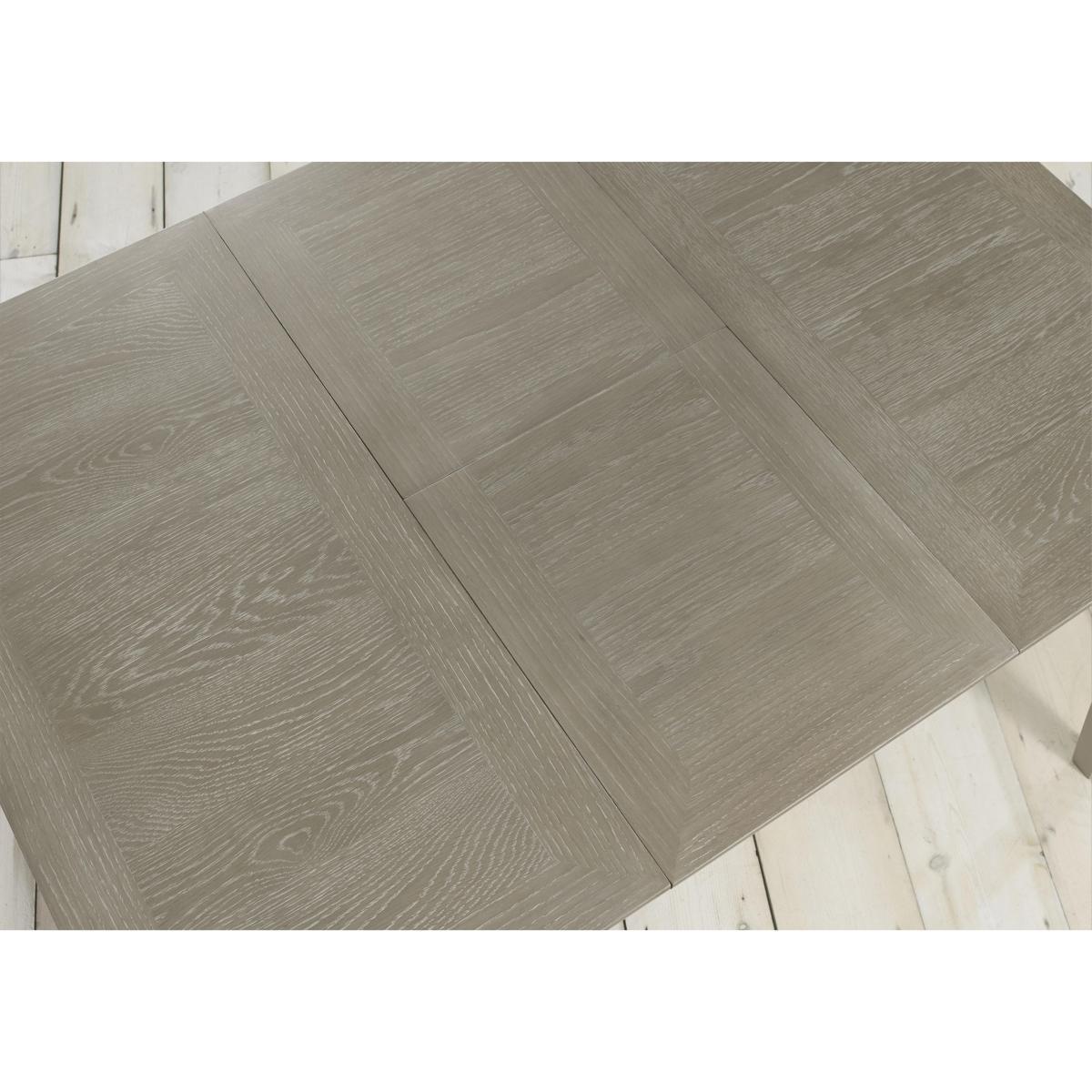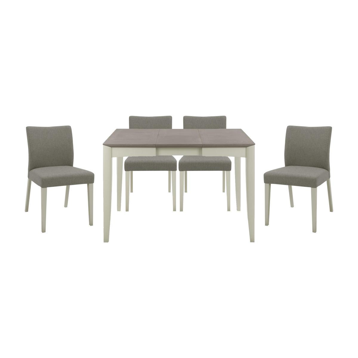Understated style, elegant simplicity and effortless functionality: the Skye range is the contemporary range for compact spaces. Beautifully crafted from solid white oak and beech and finished with stylish grey-washed and soft grey oak veneers, every piece in this range is designed to work together across the home office, living room and dining room. Three sizes of extending dining tables, sideboards, bookcases, entertainment units, occasional tables, desks and modular storage units have been thoughtfully designed with the smaller space in mind. High-end details like decorative marquetry patterning, soft close drawers, three-way mitre joints and grooved handles make any piece you choose in this stylish range a beautiful addition to your home. Elegant, contemporary and compact design. Understated two-tone grey finish. Made from solid white oak. The Skye Small Table and 4 Upholstered Chairs set is the epitome of contemporary elegance. The compact table features a butterfly extension so you can easily seat 4 people, and it’s finished with beautiful detailing in the form of marquetry patterning, neat three-way mitre joints and arched underframes. The tabletop is made from solid white oak while the legs are fashioned from solid beech. It’s thoughtfully finished with soft grey and grey-washed veneers, as are the chairs, to give it a simple, understated feel. The four upholstered chairs are elegantly designed with curved backs and tapered legs. Each sprung seat is comfortably cushioned and available in a choice of dark grey or gold-flecked black fabric. The Skye Small Table and 4 Upholstered Chairs set is part of the Skye range. Offering endlessly versatile compact furniture in a contemporary style for the home office, living room and dining room. Tip. For smooth, easy extension please follow the guidelines.