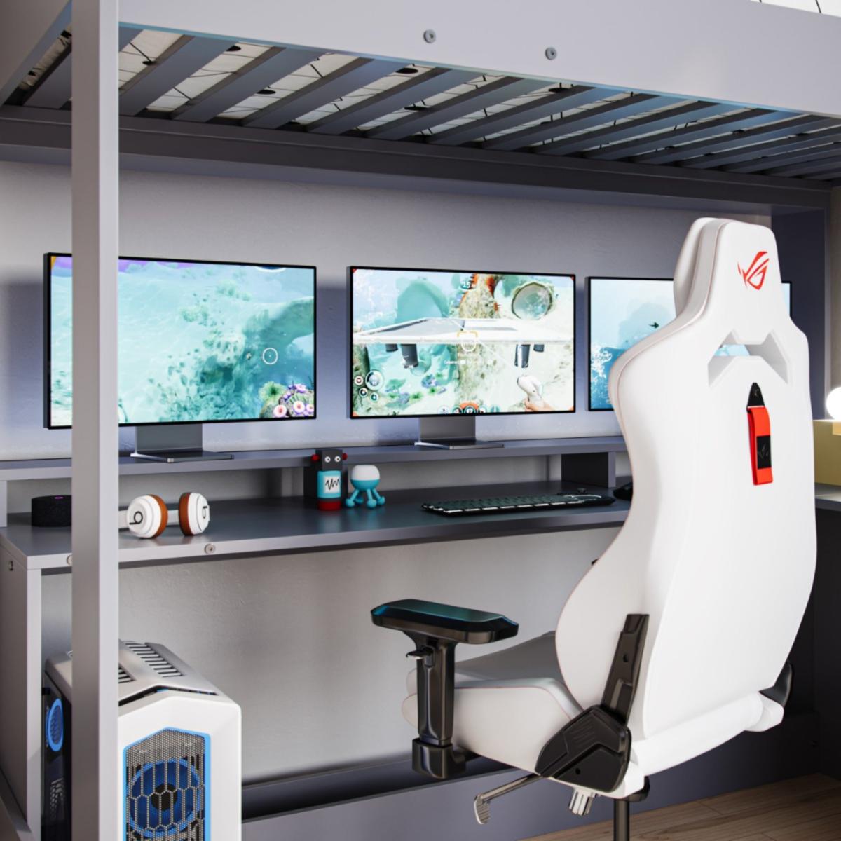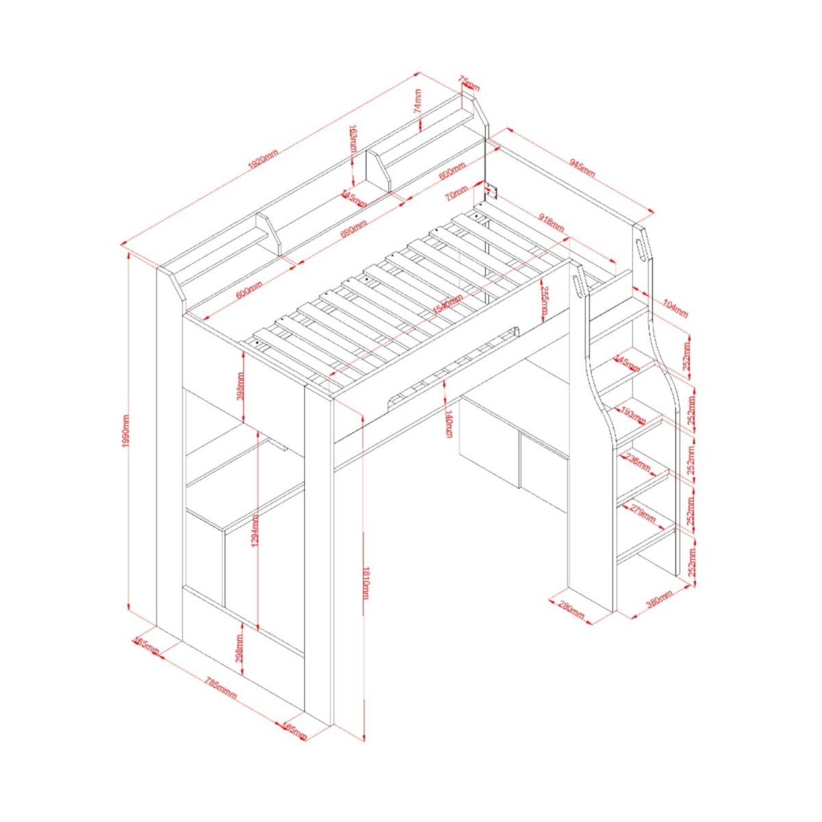 * Gaming bed* Wide step ladder* Storage included* L-shaped desk This gaming bed frame not only offers a cosy place to sleep, but also features long storage shelves, perfect for organising toys, books, and cherished knick-knacks, ensuring a clutter-free environment. The large L-shaped desk beneath the bed is a gamer’s dream, offering ample space to accommodate up to three widescreen monitors, so every detail is captured during intense gaming sessions. Crafted from durable particle board, this high sleeper seamlessly blends functionality with contemporary design, making it a standout addition to any bedroom. Safety is a top priority, with a wide-stepped ladder providing easy and secure access to the spacious bed frame.