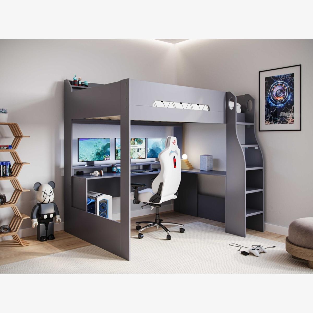 The Flair Skyhigh Gaming High Sleeper in Anthracite is the ultimate space for students by day and gamers by night. Crafted from durable wood, specifically particle board, this high sleeper combines functionality with a contemporary design. Designed with safety in mind, the wide-stepped ladder ensures easy access to the spacious bed frame, making it a secure focal point for safety and style. The versatility extends to long storage shelves, offering an ideal space for your young one's favourite toys and cherished knick-knacks. Additionally, it features a large L-shaped desk spacious enough to accommodate three widescreen monitors, ensuring you catch every monster and enemy while gaming. Elevate your child's room with the Flair Skyhigh Gaming High Sleeper where study and play seamlessly come together. Choose Flair for quality, comfort, and a touch of modern sophistication.