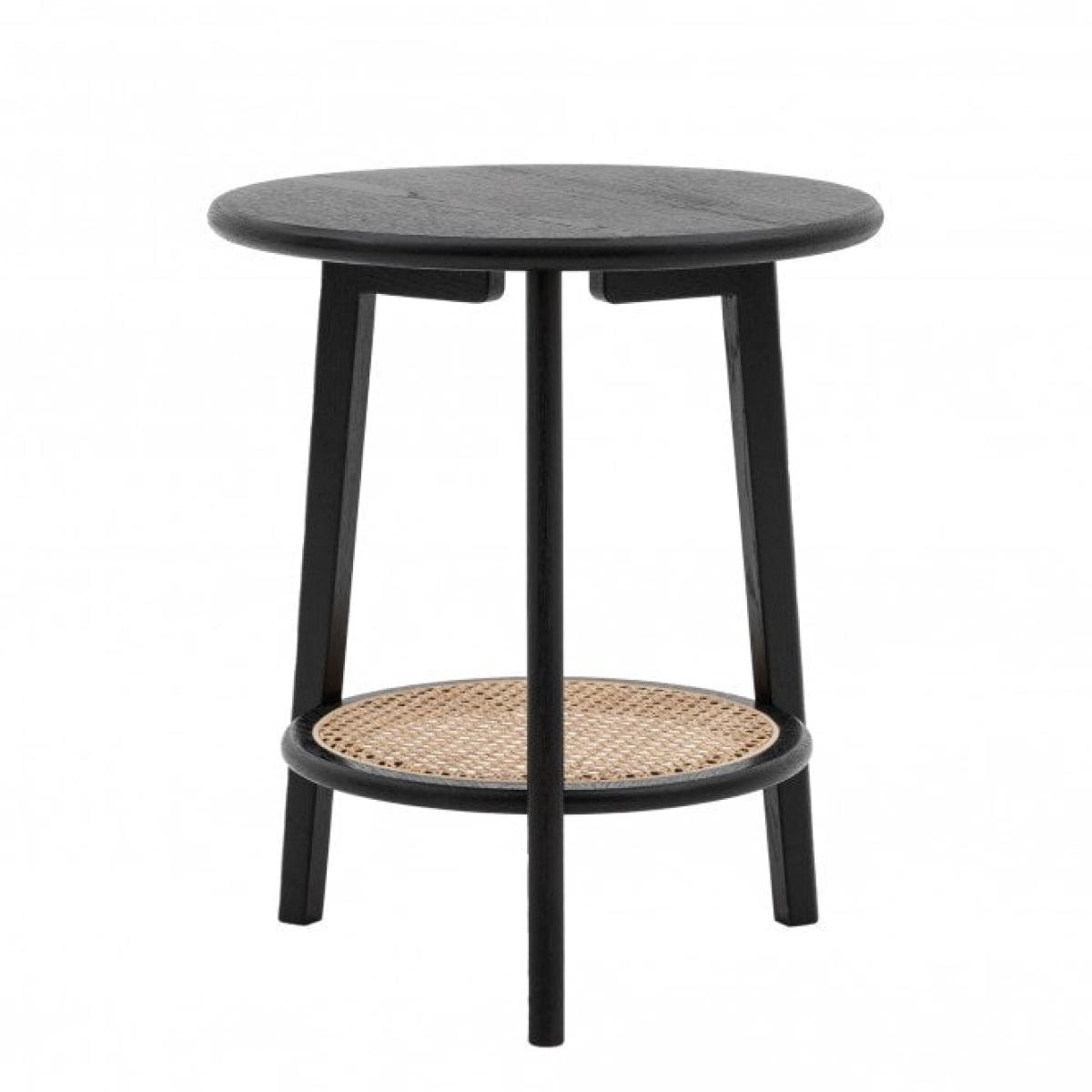 With a hint of art deco this range is overflowing with statement stand out style. In dramatic black stained solid oak the round bedside table is the perfect spot to rest a lamp and bedtime book. The woven rattan lower shelf adds extra storage and a striking contrast of materials and colour.