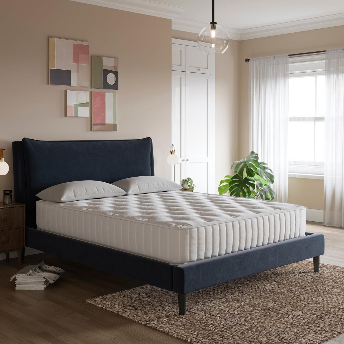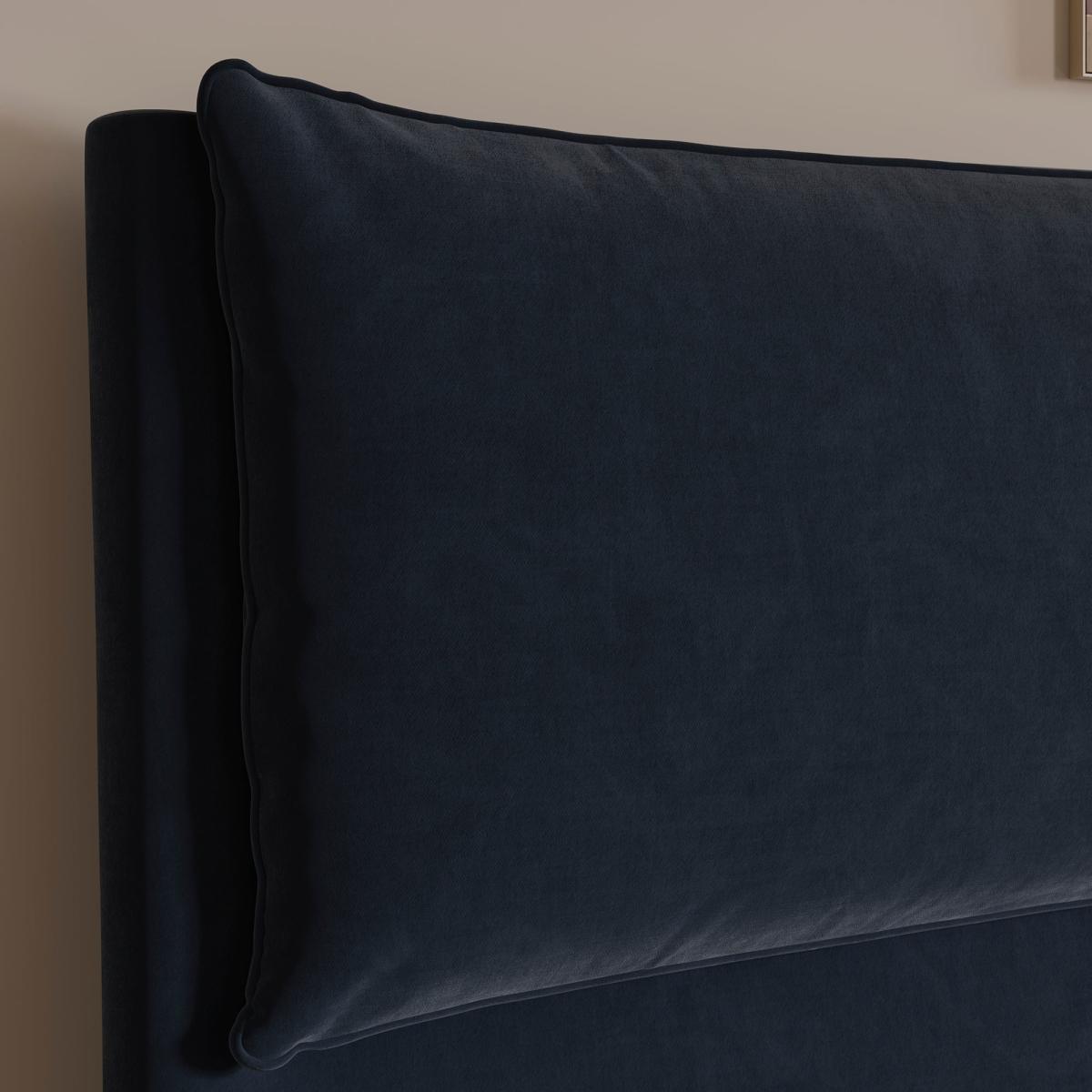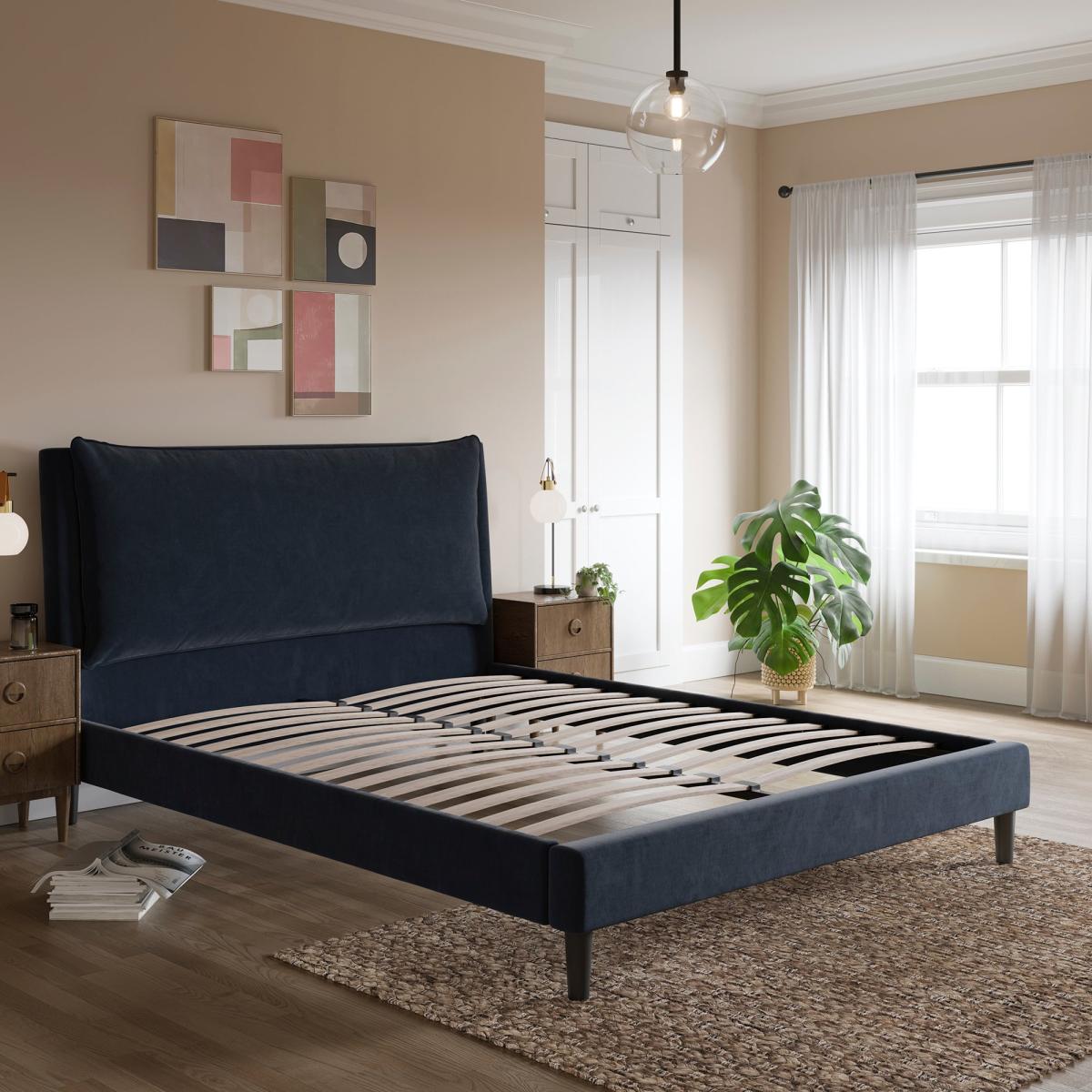 I’m a fan of this navy velvet bed for its balance of comfort and clean lines. The soft, padded headboard gives a welcoming feel while the streamlined frame keeps it looking modern. It works particularly well in schemes that pair deep jewel tones with brass or matte-black accents - think Art Deco-inspired touches or a contemporary Scandi look with pale woods and plenty of neutrals. For styling, layer crisp white or dove-grey bedding to let the navy really pop, then add a couple of accent cushions in burnt orange or emerald green for contrast. A low-profile bench at the foot of the bed and a chunky wool rug help ground the space, and a leafy plant or two will bring in warmth and texture without overcrowding your scheme.