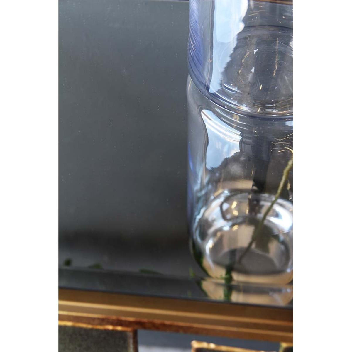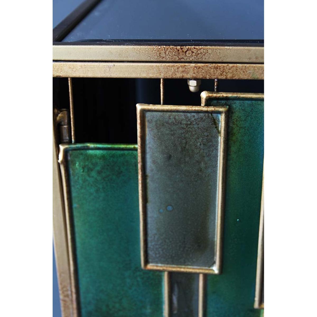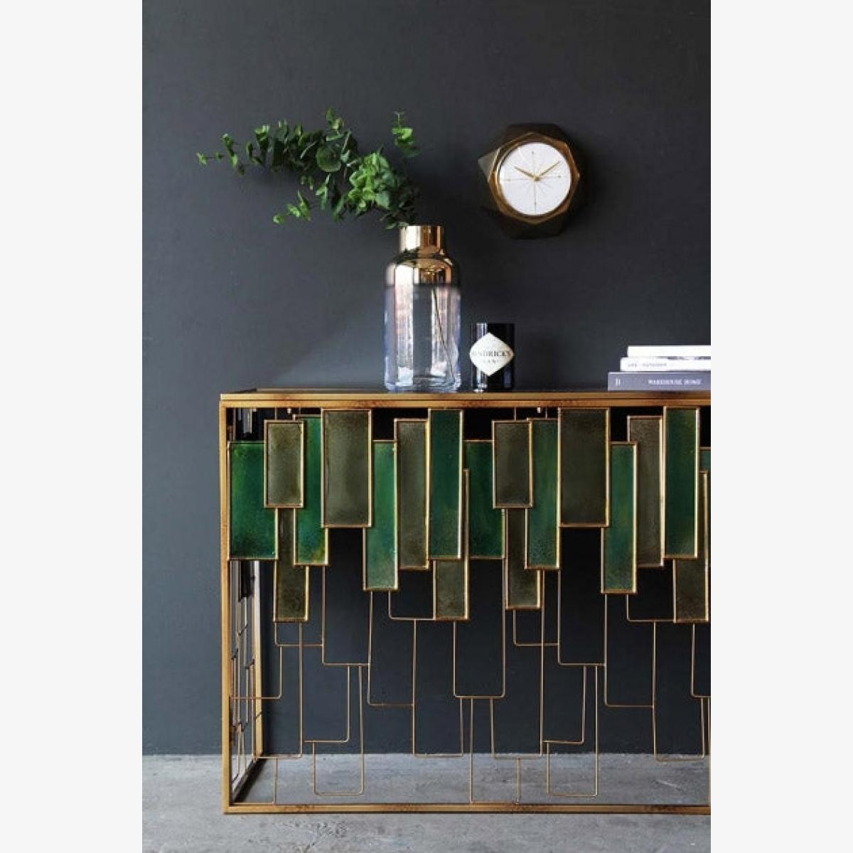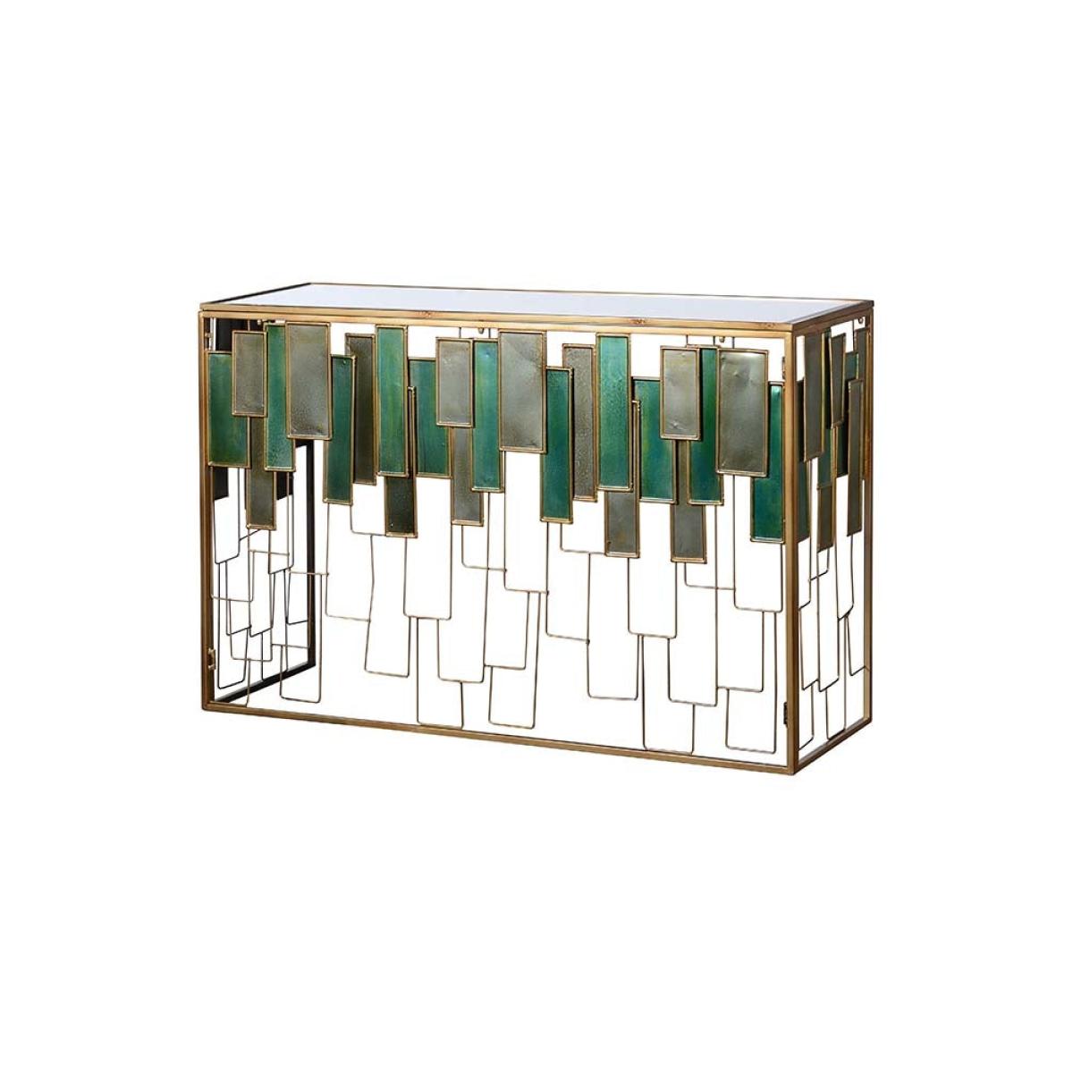 About The Skyline Console TableWe absolutely love this Skyline Console Table, it not only provides the functionality of a sideboard or display table, but it is also a work of art and a real feature piece to introduce to your home. Why We Think You'll Love The Skyline Green Glass TableAptly named Skyline, the mixture of pearlised panels, to us, look like a stunning skyline of tower blocks. This, combined with the shell effect greens, blues, and turquoise colours and outlined in an antique gold colour, will fit in with most decors and stand out as a real focal point in the room. How To Style The Green Glass Console TableThe mirrored surface top is perfect for not only displaying ornaments, a statement mirror, trinkets, and family photos but reflecting them too. We're confident you'll love this console table and will be able to add it to any room in your home.