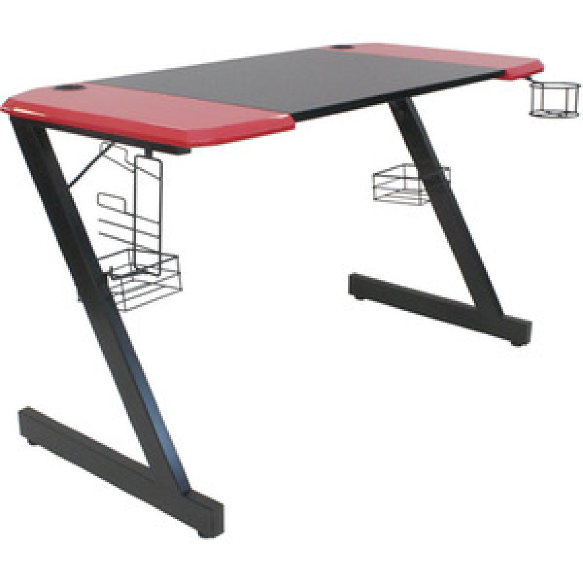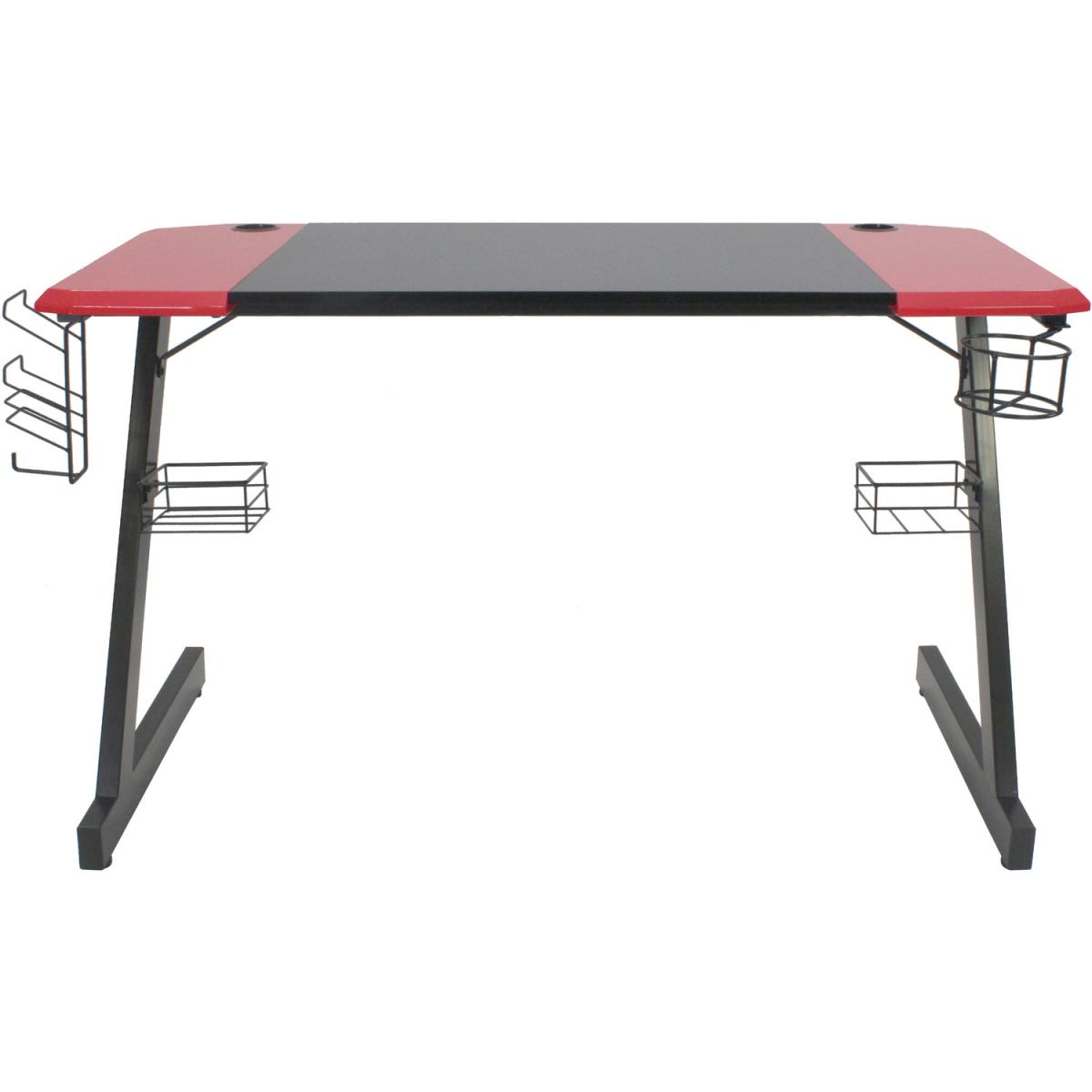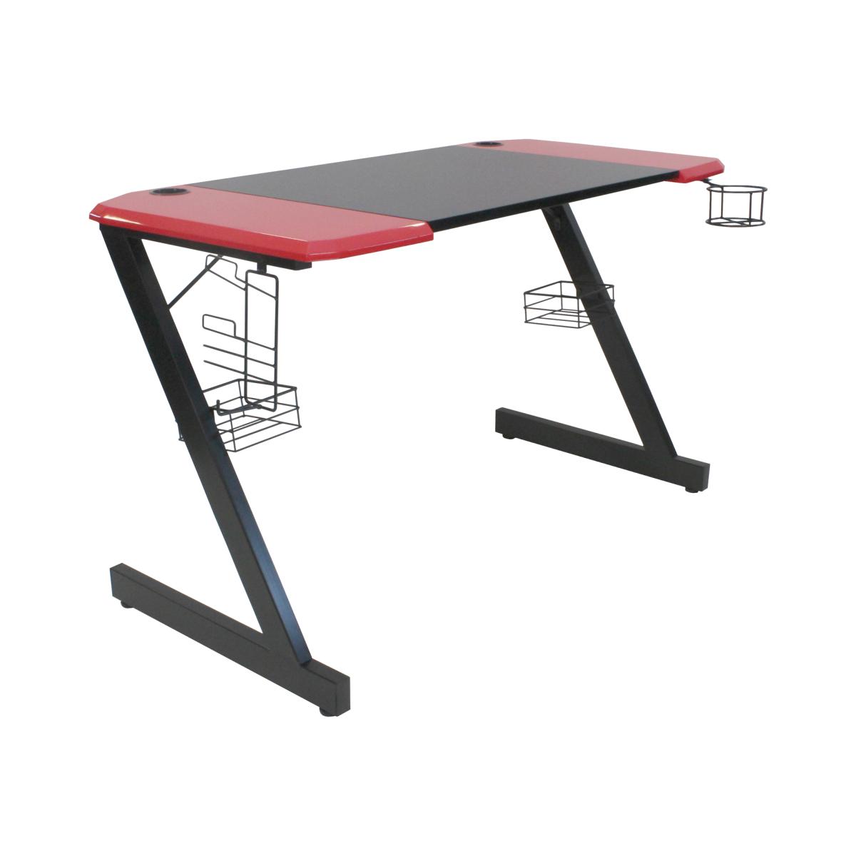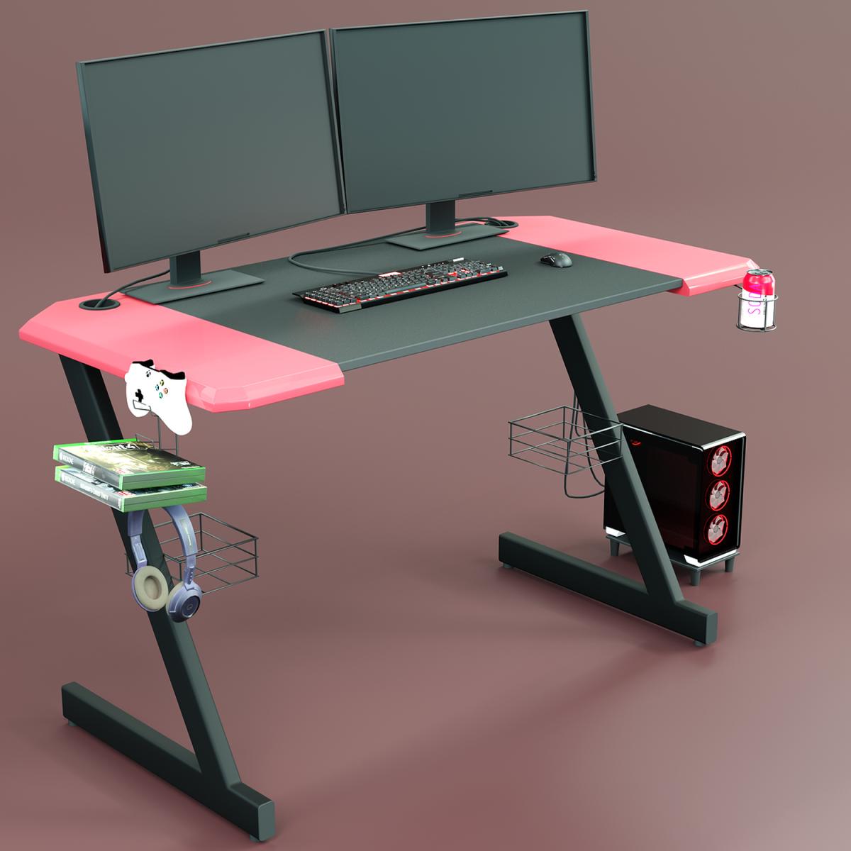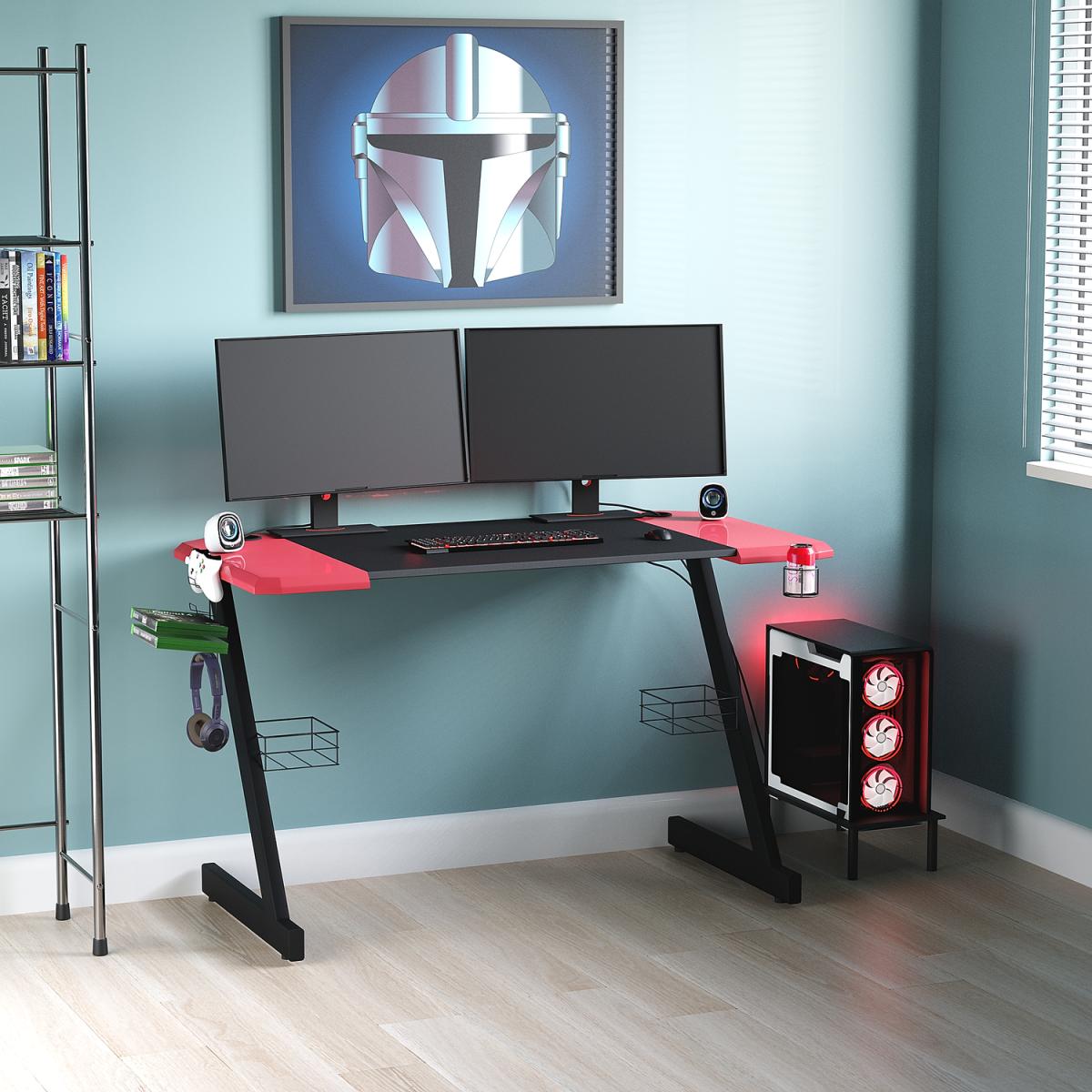 Upgrade your gaming room with the easy to assemble Slade gaming desk, stylish and functional with the dual cable management ports this desk will suit any room and PC configuration. Multiple storage options for Games, Headphones, Drinks, and Loose Cables leaving the desk clear for dual monitor setups. The Z shape legs give maximum strength and stability whilst leaving the underside of the desk clear for chair armrests.
