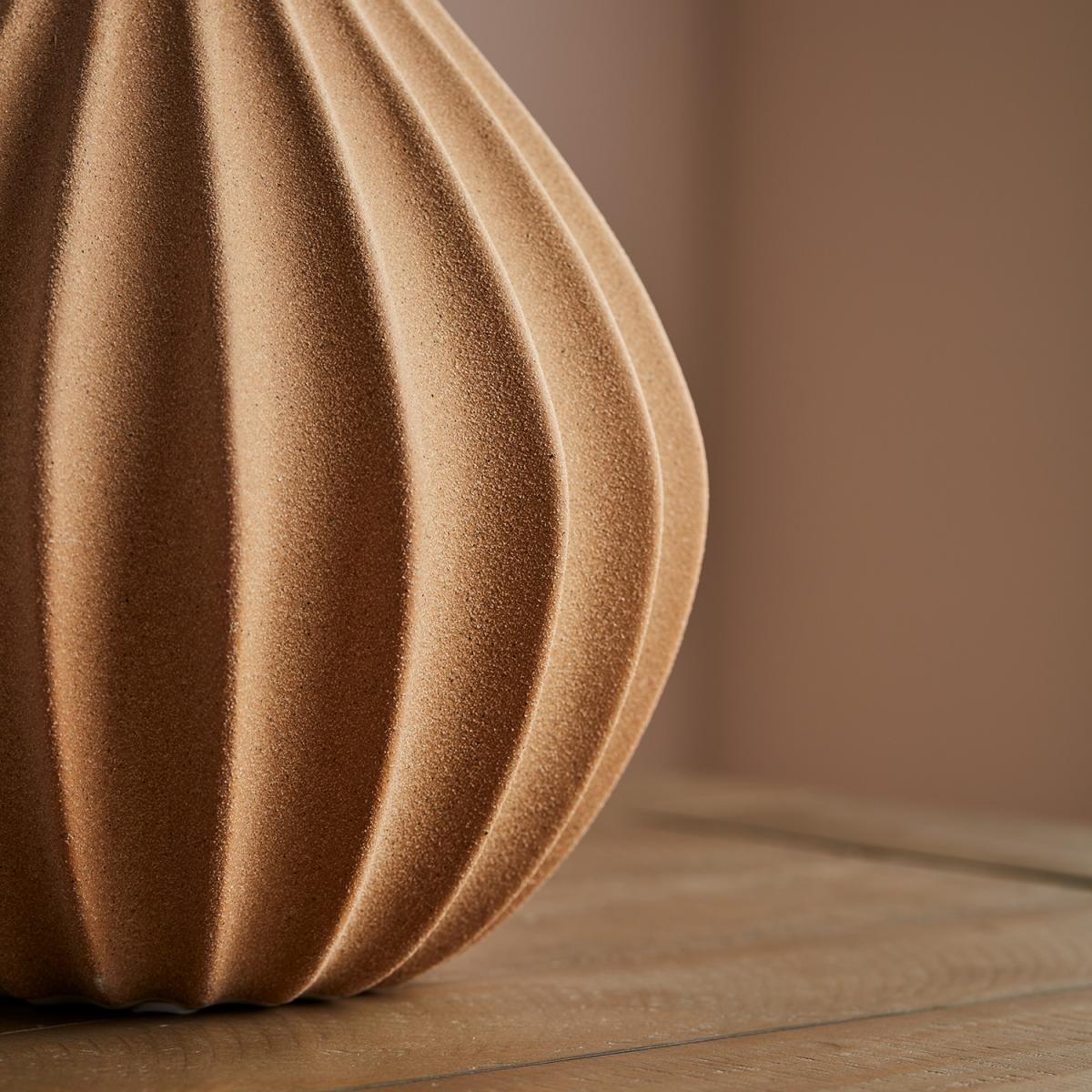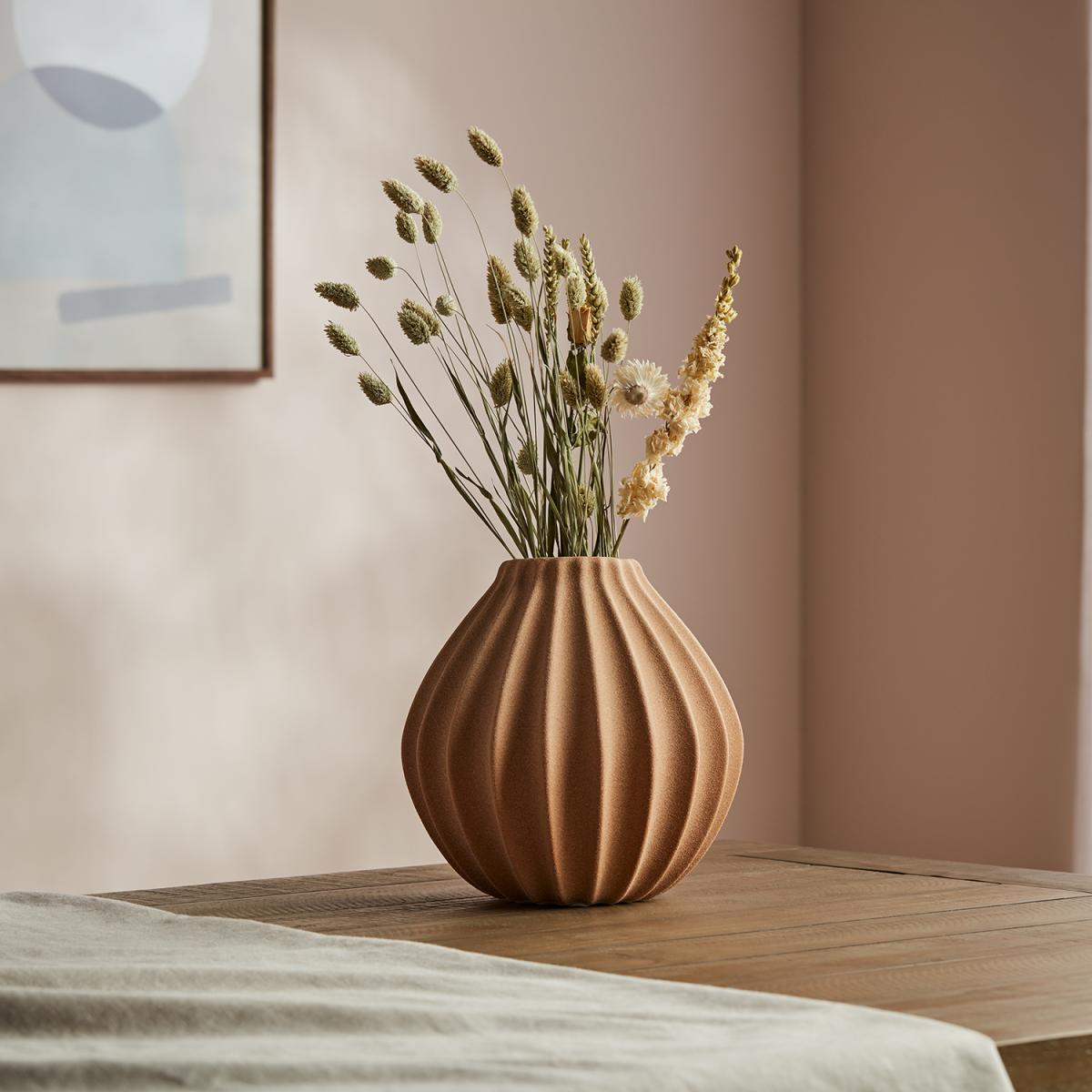 The beautiful Medium Slade Vase oozes sophisticated style with its organic curved shape and textured finish. The beautiful grooves coupled with the sand finish of this round ceramic vase will receive a lot of attention wherever you choose to place it in your home. Place dried flower stems inside or simply stand on its own and let its clever design do the talking.