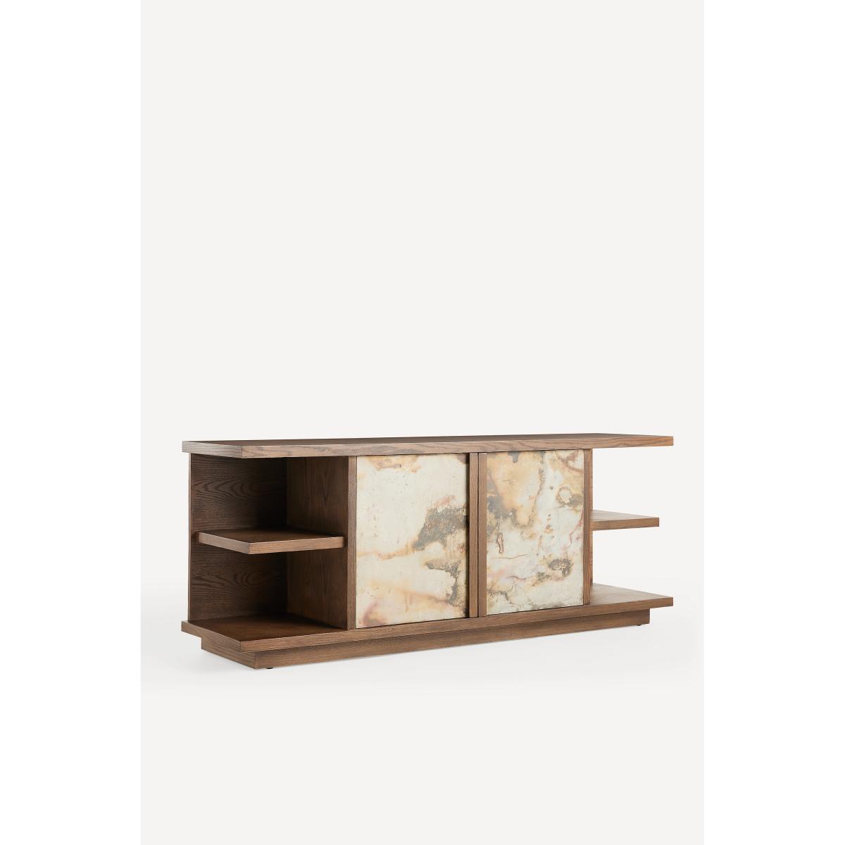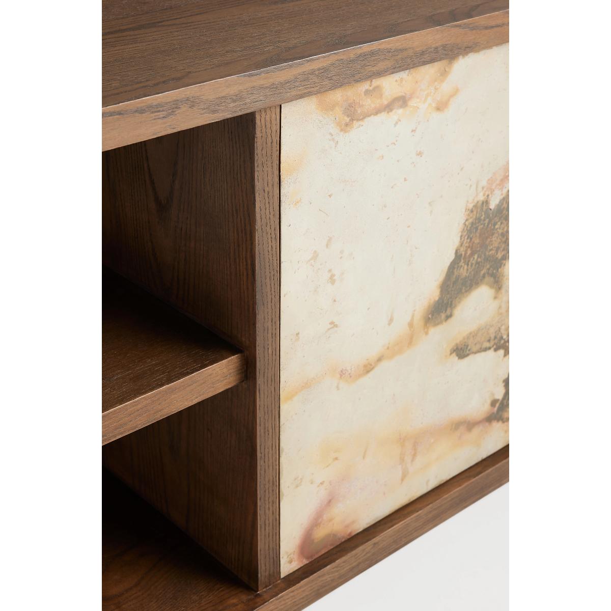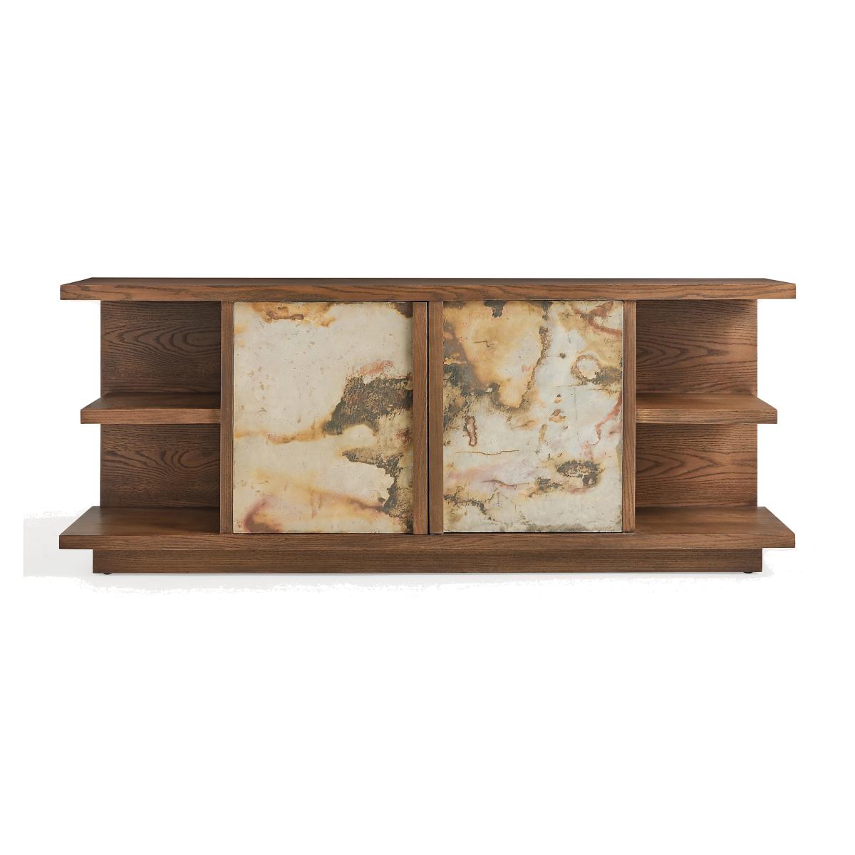 A slate façade with flowing striations completes this solid oak console, which features plenty of shelves and generous storage space. * Solid oak wood reinforced with engineered hardwood with medium cocoa brown finish * Macedonia slate facade * Sealed with clear lacquer for protection * Wipe clean with soft cloth. Avoid chemical cleaners * Address spills immediately with a dry, soft cloth. Natural stone is a porous material, and although it has been sealed, spills should be blotted promptly to minimize staining * This piece is intended for indoor use * No assembly required * Imported