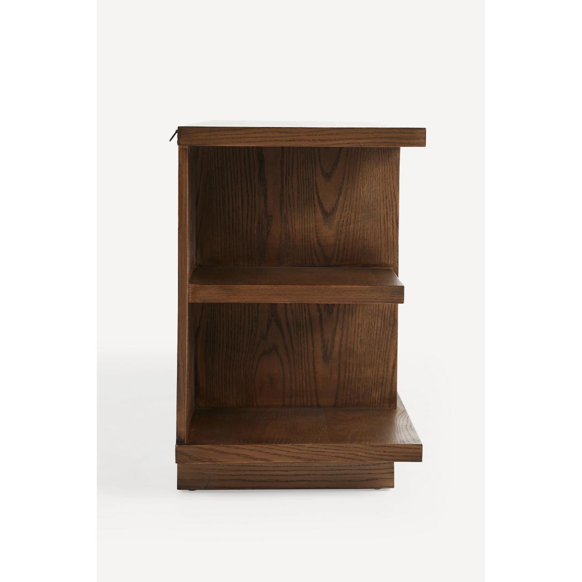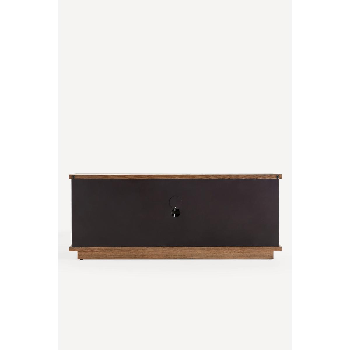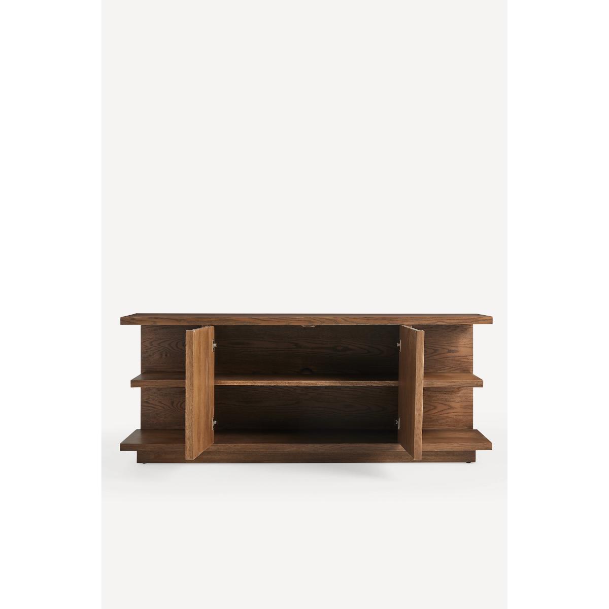 A slate façade with flowing striations completes this solid oak console, which features plenty of shelves and generous storage space. * Solid oak wood reinforced with engineered hardwood with medium cocoa brown finish * Macedonia slate facade * Sealed with clear lacquer for protection * Wipe clean with soft cloth. Avoid chemical cleaners * Address spills immediately with a dry, soft cloth. Natural stone is a porous material, and although it has been sealed, spills should be blotted promptly to minimize staining * This piece is intended for indoor use * No assembly required * Imported