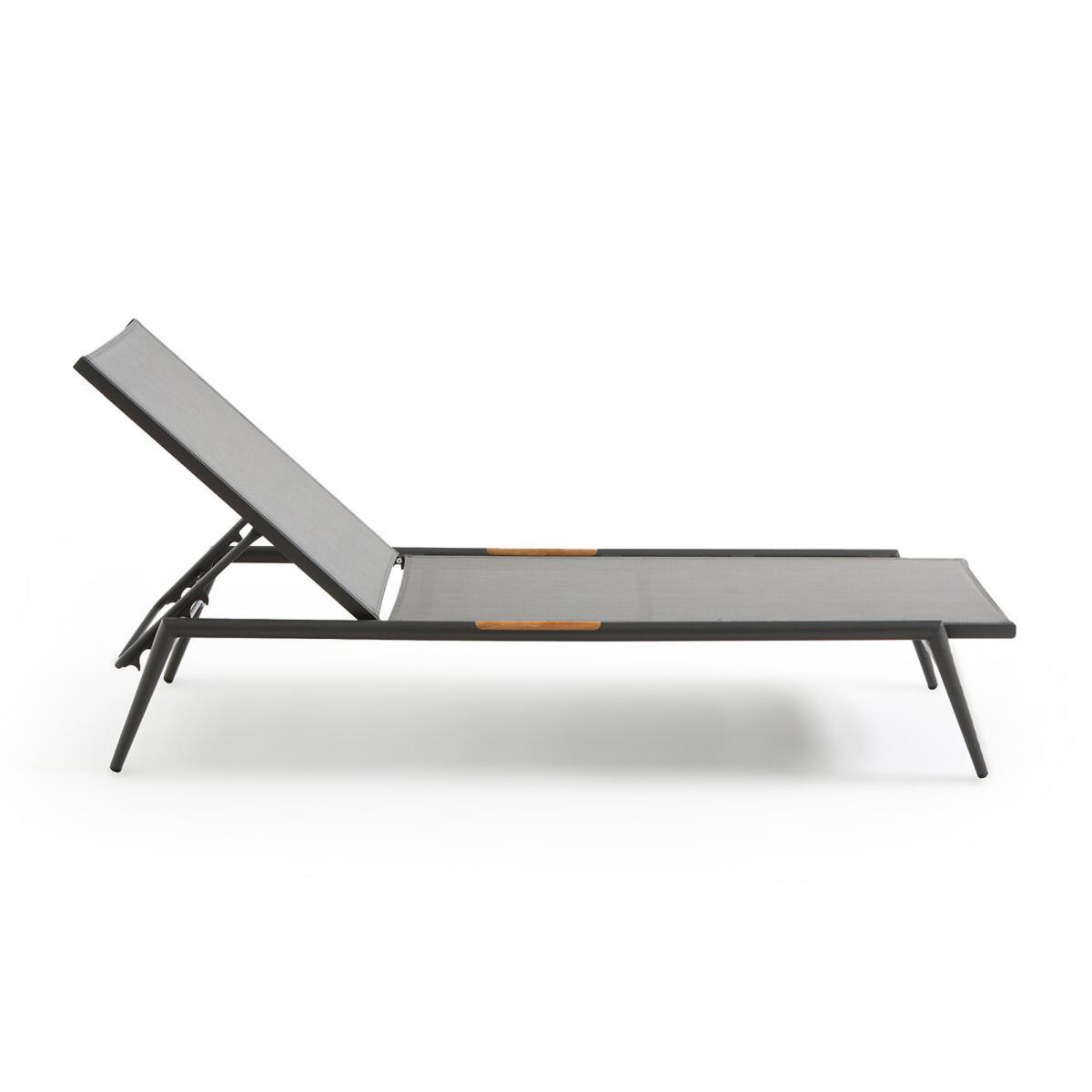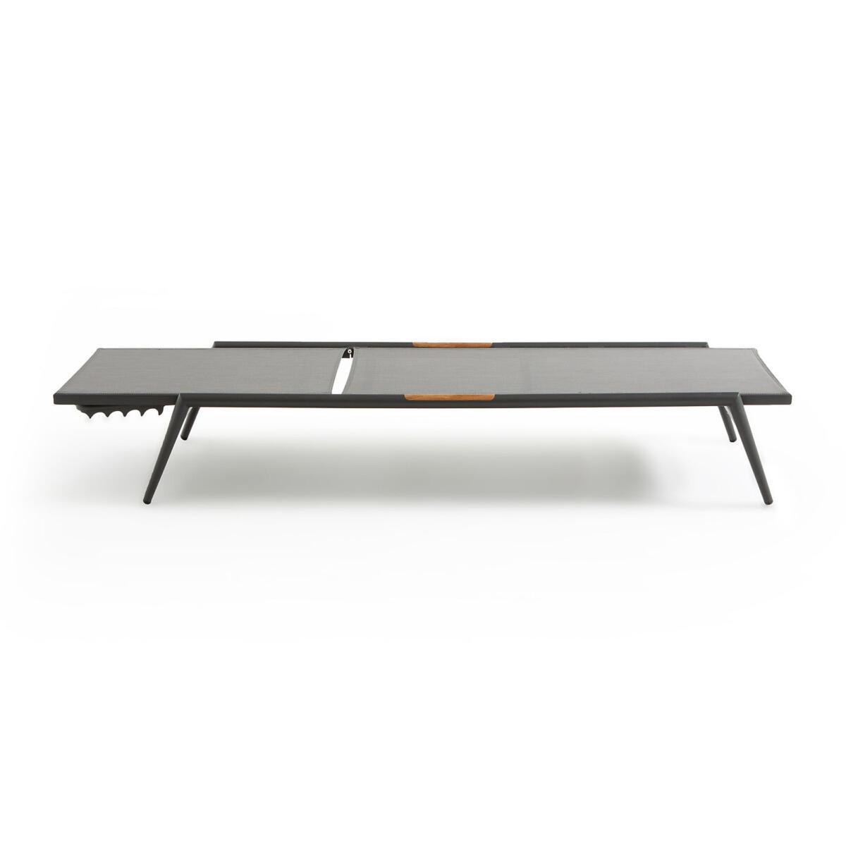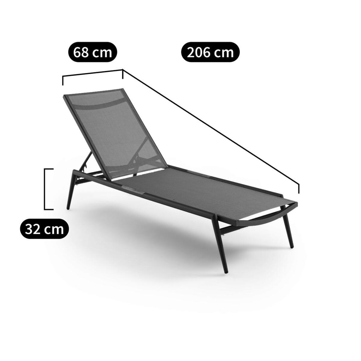 The lightness of an aluminium structure and comfort of a textilene canvas combine in this sun lounger, which is easy to transport from the terrace to the garden to follow the sun. Its adjustable backrest (4 positions) will adapt to all your needs: reading, lazing around, sunbathing... Product Details. Aluminium structure, grey stained epoxy finish. Wood imitation polyresin armrests. Grey tinted polyester canvas. Adjustable back (4 positions). Light, easy to move. Additional information Aluminium has the advantage of not rusting and is also very resistant to abrasion. Dimensions Length : 206cm Height : 32cm Depth : 68cm Delivery Your sun lounger will be delivered by arrangement ! Note! Please check that all access points are large enough to accommodate your delivery (doors, stairs, lifts).Dimensions and weight of parcels. L210 x H40 x D70 cm, 10 kg.