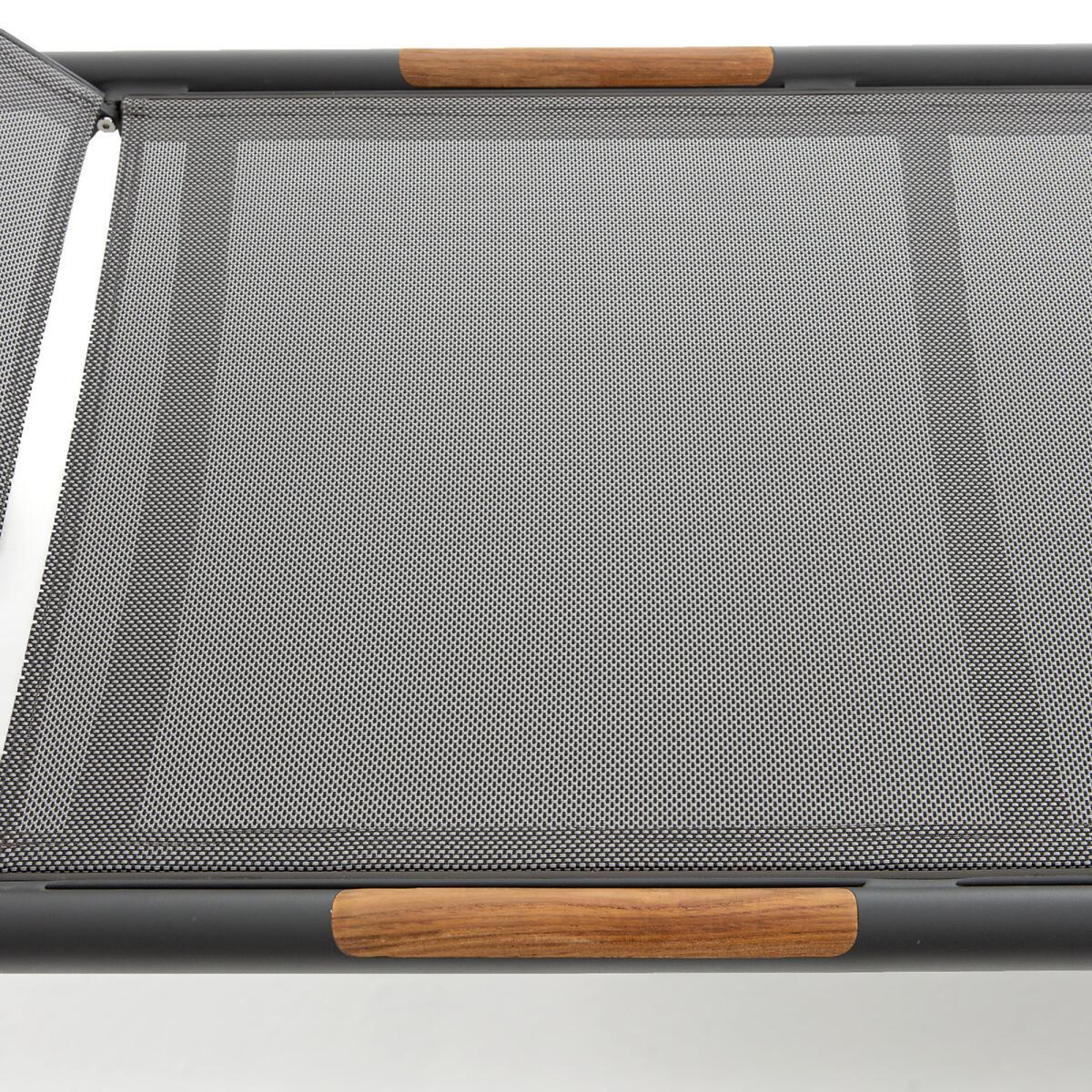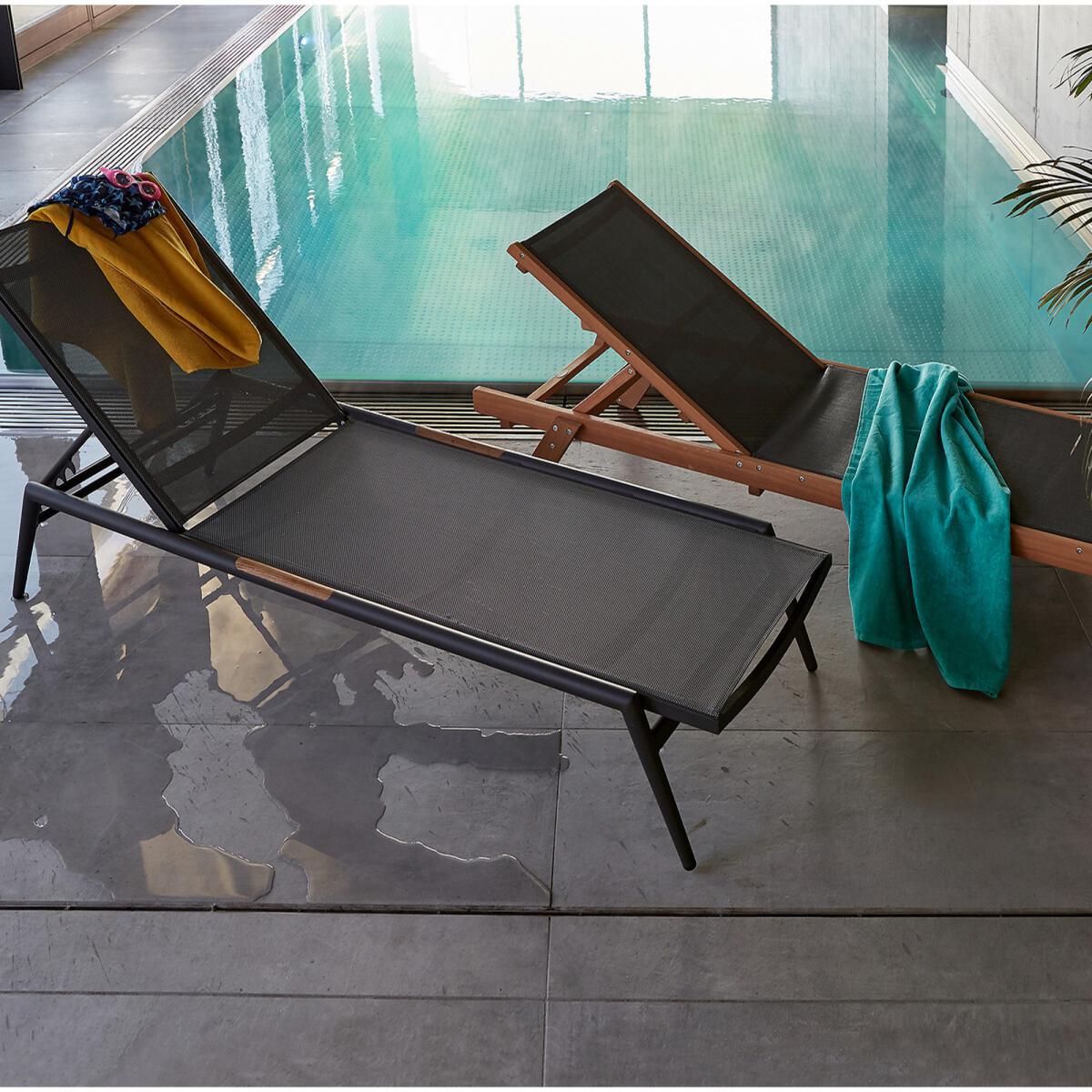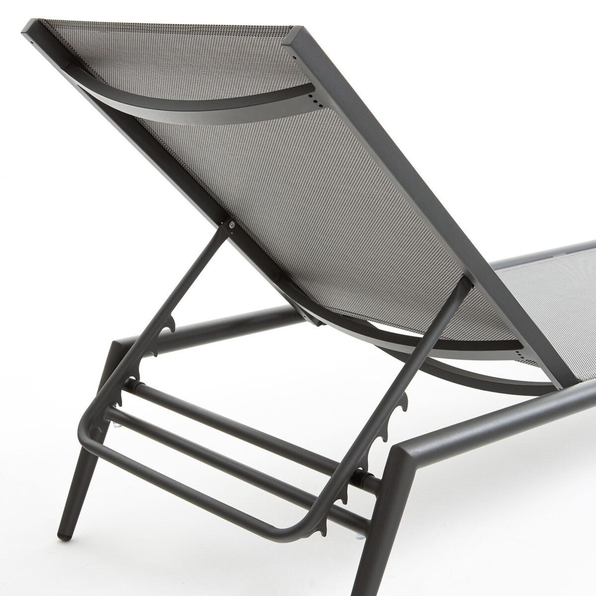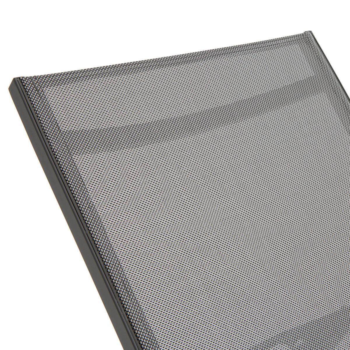 The lightness of an aluminium structure and comfort of a textilene canvas combine in this sun lounger, which is easy to transport from the terrace to the garden to follow the sun. Its adjustable backrest (4 positions) will adapt to all your needs: reading, lazing around, sunbathing... Product Details. Aluminium structure, grey stained epoxy finish. Wood imitation polyresin armrests. Grey tinted polyester canvas. Adjustable back (4 positions). Light, easy to move. Additional information Aluminium has the advantage of not rusting and is also very resistant to abrasion. Dimensions Length : 206cm Height : 32cm Depth : 68cm Delivery Your sun lounger will be delivered by arrangement ! Note! Please check that all access points are large enough to accommodate your delivery (doors, stairs, lifts).Dimensions and weight of parcels. L210 x H40 x D70 cm, 10 kg.