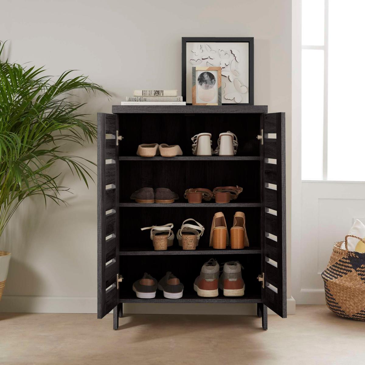 I love this shoe storage unit for its clean, slatted design and sleek black finish, making it a versatile addition to many interiors. It's especially effective in contemporary or industrial-style spaces, but can also add a modern touch to more traditional settings. Practical styling tips include pairing it with neutral or textured accessories to highlight its simplicity, and place it near your entryway or mudroom for functional organisation. To keep the look cohesive, consider adding a few decorative trays or baskets on top for keys or accessories, creating an attractive yet practical storage corner.