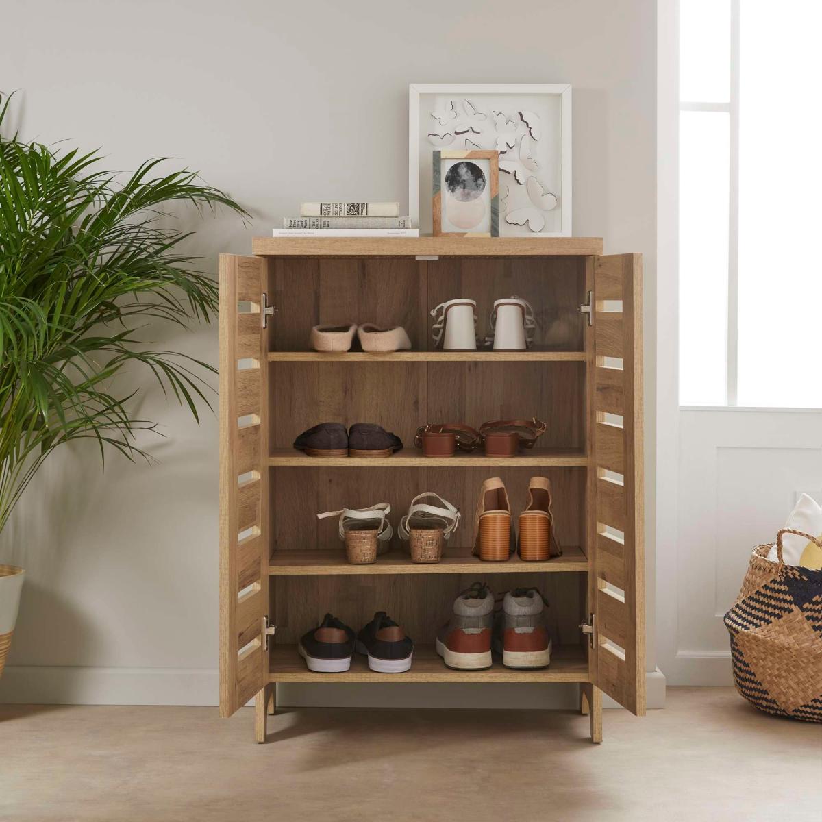 I love this shoe storage unit for its simple yet functional design, which works particularly well in Scandinavian or minimalist interiors thanks to its light oak finish and clean lines. It’s perfect for creating an organised entryway or hallway without compromising on style. Practical tips include pairing it with a matching mirror or small bench for a cohesive look, and placing baskets or trays on top to catch keys and accessories. Its open slats also allow for easy ventilation, helping shoes stay fresh, and the neutral finish makes it versatile enough to blend seamlessly into a variety of colour schemes.