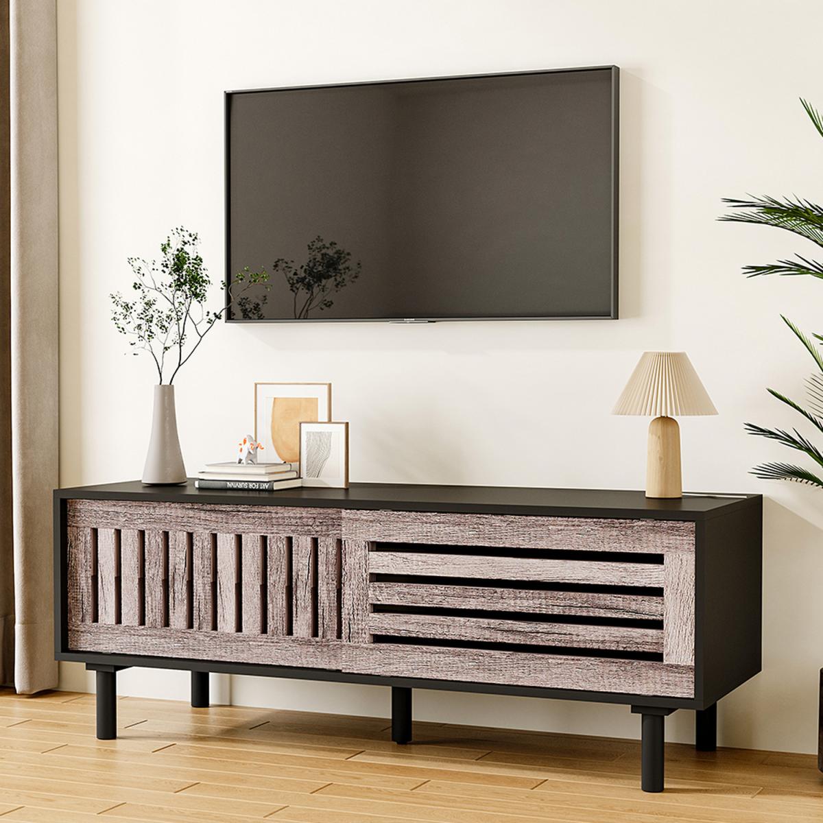 Elevate your living space with this chic TV stand. Measuring 120cm in length, it offers a sleek platform for your TV and media equipment. The innovative slatted door design brings a modern touch to this classic piece, allowing you to easily showcase or conceal your devices. With a sophisticated black and brown color palette, this stand effortlessly blends into various decor styles, making it a versatile and stylish choice for your home.